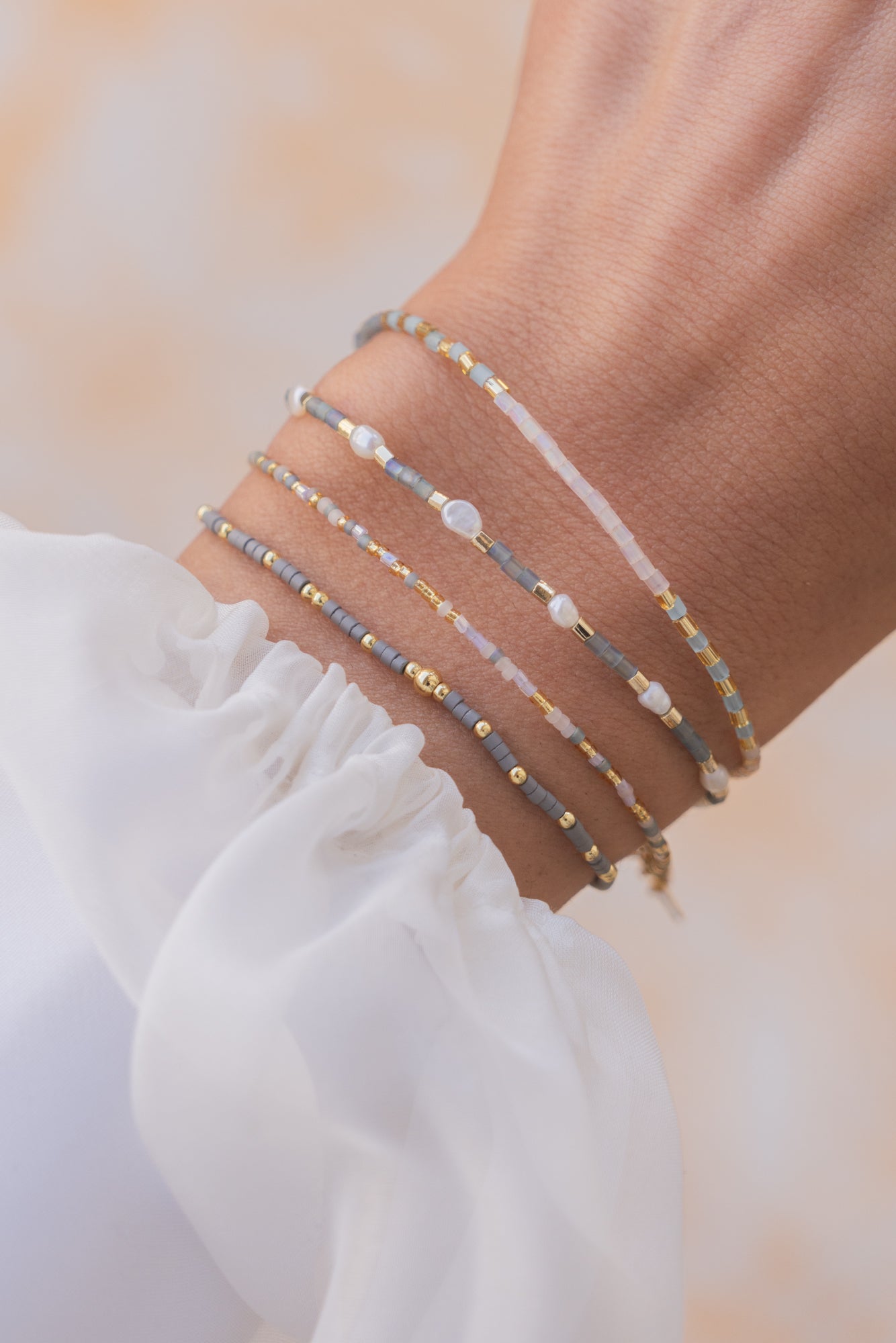 Das Be Blush Armband ist ein Musthave für alle die nie genug Armbändchen haben können. Es besteht aus winzig kleinen Glasperlen und wird mit einem Karabiner verschlossen. Für den Mix in Blush Grey haben wir Perlen in Frosted Grey, Lush Ivory, Soft Lilac und Gold bunt gemischt. Am Handgelenk wirkt der wilde Mix wie eine sanfte Sinfonie aus Pastelltönen.