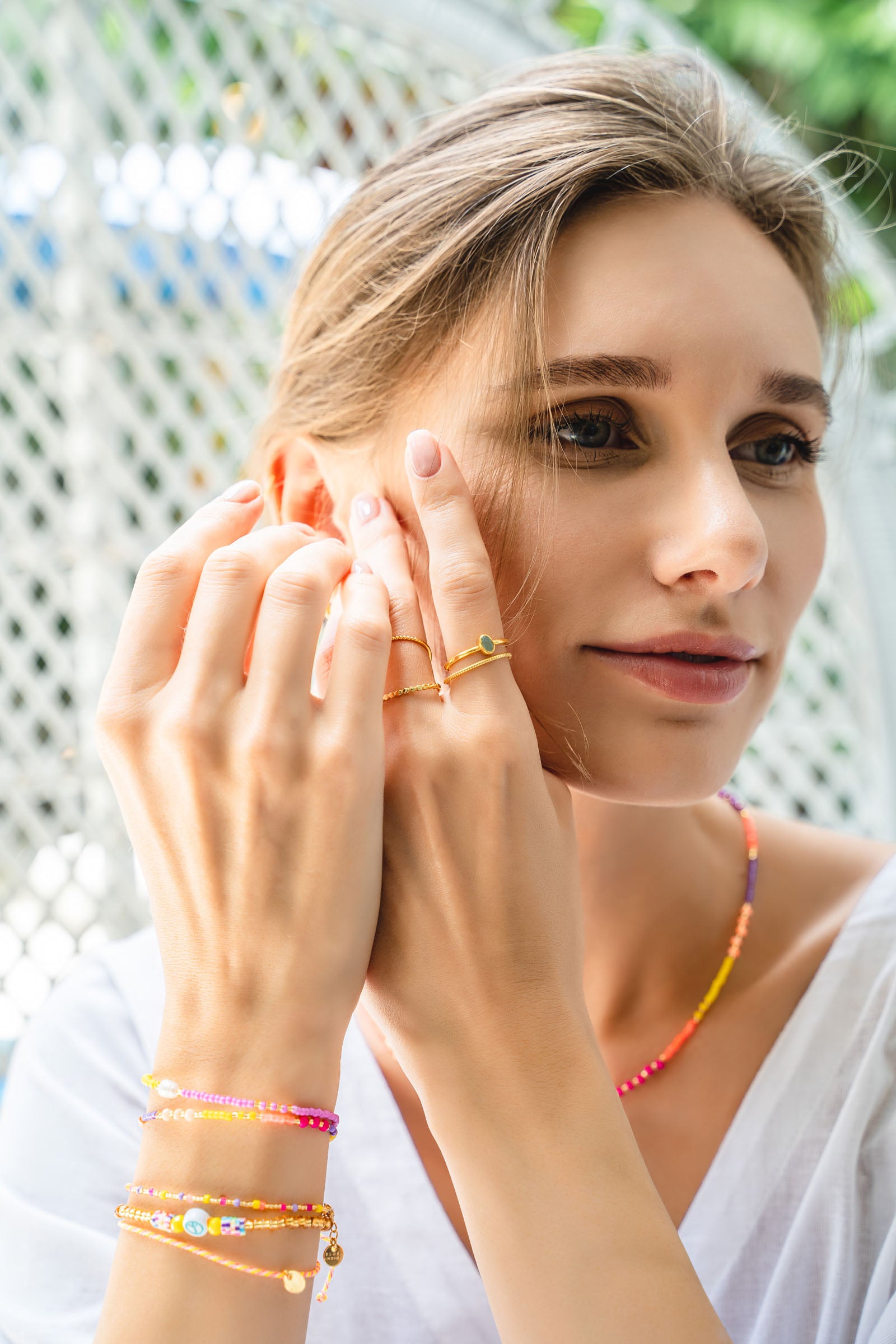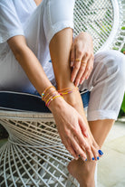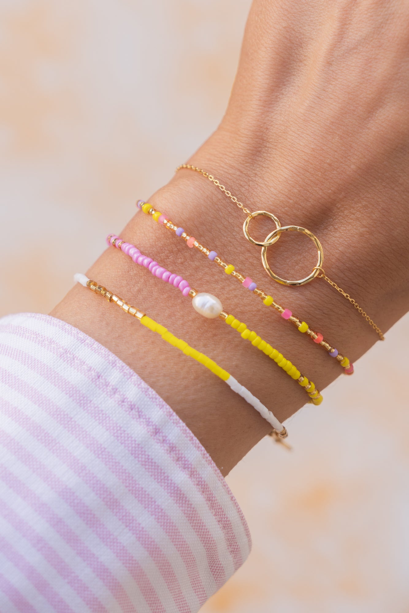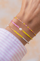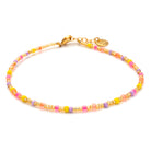 The wild child of Greece! Die Farben unseres Crete-Bändchens strahlen in intensiven Neon-Tönen aus Coral, Gelb und Flieder. Wild gemixt und mit goldenen Perlen versetzt. Die Crete-Serie umfasst weitere Armbändchen, Fußkettchen und eine Halskette.