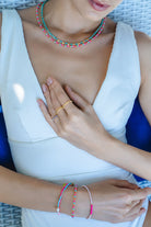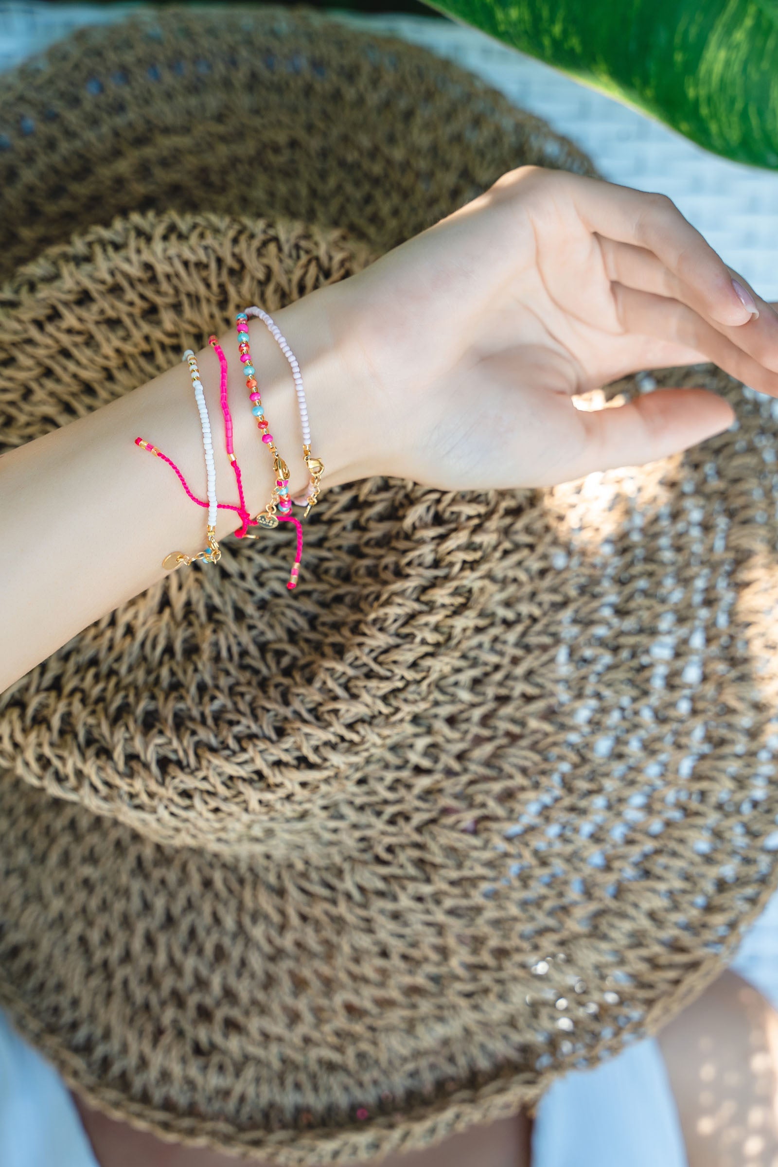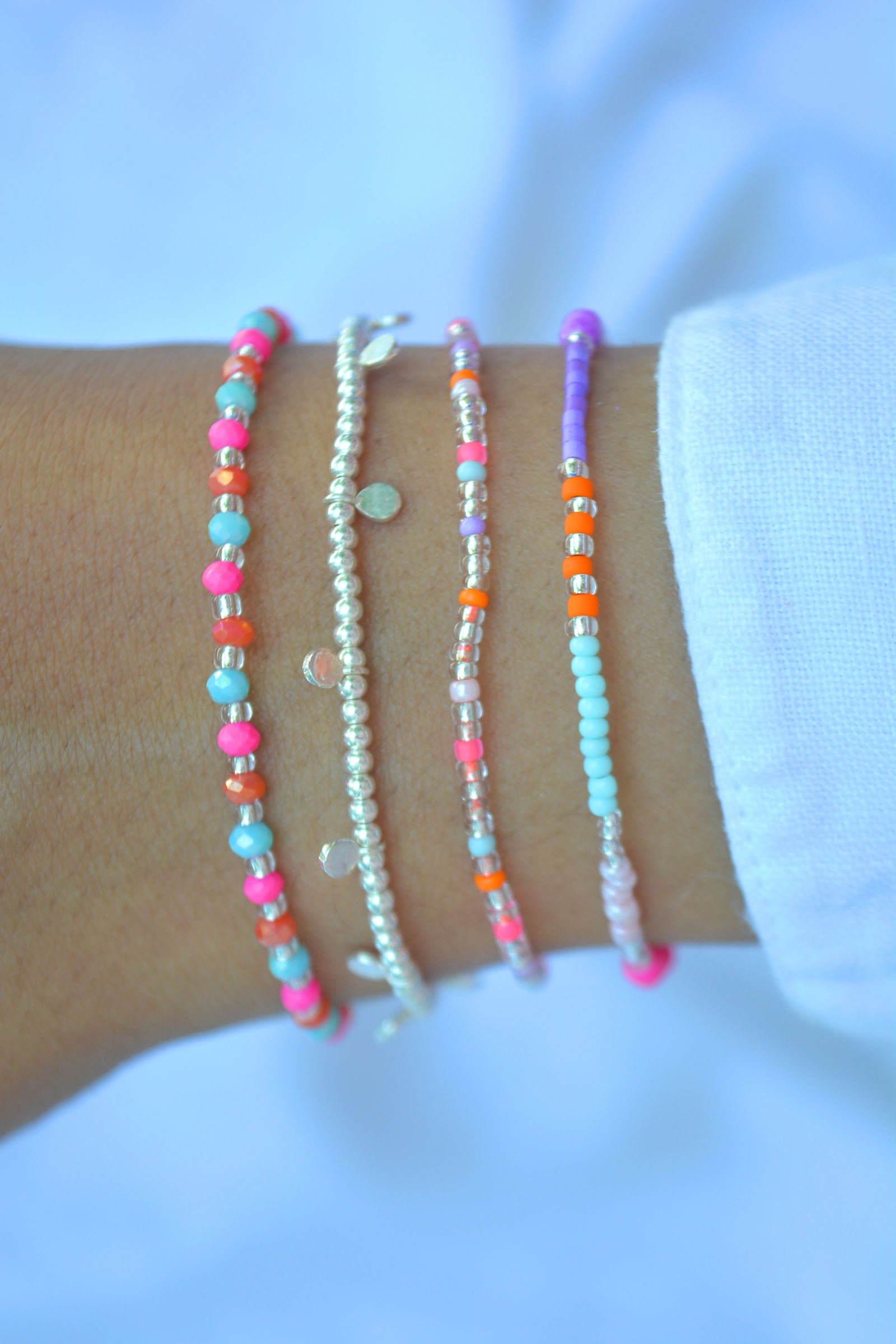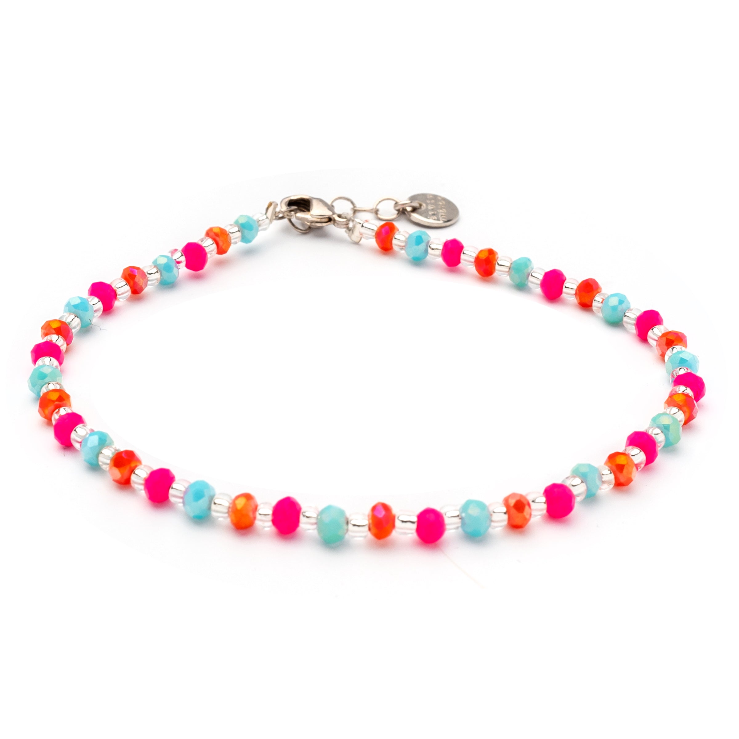 Mit unserem Armband Sunset geht die Sonne auf! Zahlreiche Glassteine leuchten in den Farben Pink, Orange und Türkis am Handgelenk im Wechsel mit kleineren silbernen Glasperlen. In unserer Gemma-Serie findest du die passende Halskette und weitere Armbändchen in Gold und Silber.