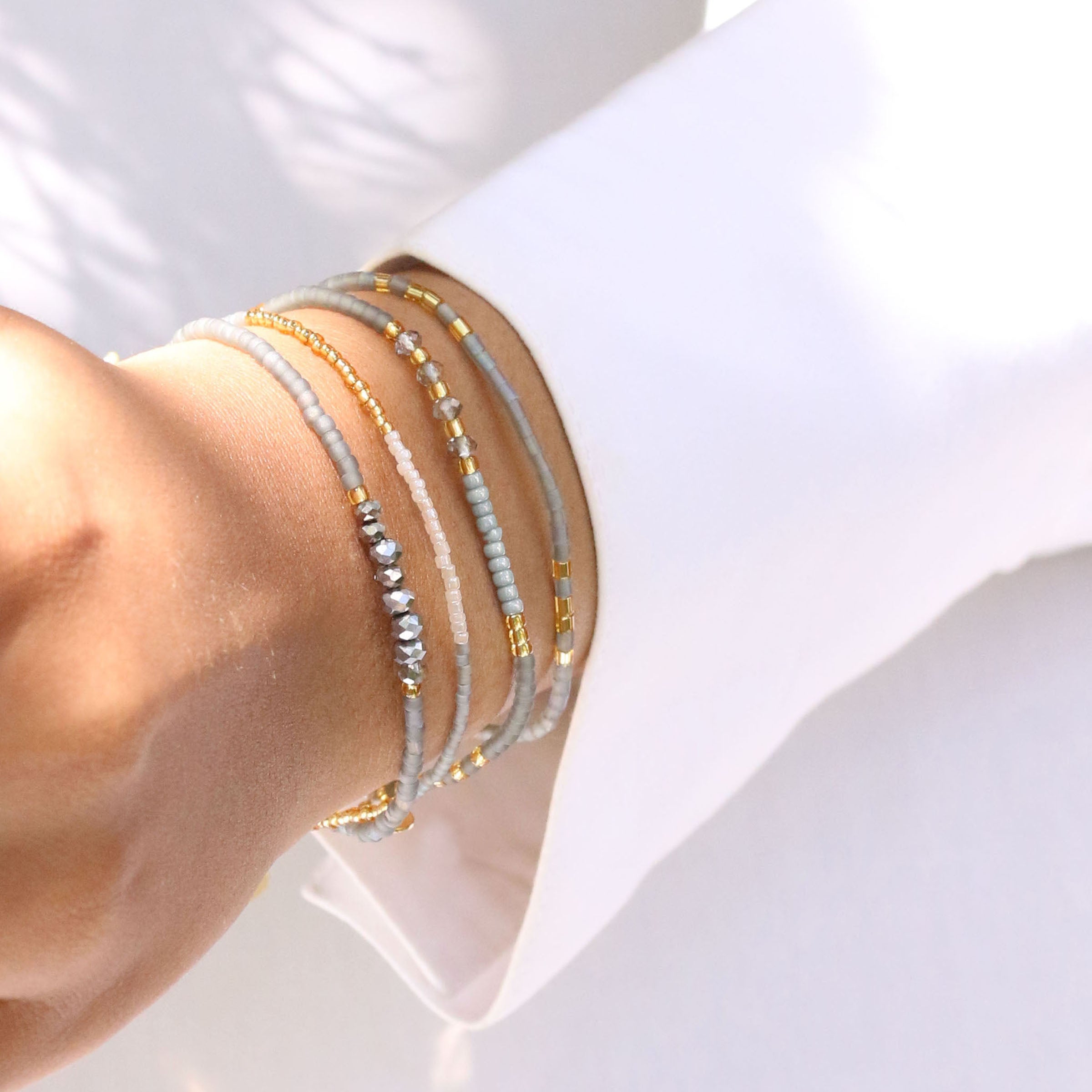 Das Armband-Quartett Crystal Grey setzt elegante Akzente am Handgelenk. Matte und glänzende Perlen in verschiedenen Grau-Nuancen verleihen dem Armband-Set dezente Raffinesse. Vereinzelt setzen graue Kristallperlen funkelnde Highlights.