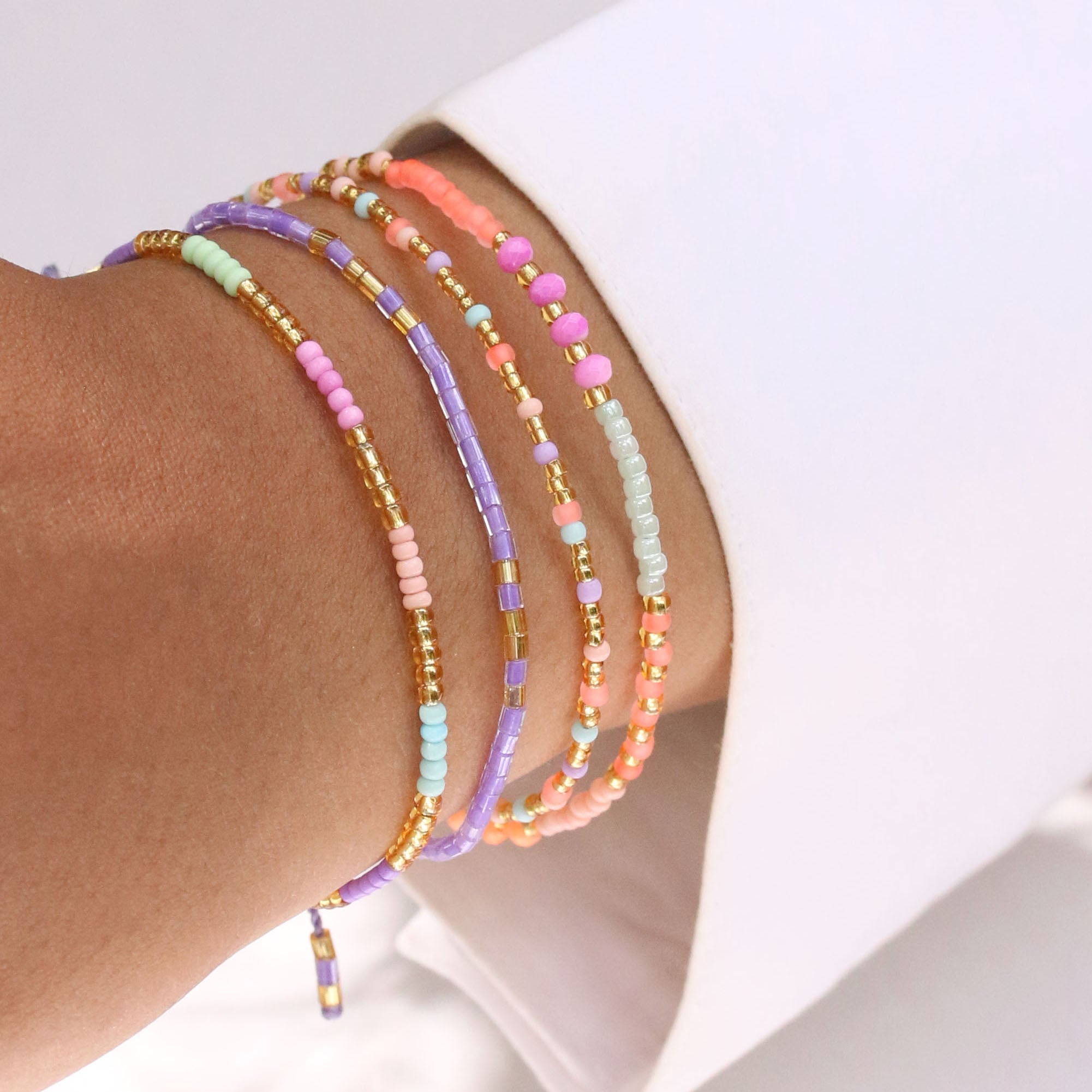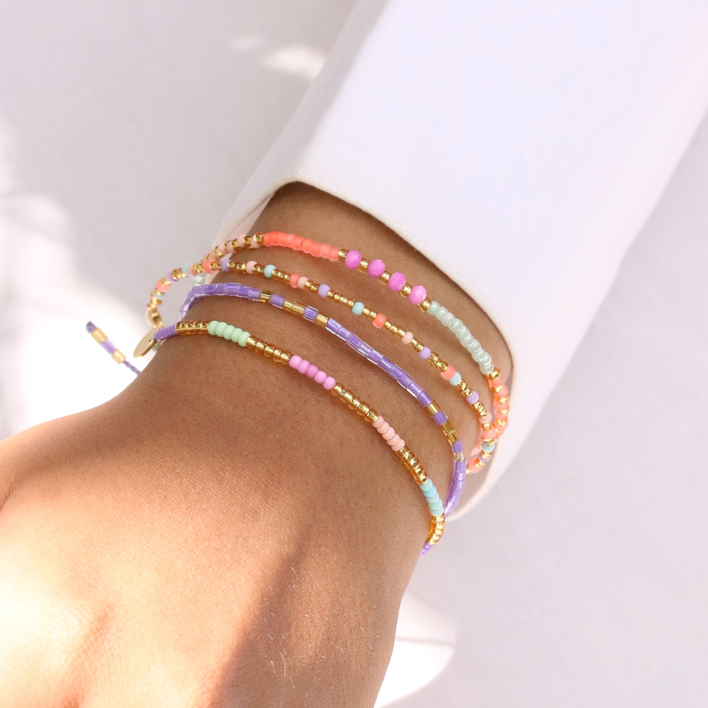 Die Farben unseres Armband-Sets Rhodos strahlen in soften Neon-Tönen um die Wette. Neben Mintgrün und Flieder setzen matte Glaskristalle in Lila und Neon-Coral elegante Akzente.