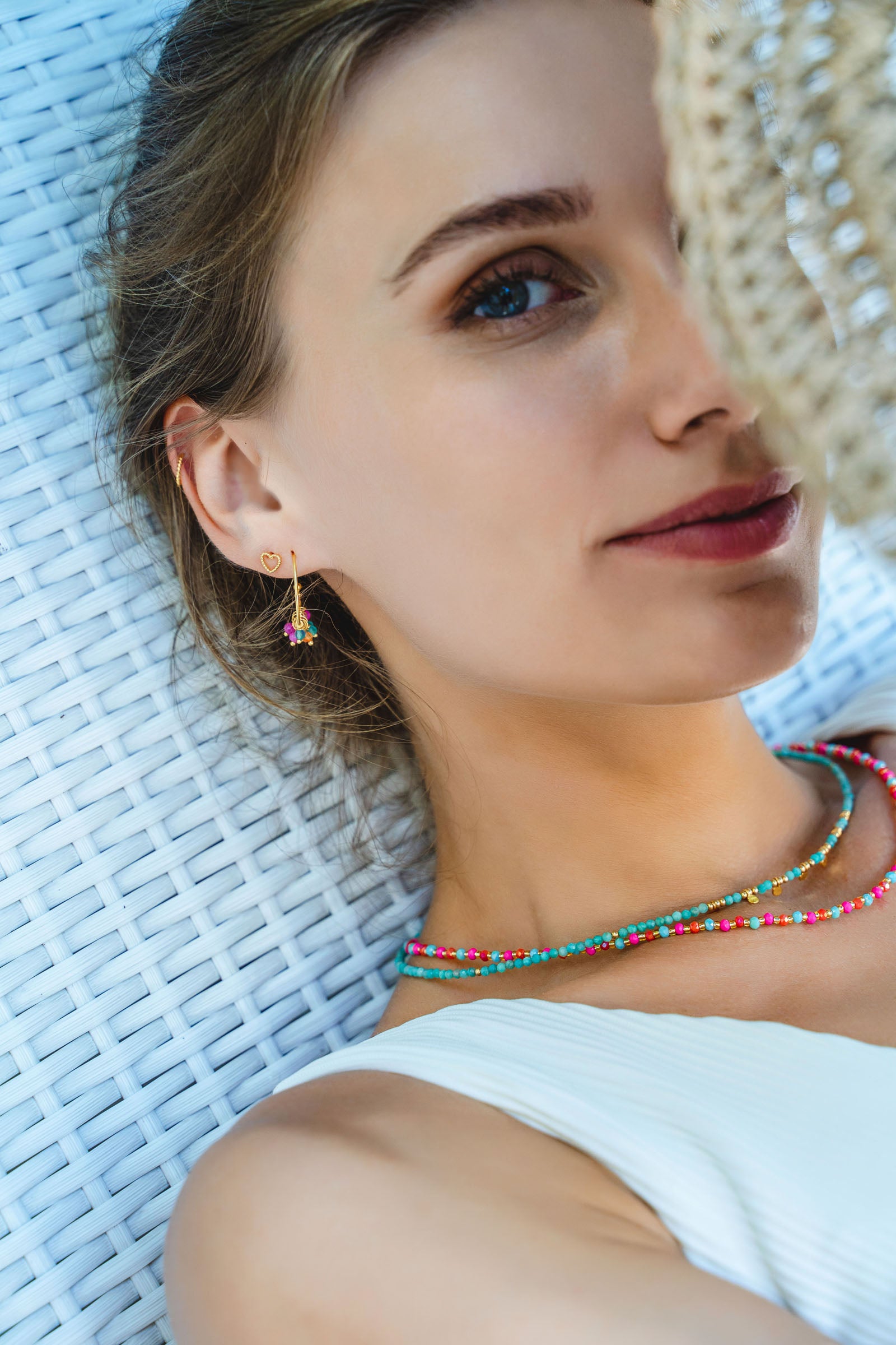 An unserem Model Lana strahlt die Kette mit türkisblauen Amazonit-Steinen und ist ebenfalls bald in unserem Sortiment erhältlich.