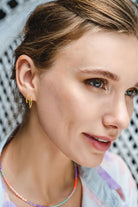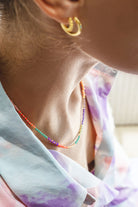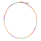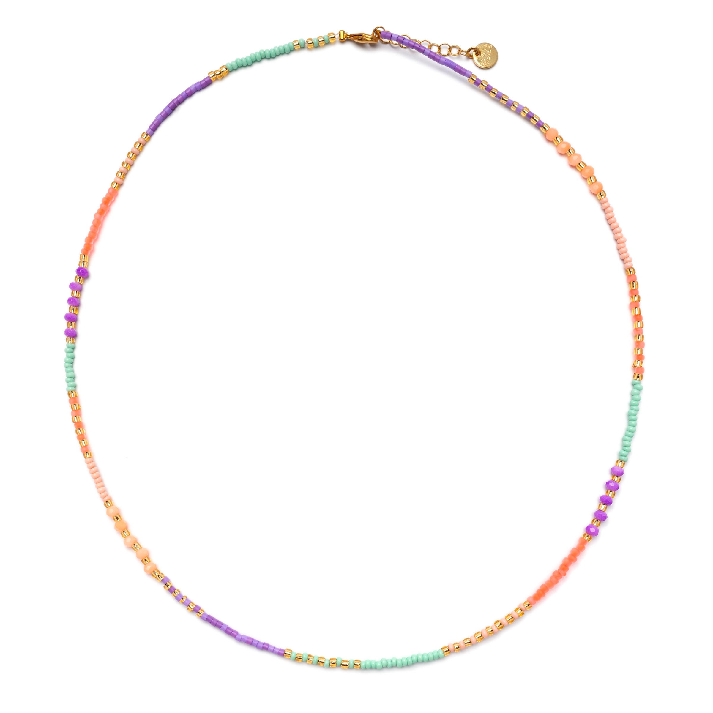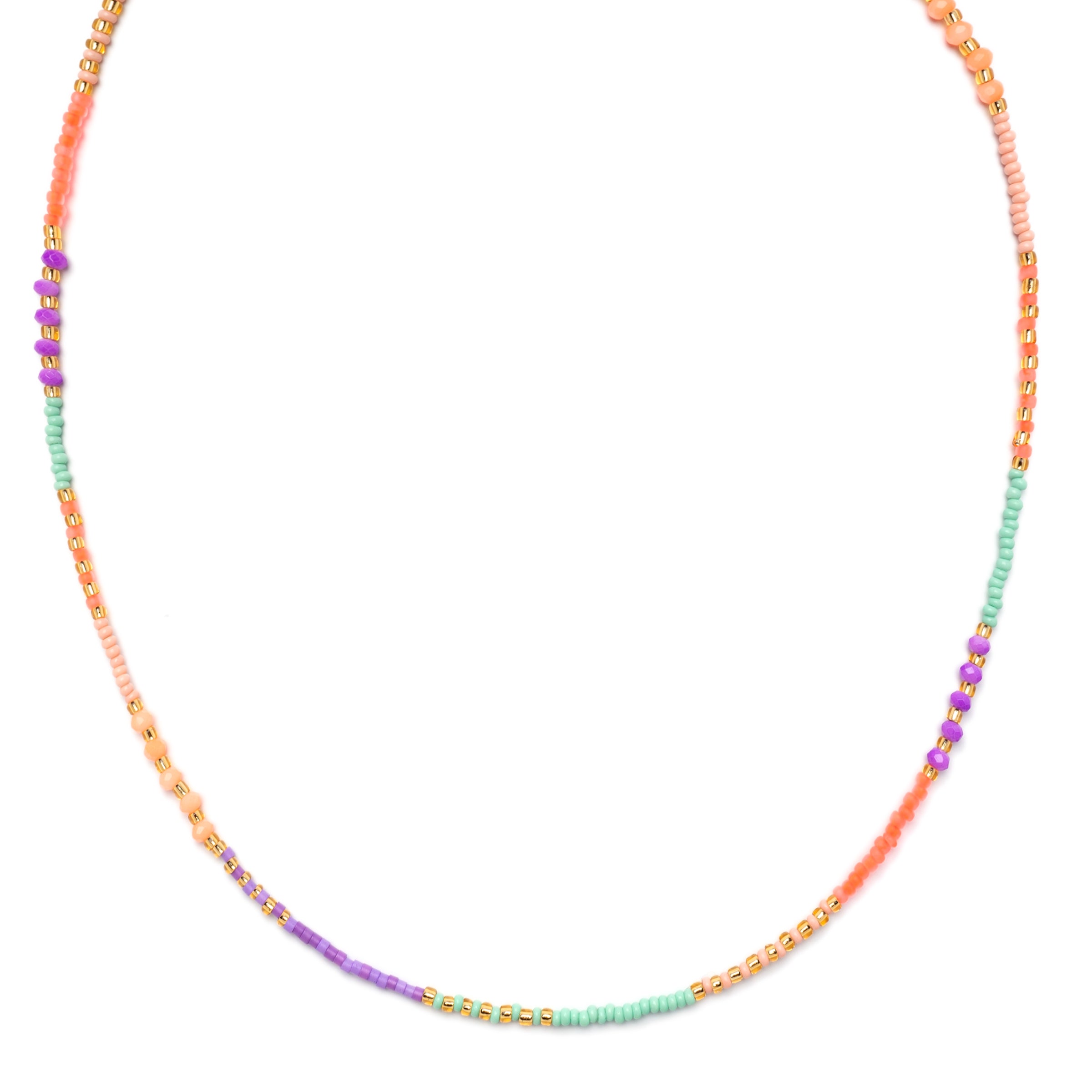 Die Farben unserer Halskette Rhodos strahlen in soften Neon-Tönen um die Wette. Neben Coral, Mintgrün und Flieder setzen matte Glaskristalle in Lila und Neon-Coral elegante Akzente.