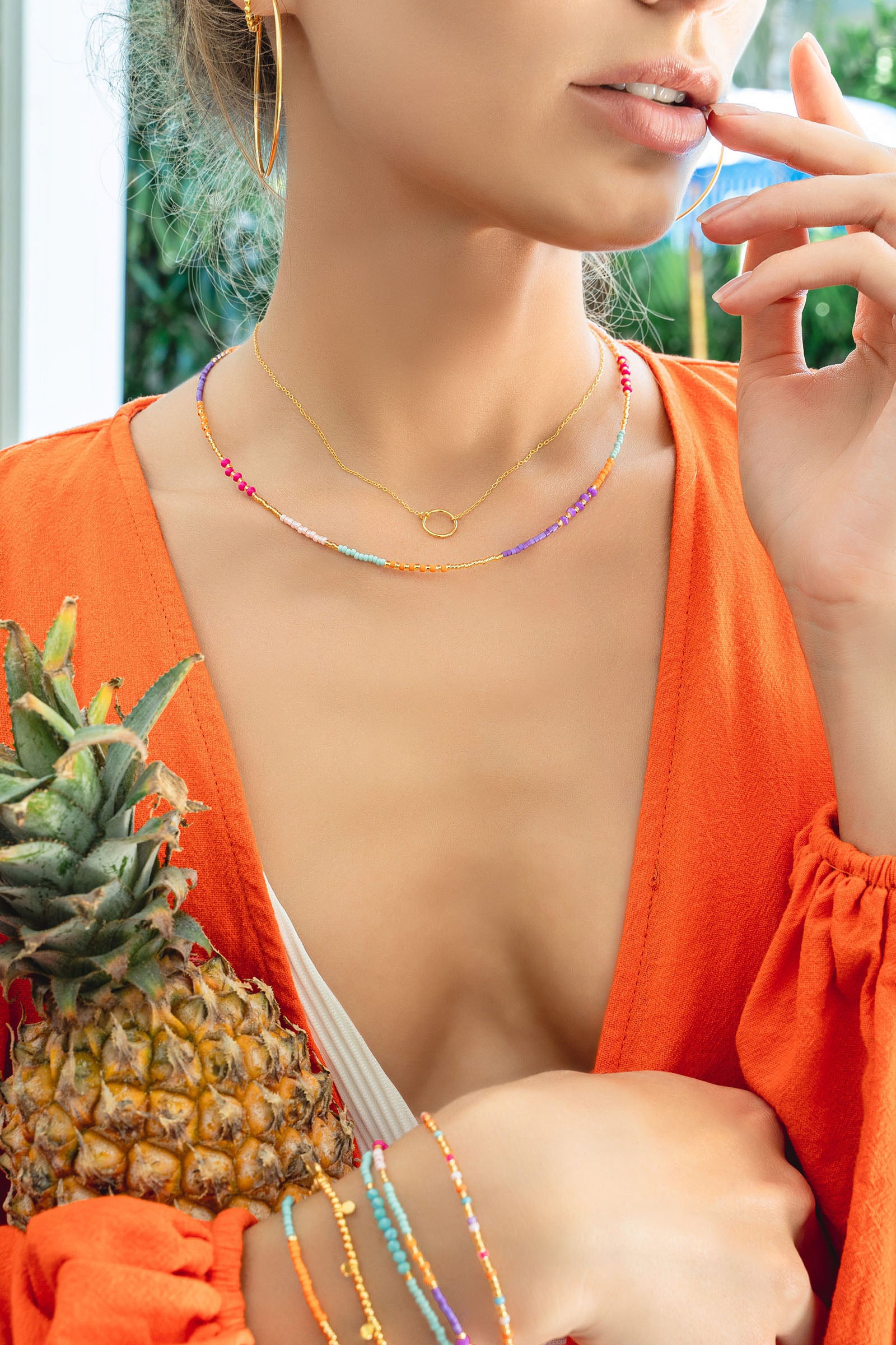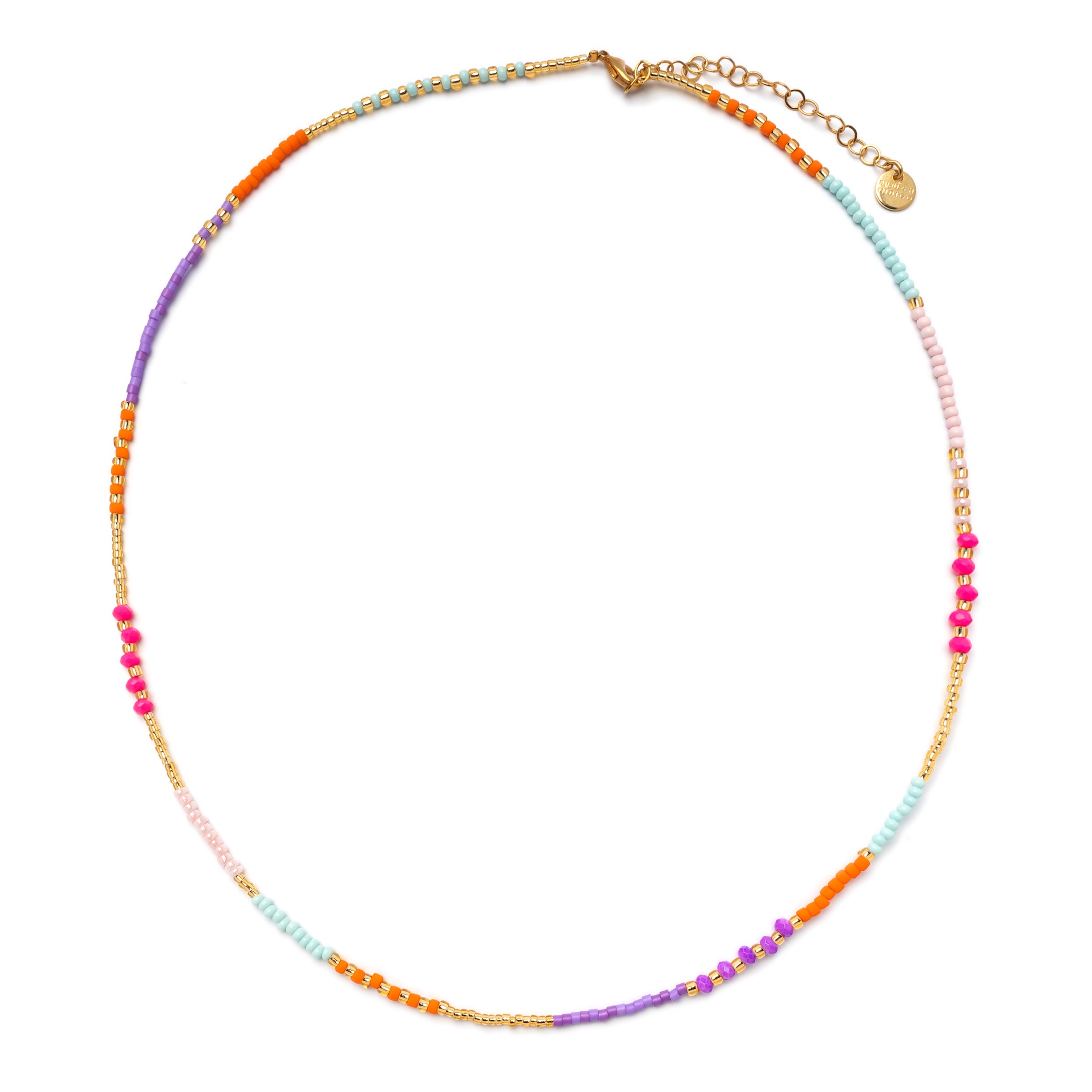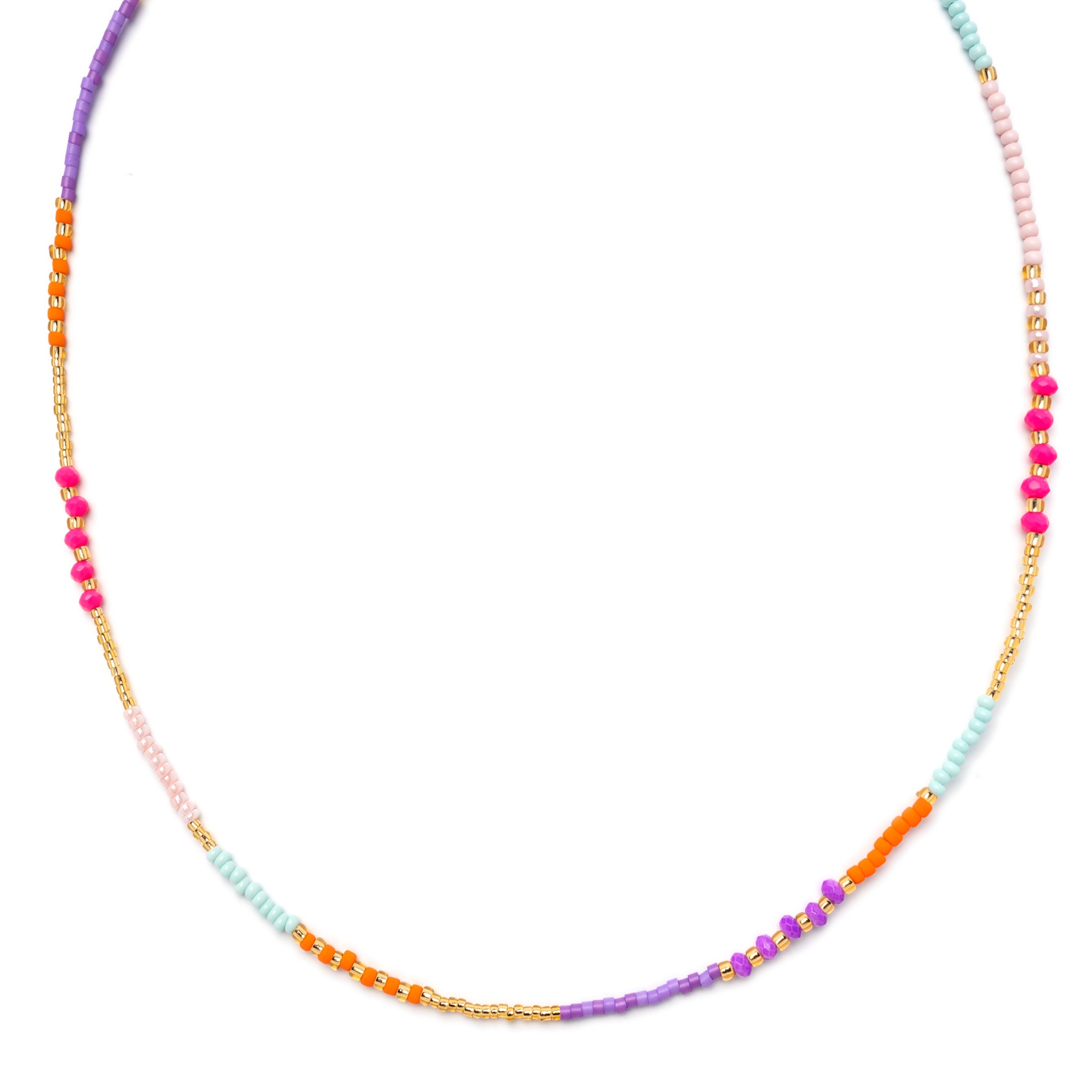 Santorini gilt vielen als die schönste und farbenprächtigste griechische Insel. Nicht weniger prächtig in Farbe ist unsere Halskette Santorini mit matten Rocailles Perlen in Mintgrün, Flieder und Orange. Ein visuelles Highlight sind die facettierten Glaskristalle in Neon-Pink und Violett.