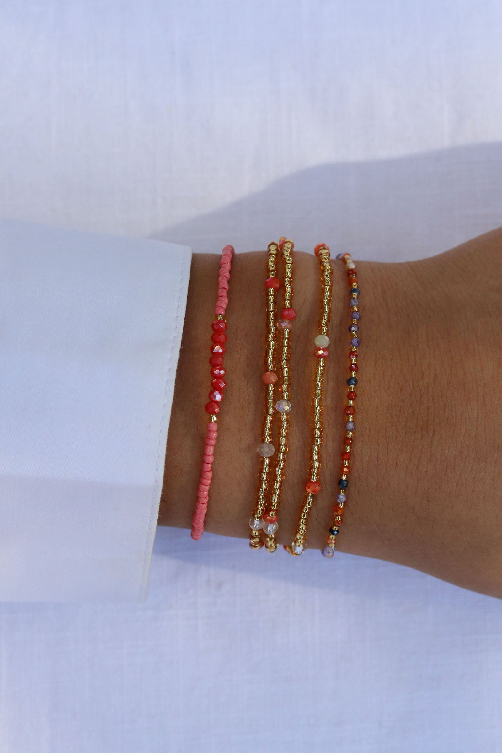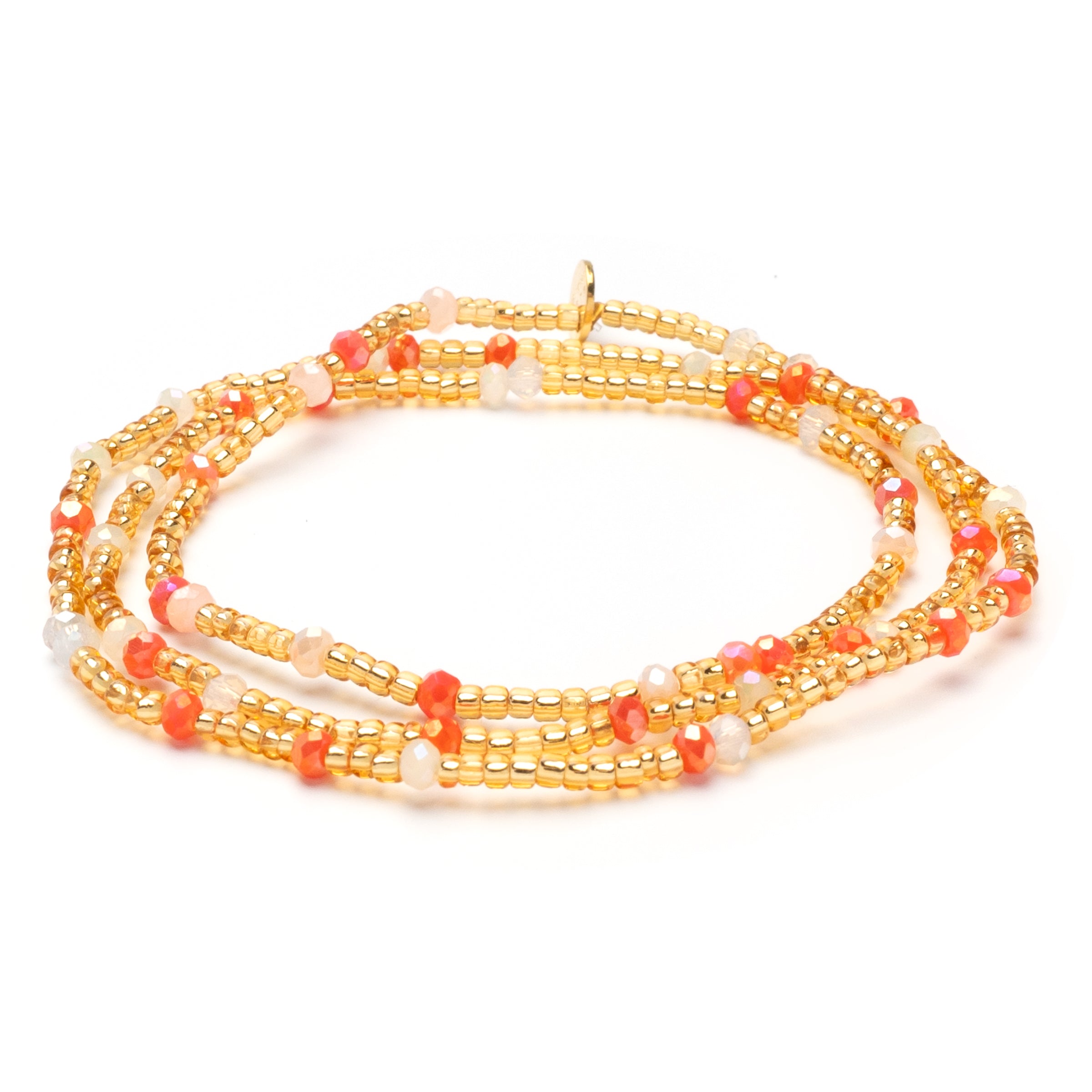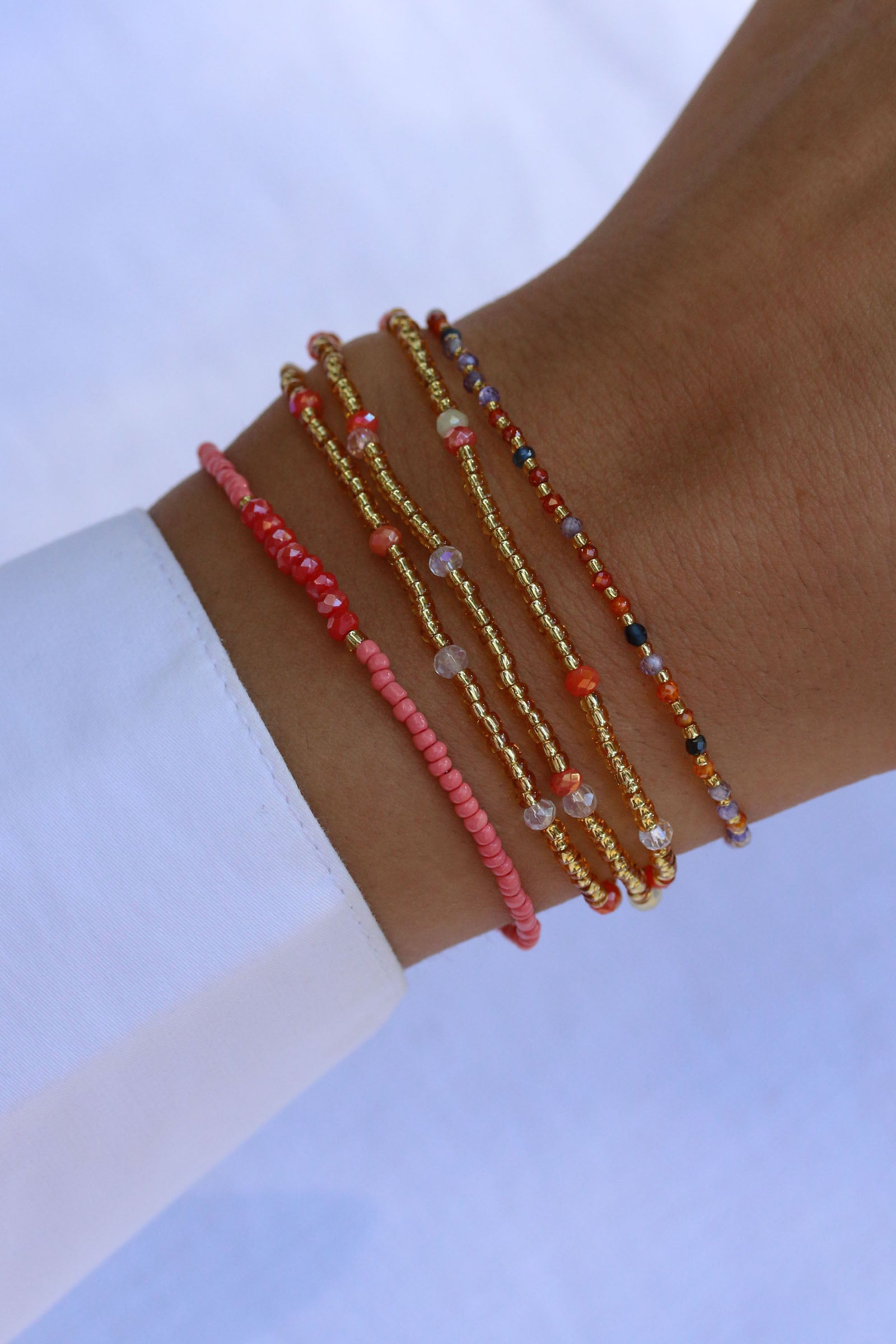 Die Tiara Kette in Coral Crystal ist ein wahres Multitalent, denn sie ist Halskette und Armband in einem Schmuckstück. Goldene Perlen und facettierte Kristallperlen in unterschiedlichen Blush- und Koralltönen wechseln sich auf dem elastischen Nylonband ab.