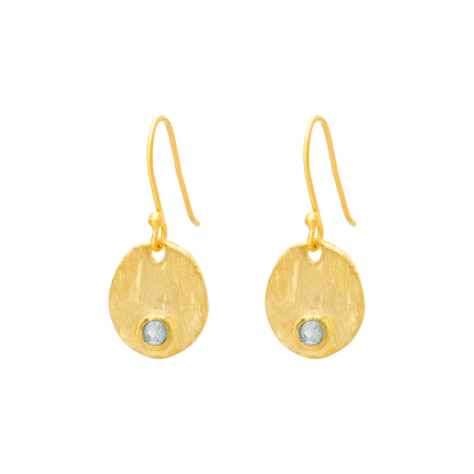 Ein zart eingefasster 2 mm Aquamarin bildet den Mittelpunkt der Ohrringe und steht für Klarheit, Ruhe und innere Balance. Der Edelstein funkelt in einem strahlenden Hellblau.