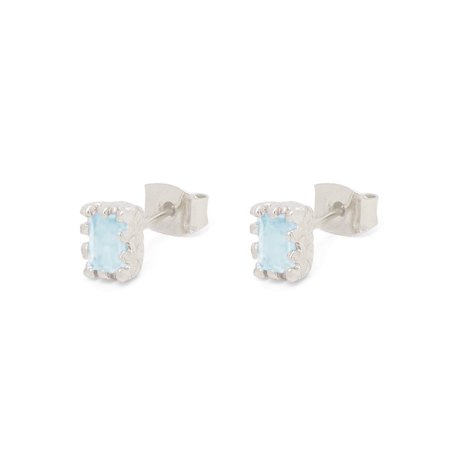 Unsere silbernen Ohrstecker Alea überzeugen mit einem filigranen, zeitlos eleganten Design. Im Mittelpunkt steht ein rechteckig geschliffener Jade-Stein in zartem Hellblau, der von einer feinen Krappenfassung in matter Brushed-Optik gehalten wird. Die reduzierte Fassung unterstreicht die natürliche Schönheit des Edelsteins.