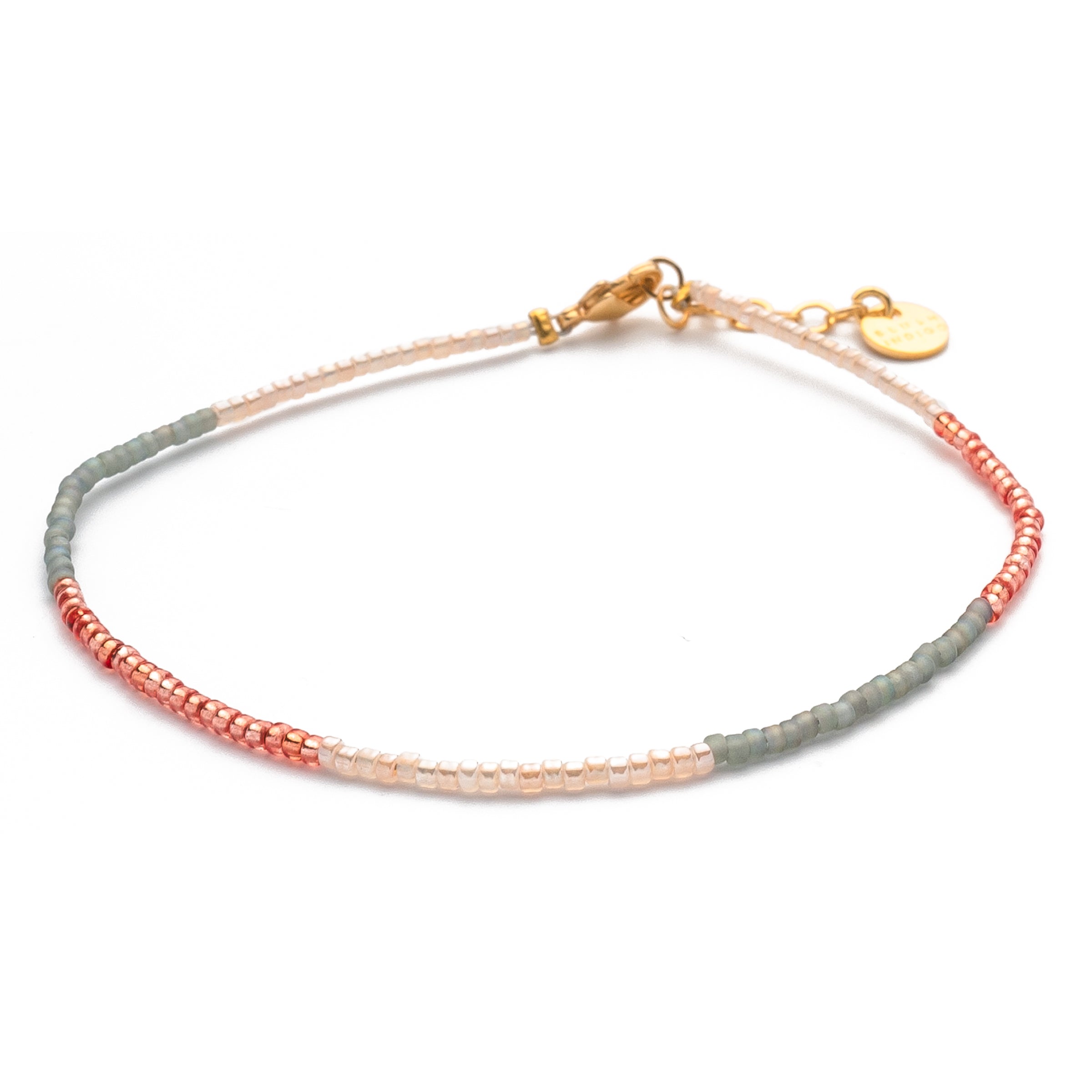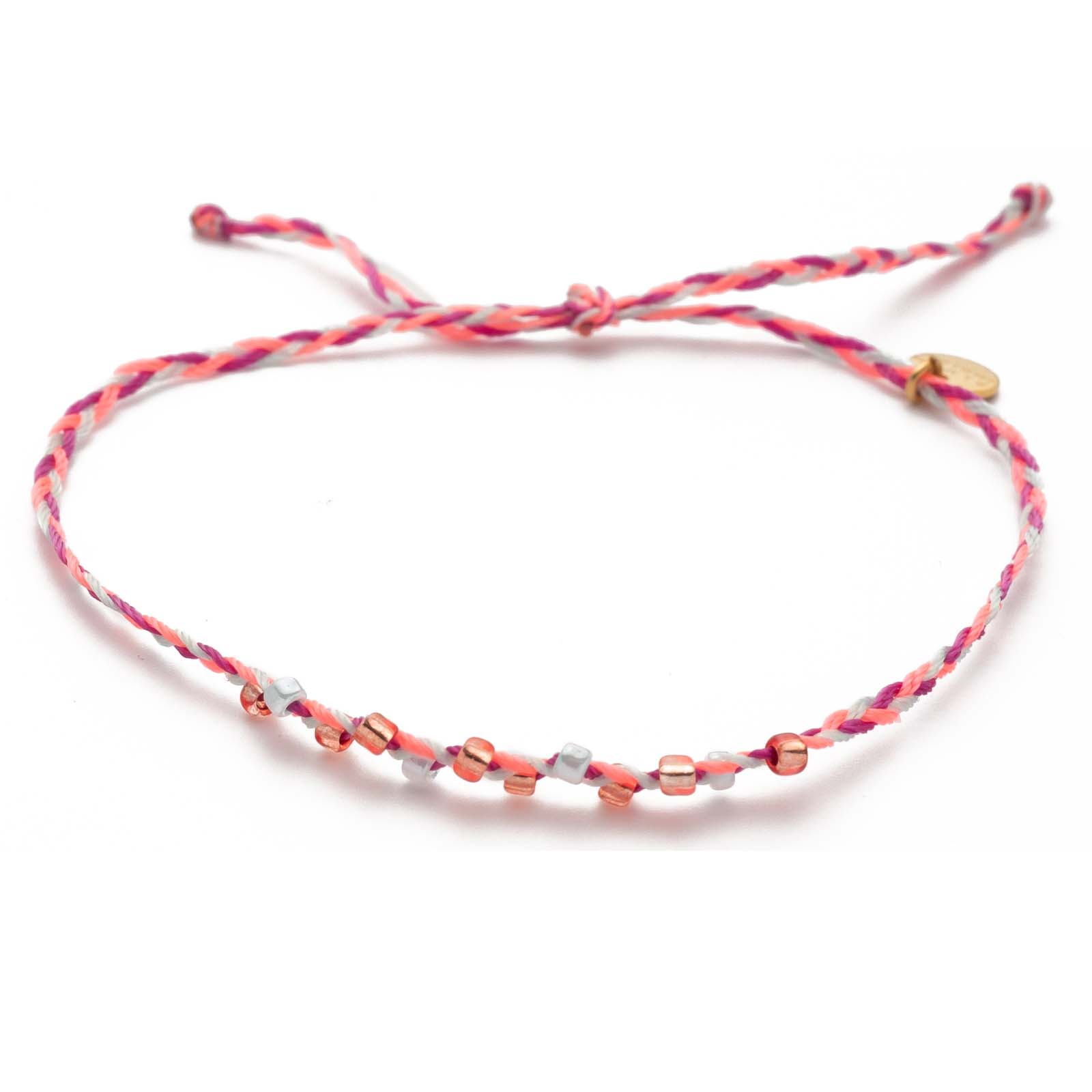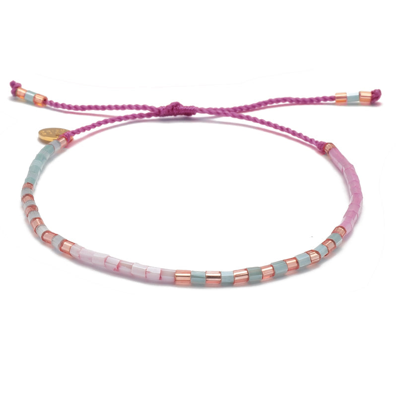 Willkommen an der Coppercabana! Perlen in Frosted Grey, Blush Rose, Fresh Mint und Roségold harmonieren hervorragend miteinander. Das gezwirbelte True Temple Armband in den Farben Coral, Lilac und Light Blue bringt gleich dreifach Farbe an dein Handgelenk. Es ist inspiriert vom traditionellen Tridatu-Armband, welches jeder gläubige Hindu auf Bali trägt. Es besteht aus drei ineinander gedrehten Stoffbändchen – traditionell in den Farben Rot, Schwarz und Weiß für die Götter Brahma, Vishnu und Shiva – und soll dich beschützen.