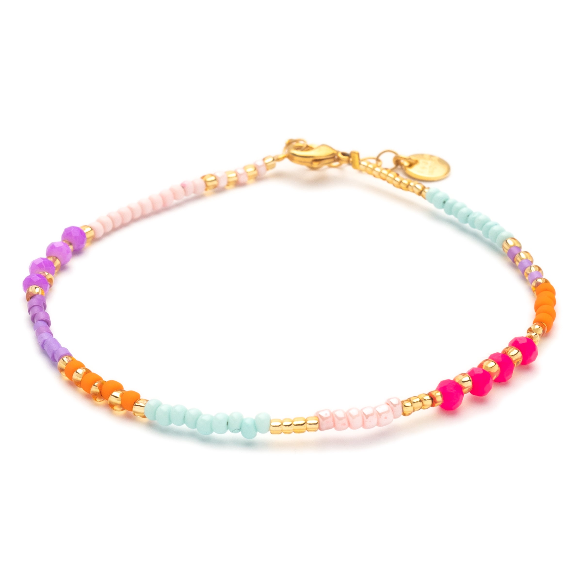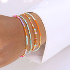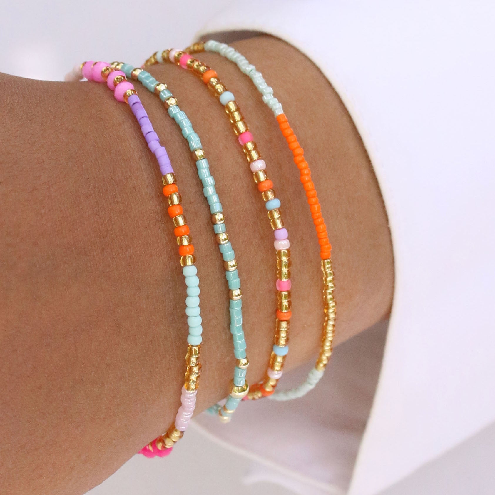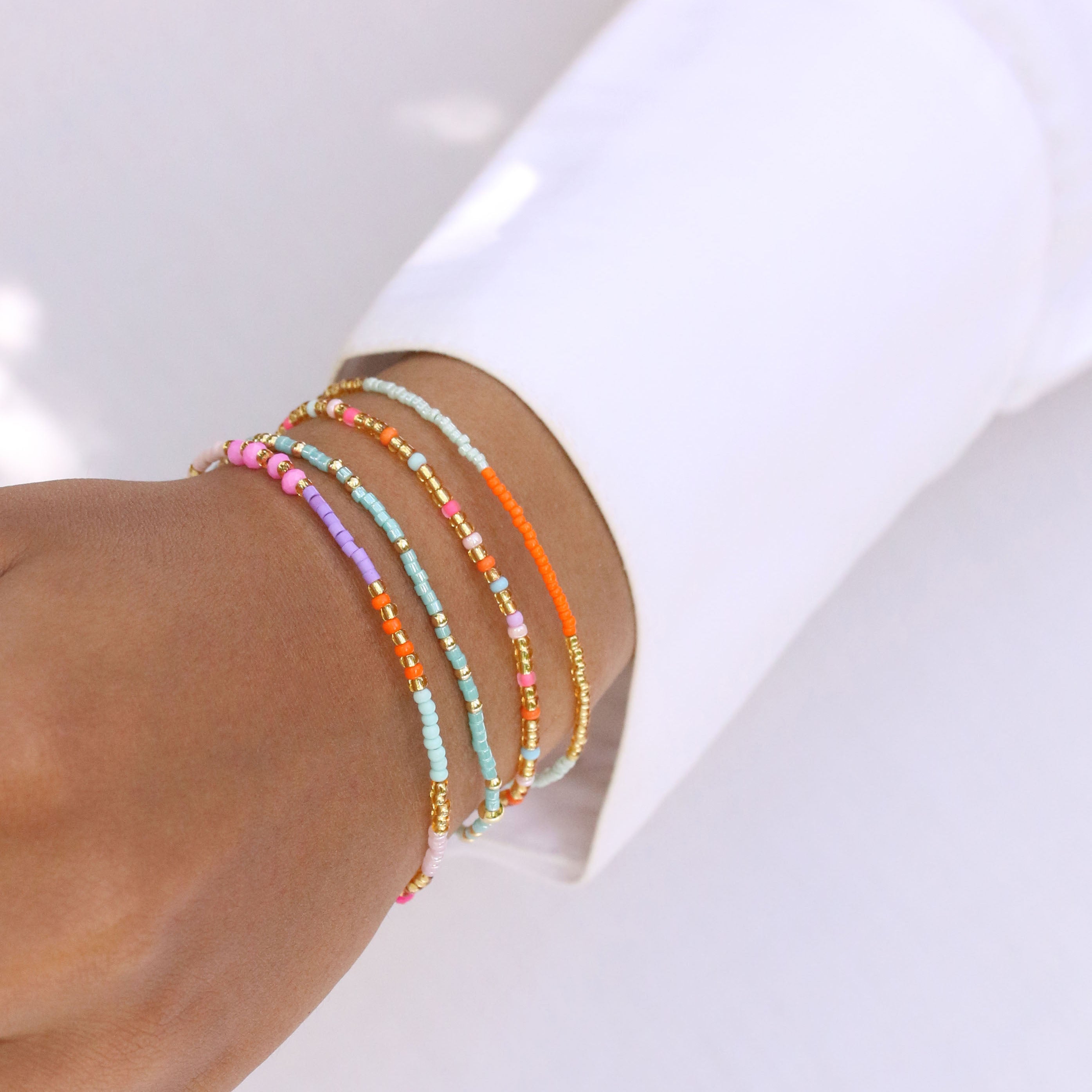Sommer, Sonne, Santorini! Dieses leuchtende Armband-Quartett bringt mediterrane Urlaubsstimmung direkt an dein Handgelenk. Neon Pink, Mintgrün, Violett und Orange vereinen sich zu einem farbenfrohen Spektakel – so lebendig wie ein Sonnenuntergang über den weißen Dächern von Santorini. Feine goldene Perlen setzen edle Akzente und sorgen für das gewisse Strahlen.