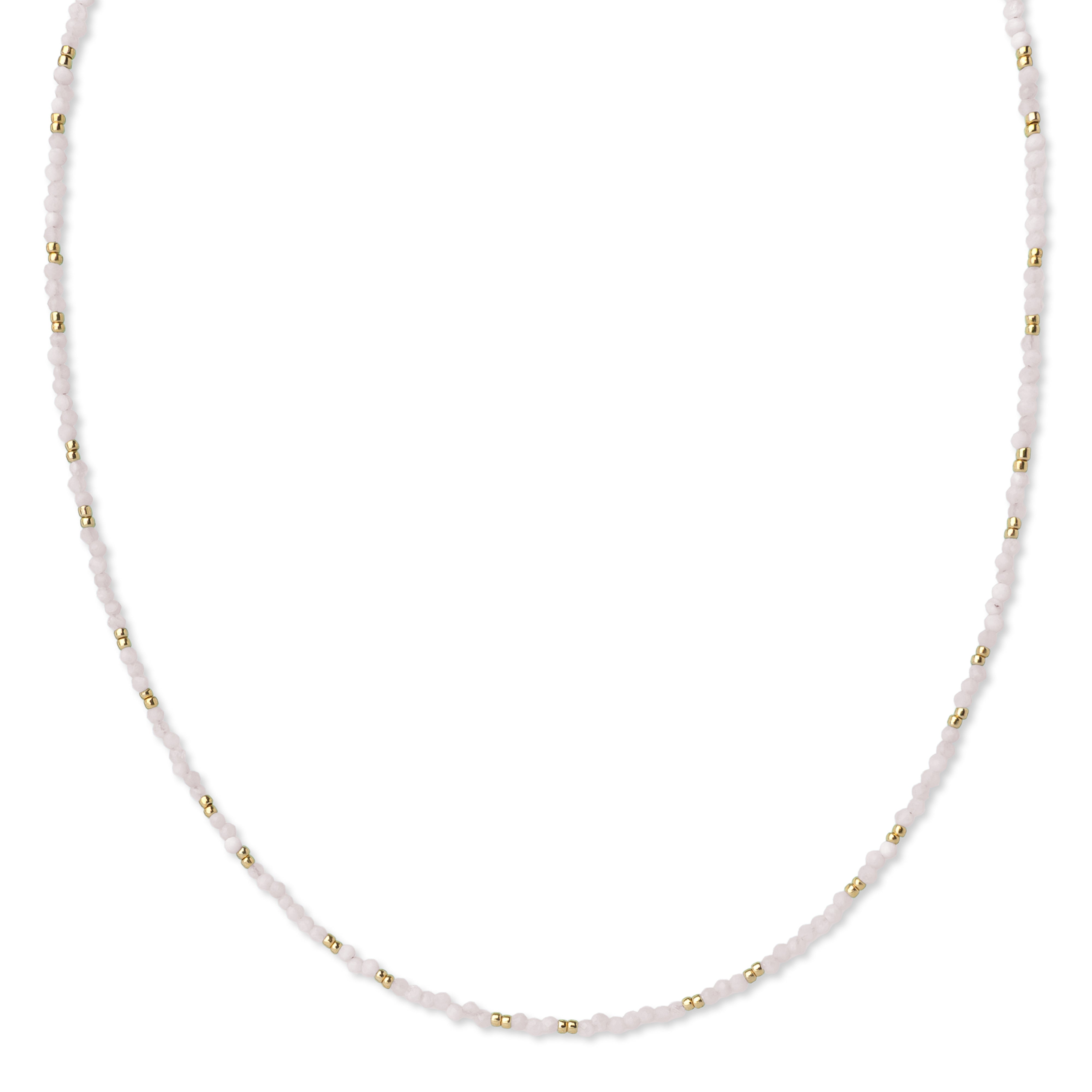 Zarte blassrosa Rosenquarze verleihen der Kette Gemma eine magische Ausstrahlung. Feine Goldperlen fangen das Licht ein und unterstreichen ihren edlen Glanz.