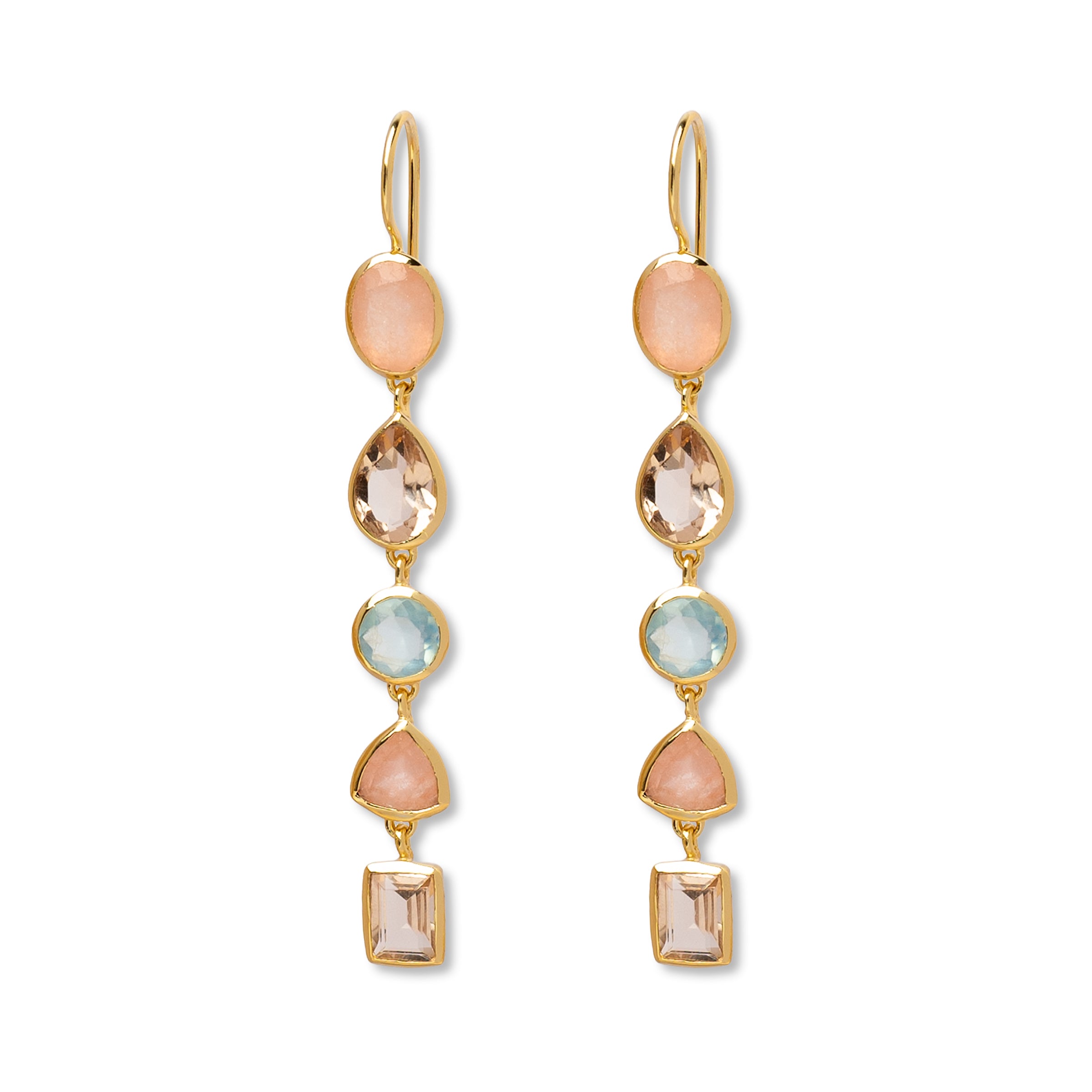Die goldenen Ohrhänger Camille sind ein ausdrucksstarkes Statement-Piece mit moderner Eleganz. Fünf farbige Edelsteine in sanften Pastelltönen reihen sich harmonisch untereinander und verleihen dem Design eine elegante Leichtigkeit. Ein funkelnder Morganit in zartem Rosé wird ergänzt durch einen leuchtenden Orange Jade und einen Stein aus hellblauer Jade – eine Farbkombination, die zugleich verspielt und edel wirkt.