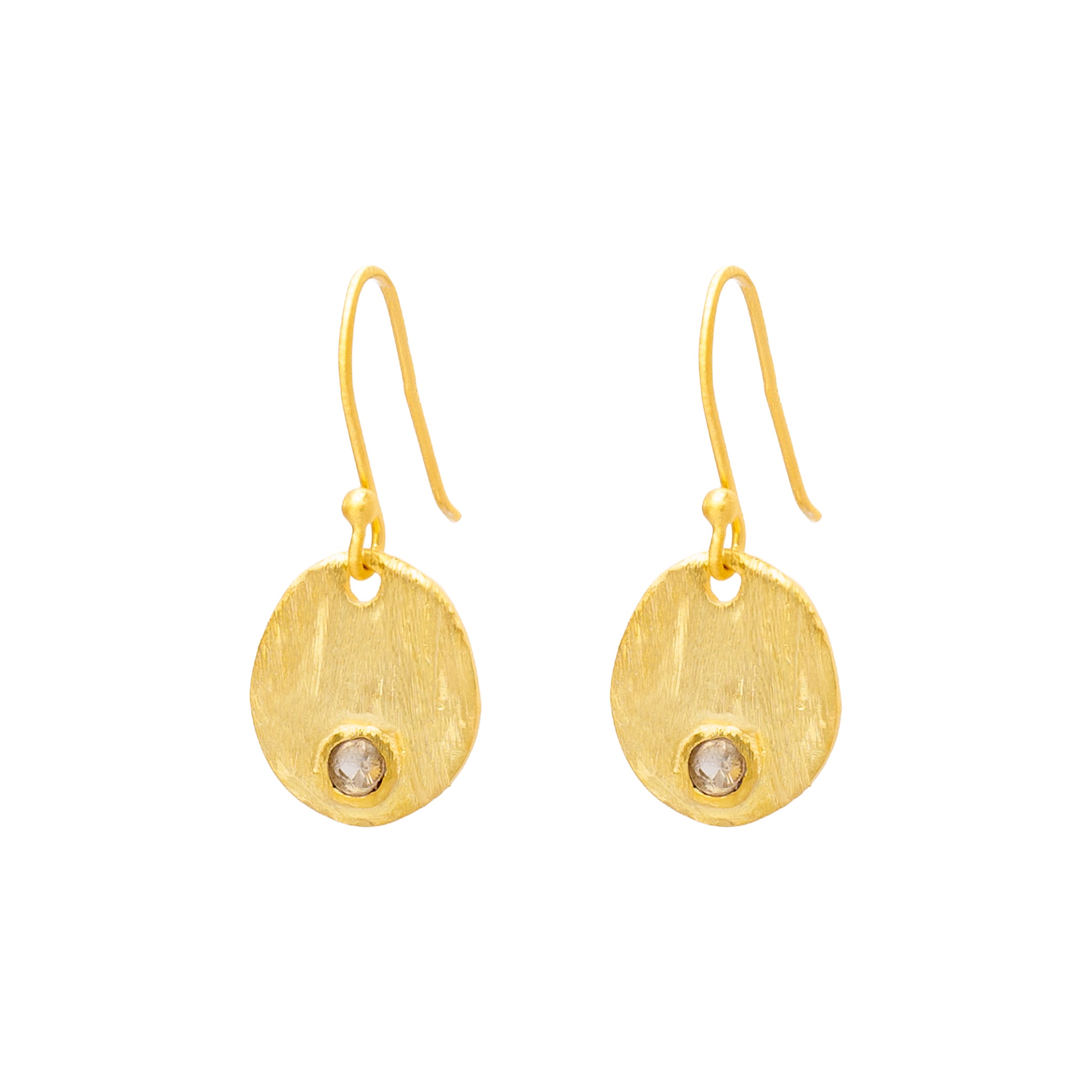 Die Ohrringe Pura bestehen aus vergoldetem 925 Sterling Silber und zeichnen sich durch ihr matt gebürstetes 18k Gold-Finish aus. Die leicht unregelmäßige Oberfläche des Plättchens verleiht dem Design einen handgearbeiteten, natürlichen Charakter.