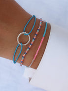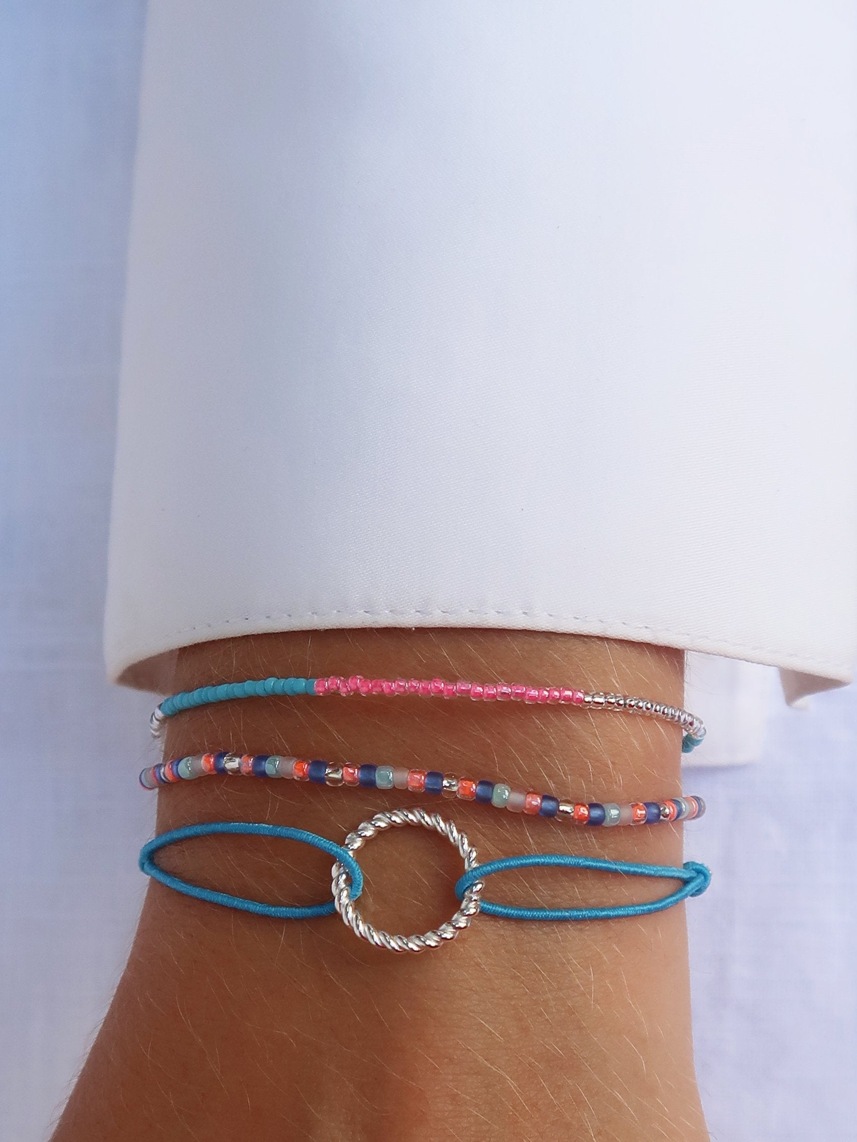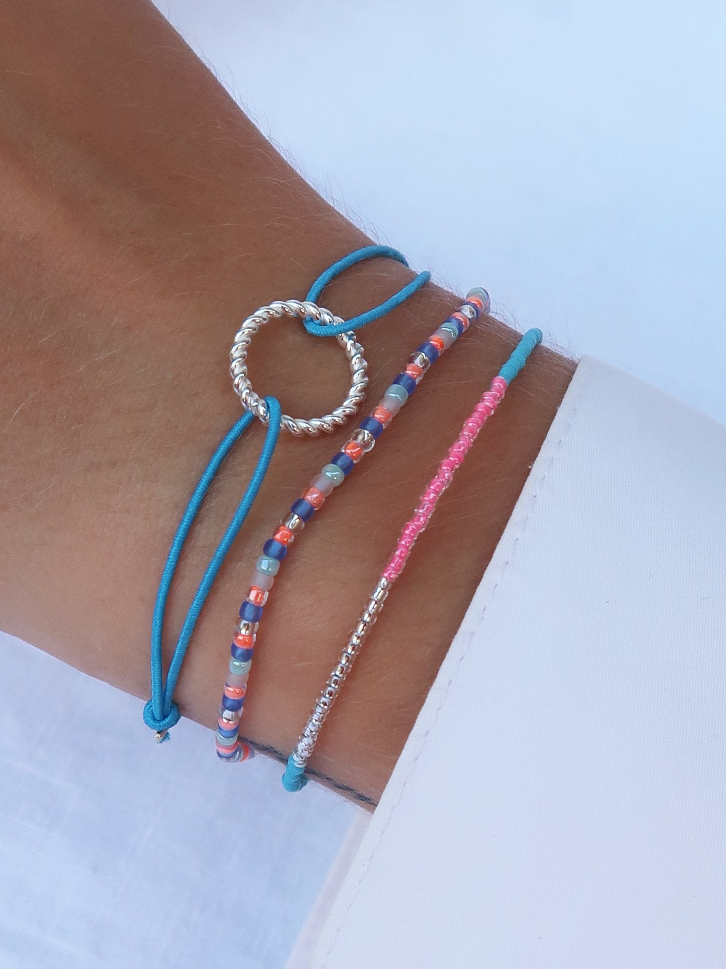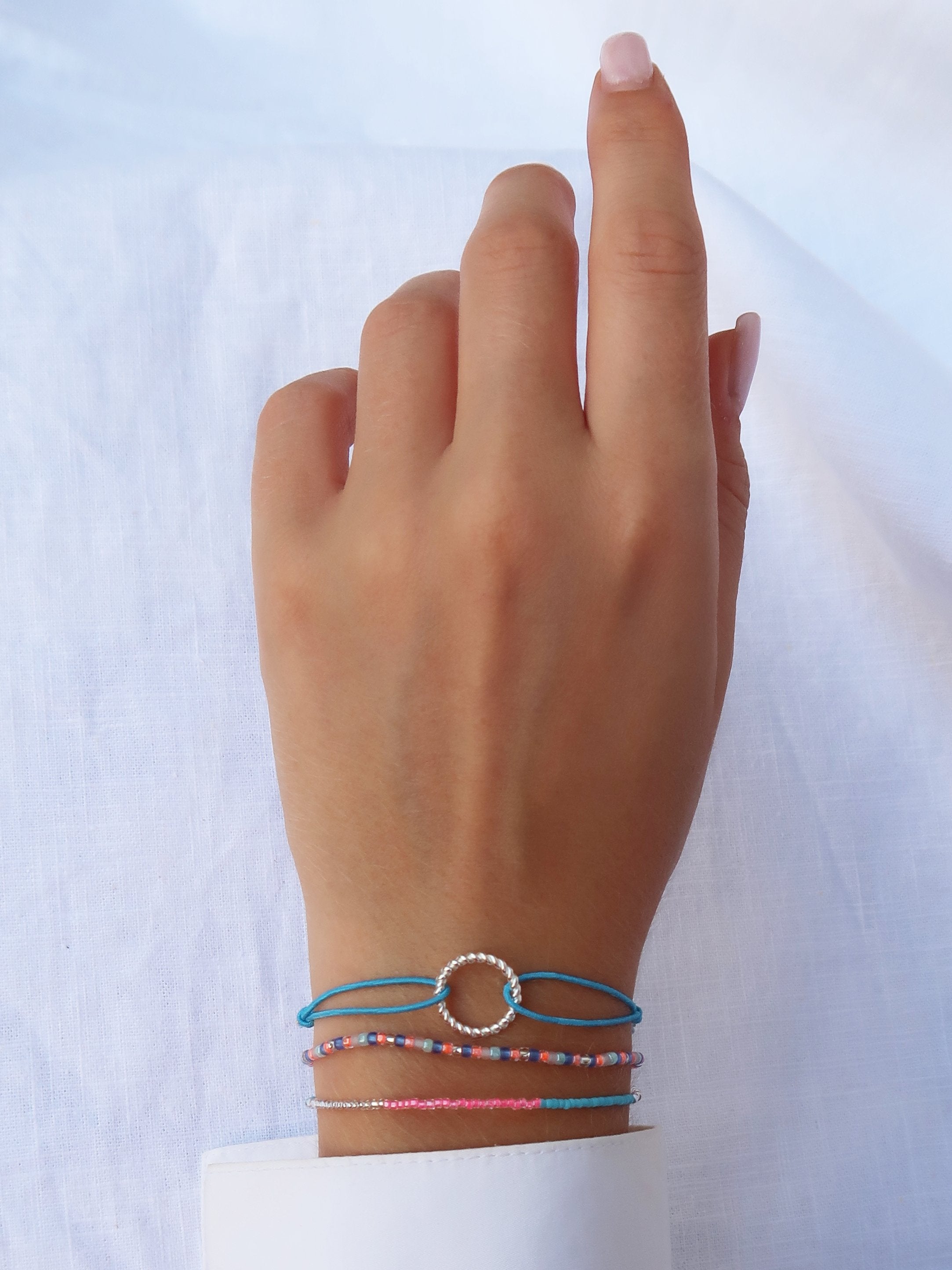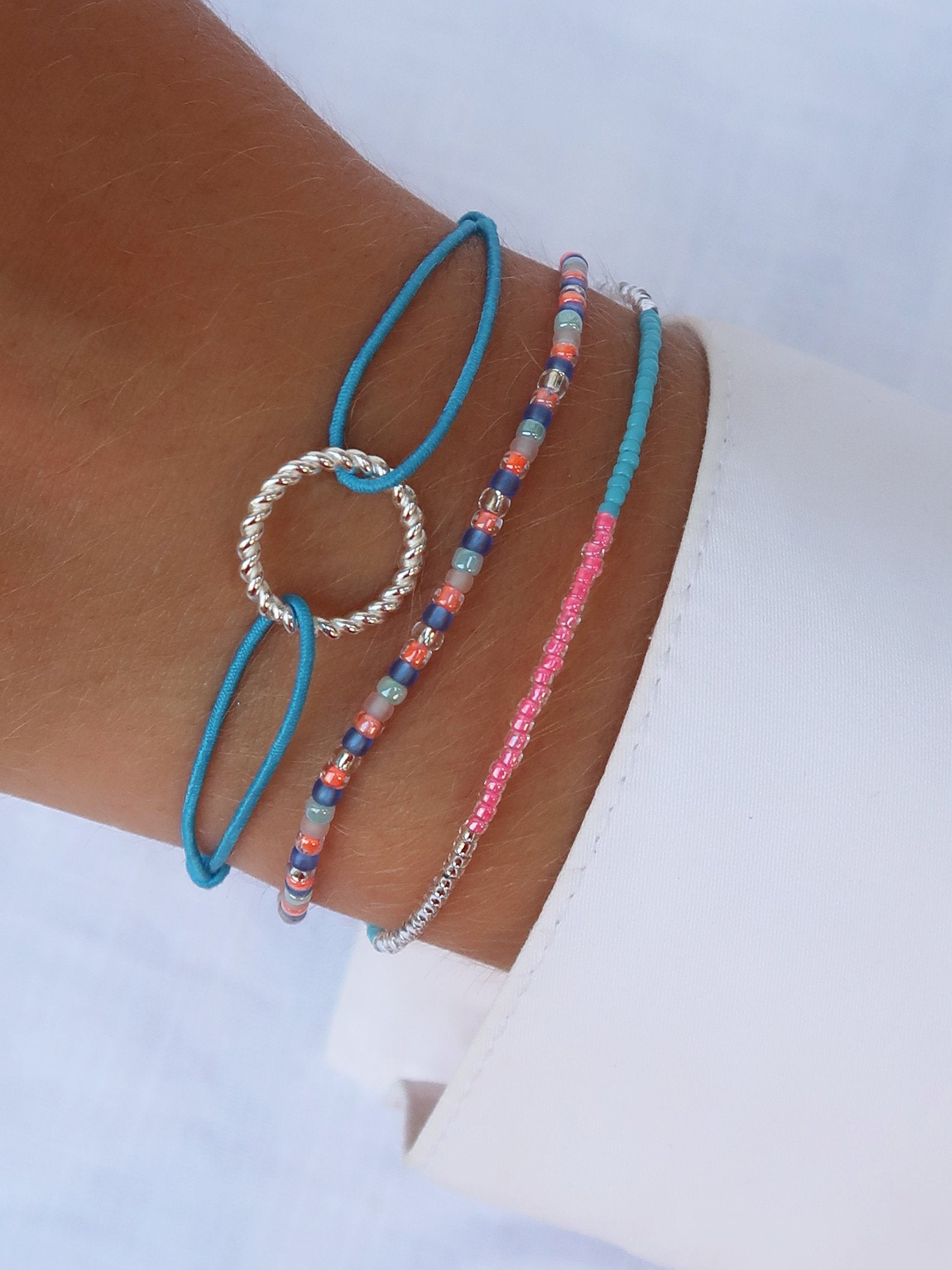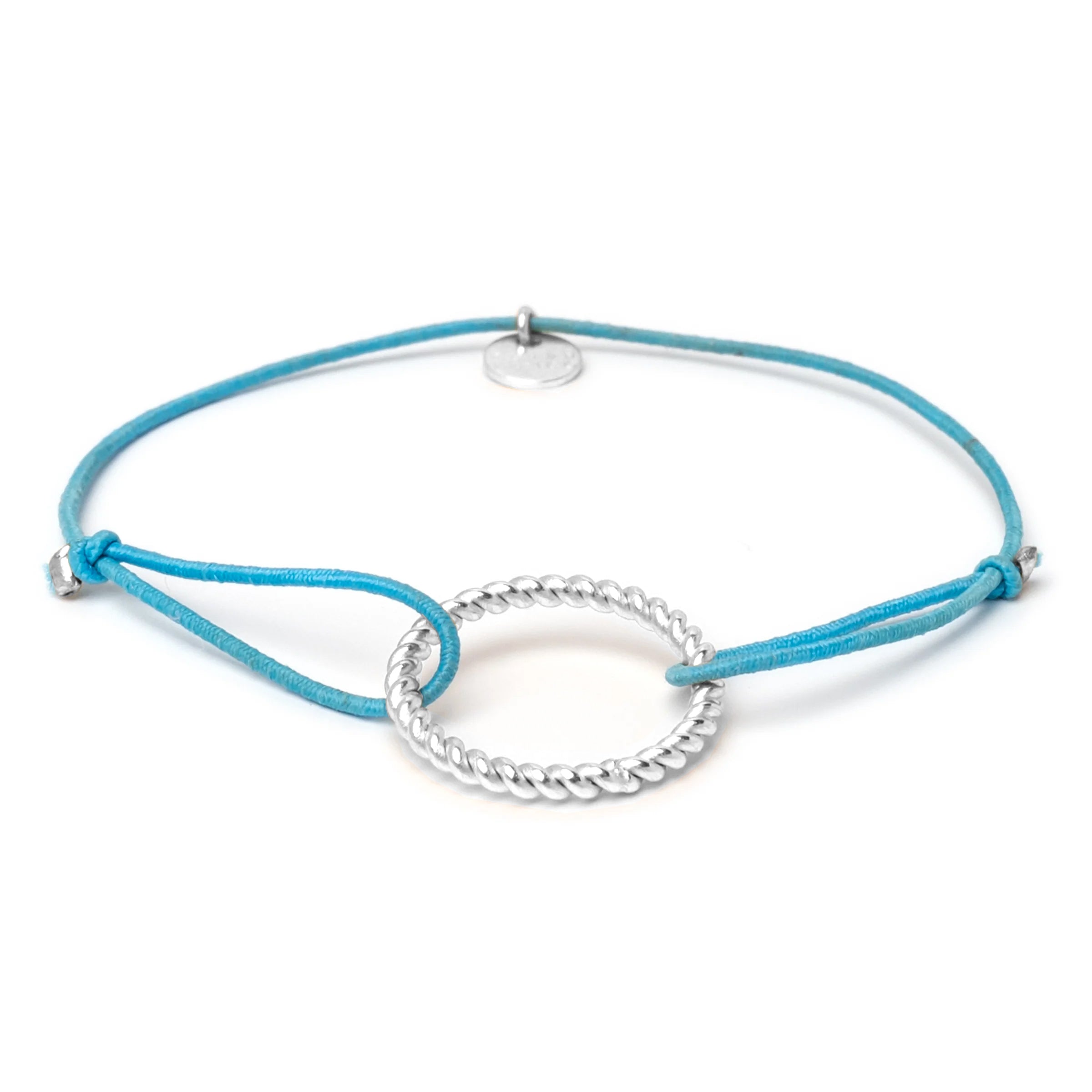 Das silberne Armband Darling Circle hat das Zeug zum Lieblingsstück in deinem Schmuckkästchen. Das elastische Nylon-Band in Türkisblau schmiegt sich elegant an dein Handgelenk. Strahlender Mittelpunkt ist der gedrehte kreisförmige Circle-Anhänger aus versilberten Edelstahl.
