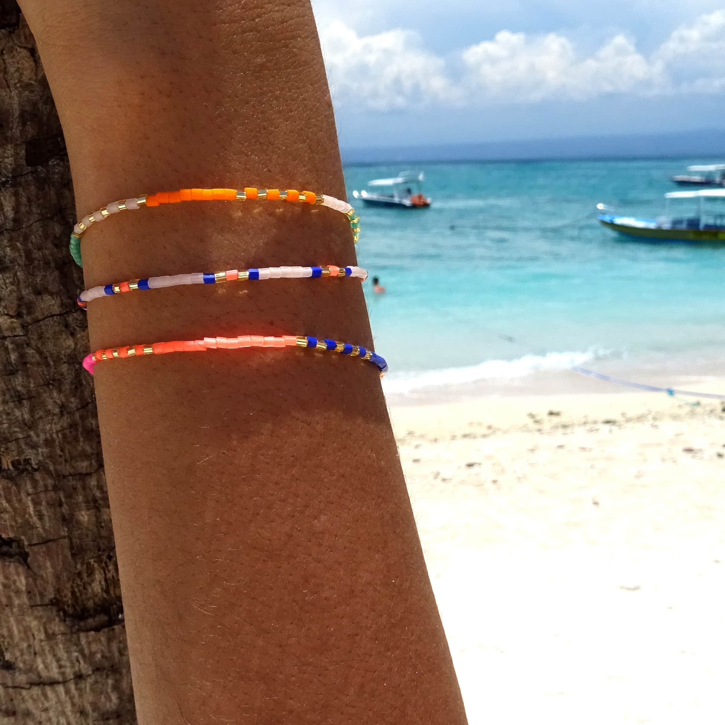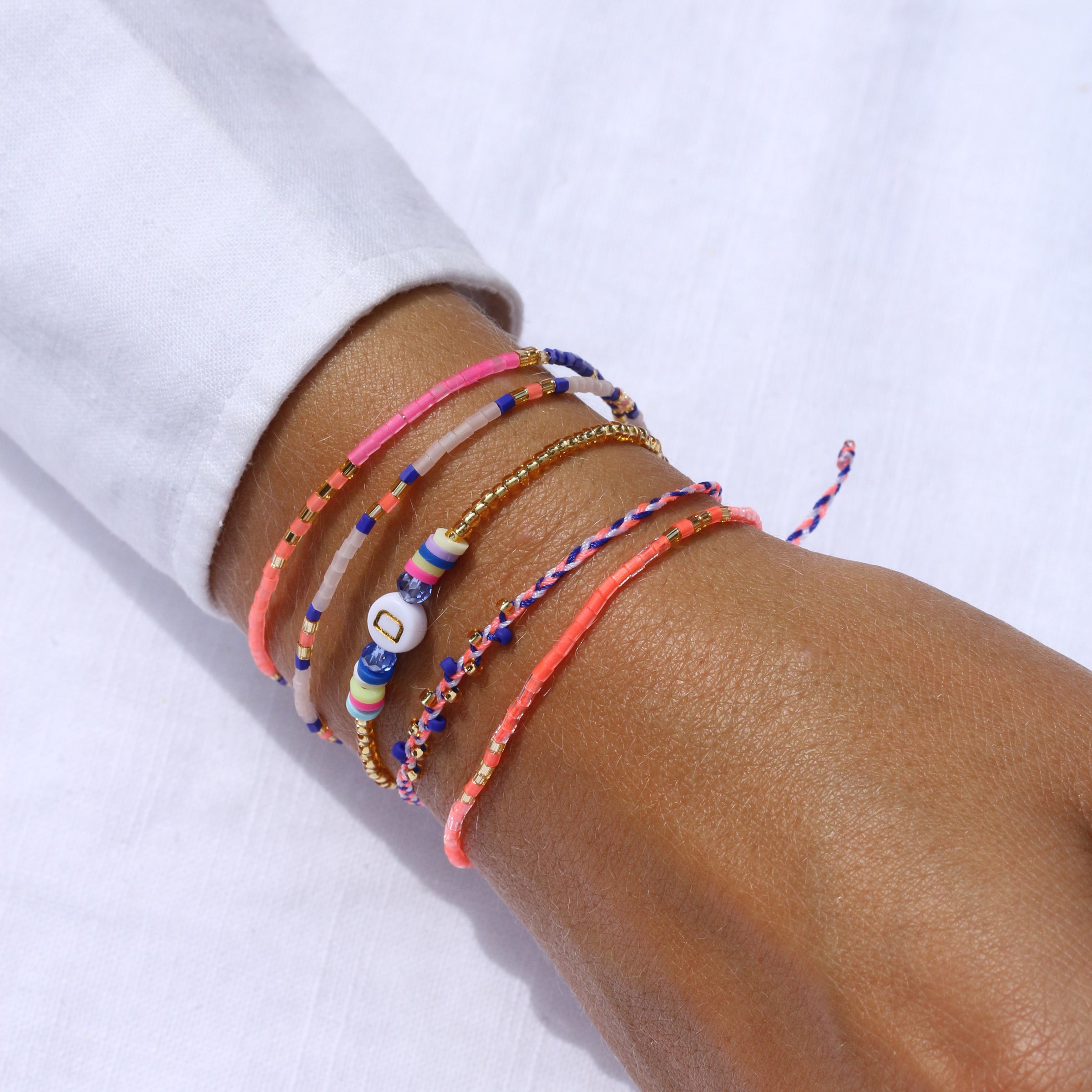 Natürlich braucht auch die Amalfi-Serie ein Armband in unseren Lieblingsfarben. Perlen in Frosted Blush Rose, Indigo Blue und Neon Coral reihen sich einmal um dein Handgelenk. Wir haben vereinzelt goldene Highlights gesetzt.