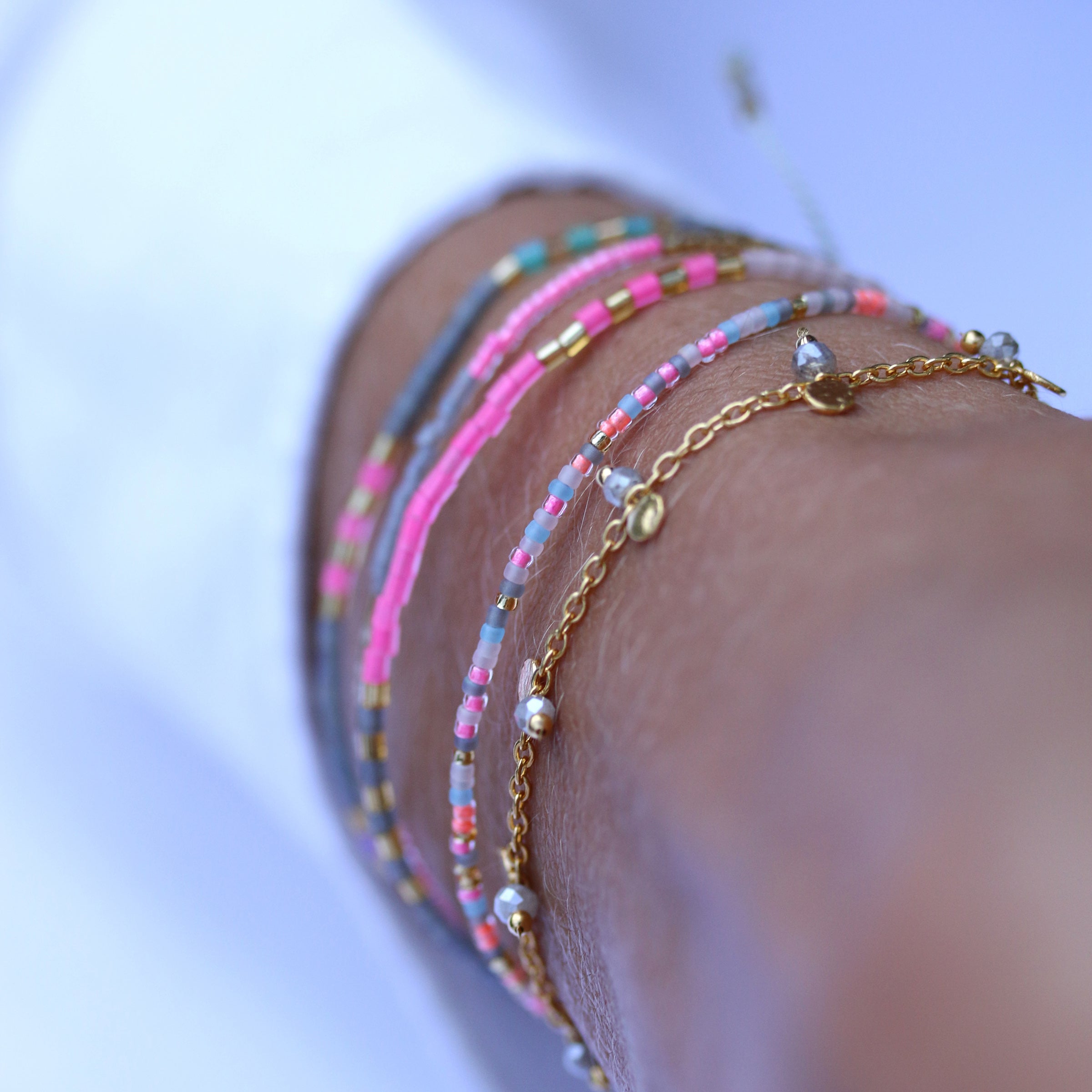 Matte Perlen in Grau, Pink und Blush Rose machen das goldene Armband Nizza aus unserer Amalfi-Serie zum Star an der Côte d’Azur. Besonders schön ist das Armband in Kombination mit dem Multi Mix Nizza und dem Sweet String-Bändchen Grey Season. Das traumhafte Trio ist auch als Set erhältlich.