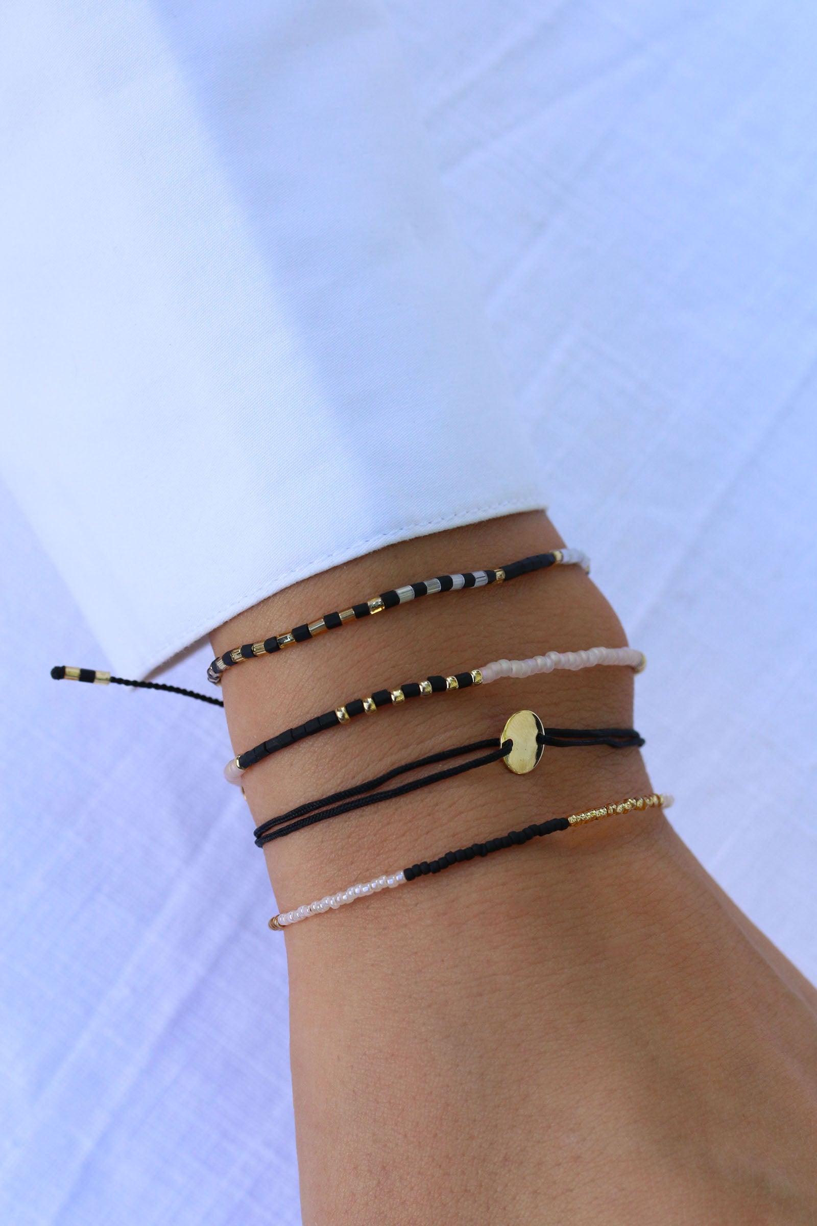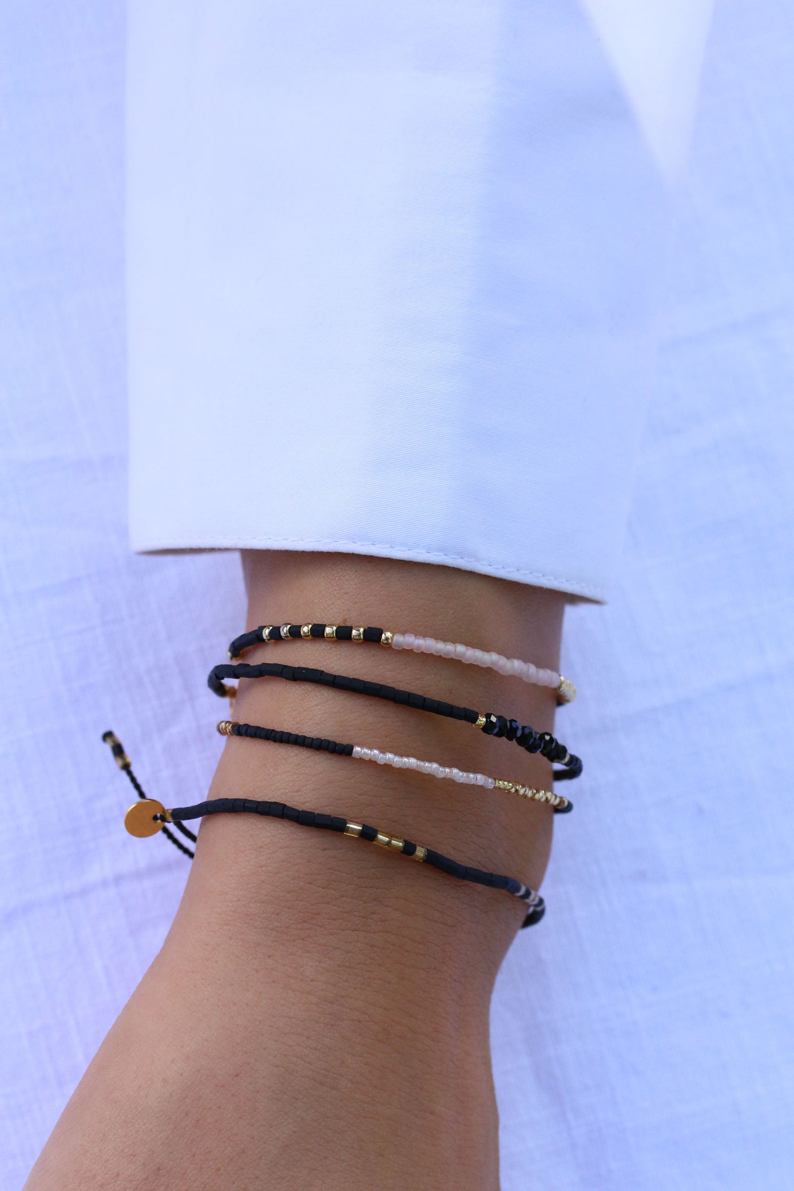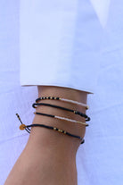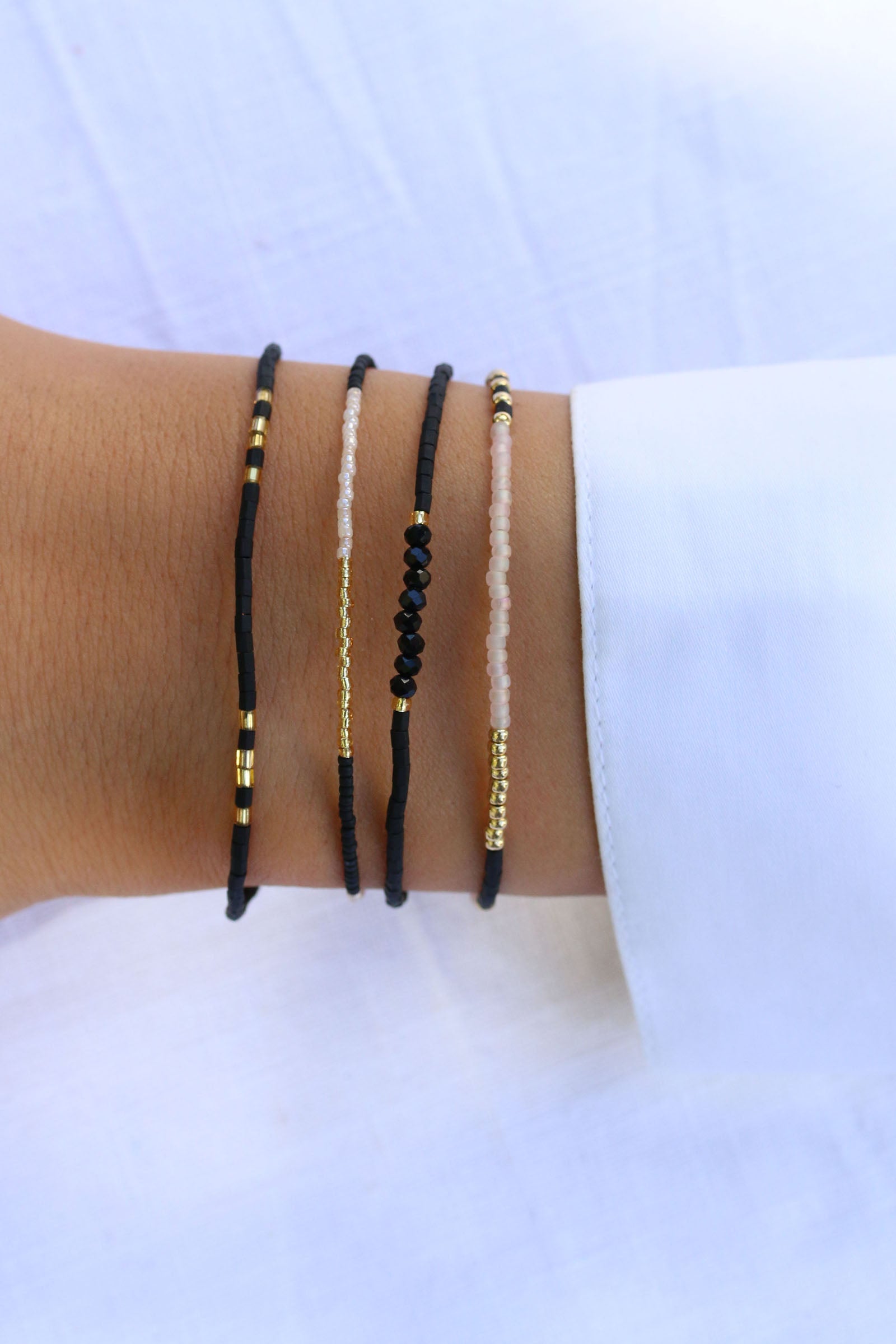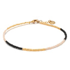 Bei dem goldenen Block Mix 24 haben wir Perlen in Matt Black, Silky White und Gold kombiniert und in Abständen von 1,5 cm bis 2,5 cm angeordnet. Das Armband eignet sich hervorragend zum Kombinieren, sieht aber auch solo sensationell aus.