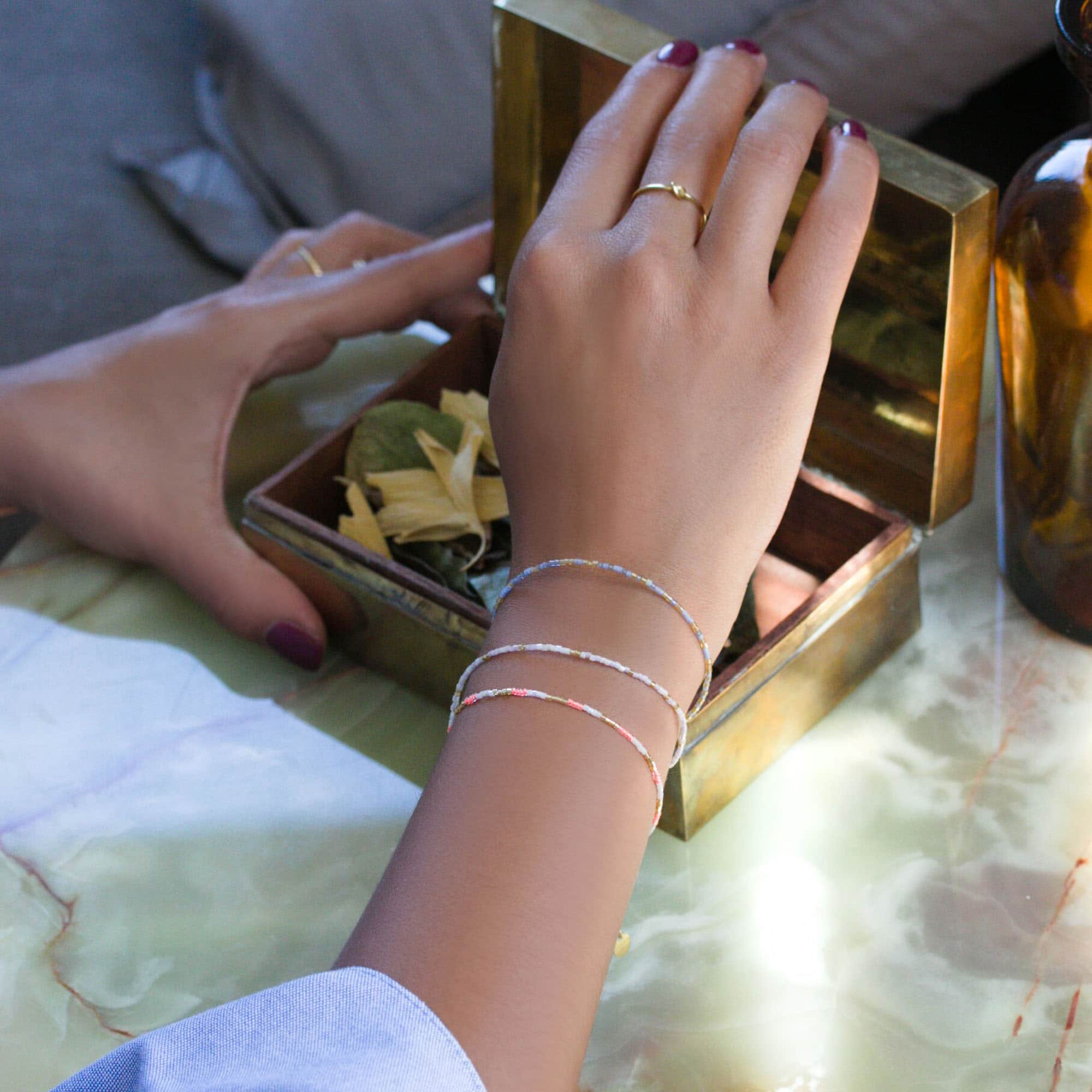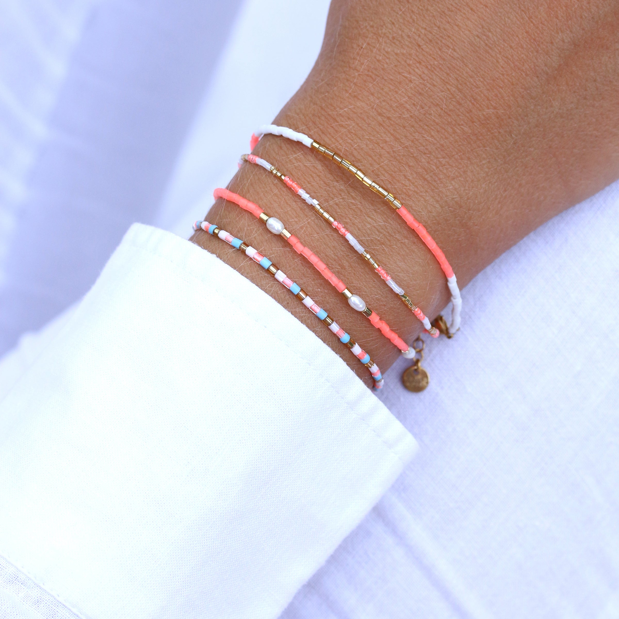 Das Be Blush Armband hat das Zeug zum Lieblingsstück in deinem Schmuckkästchen. Es besteht aus winzig kleinen Glasperlen der japanischen Firma Matsuno und wird mit einem Karabiner verschlossen. Es ist ca. 17 cm lang und kann um 2 cm verlängert werden.