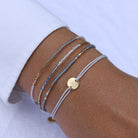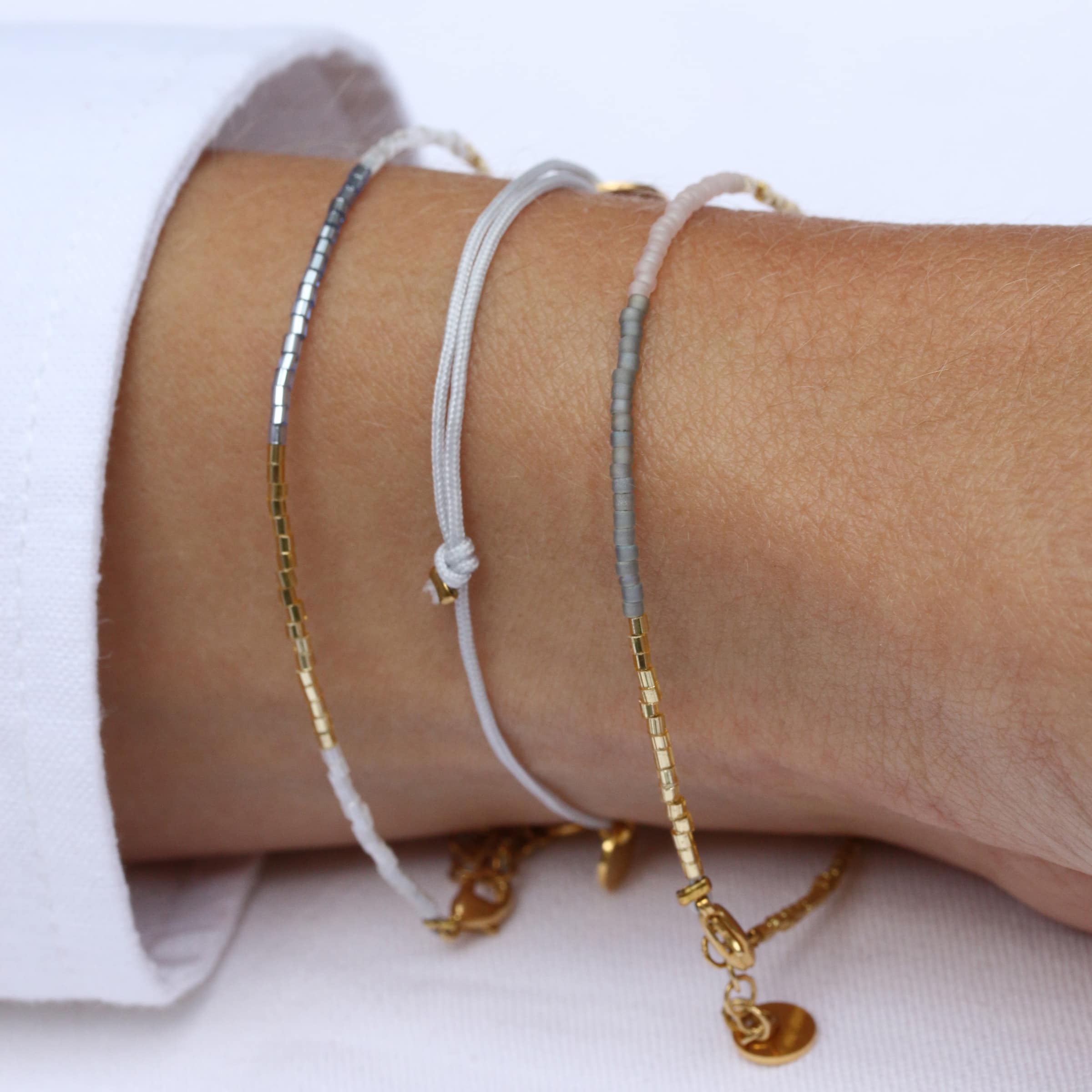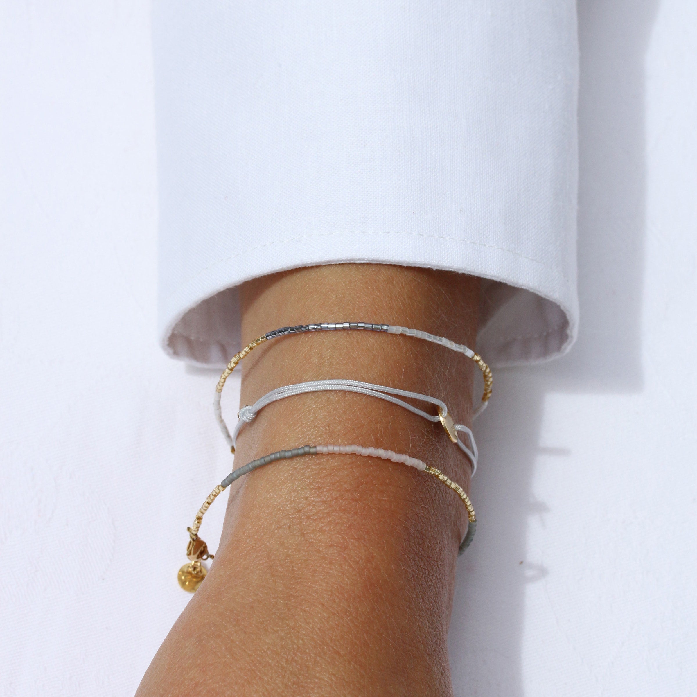 An dem verstellbaren Nylonbändchen in Light Grey kann das kreisrunde goldene Plättchen richtig glänzen. Der Anhänger ist mittig fixiert, so dass er nicht verrutschen kann und besonders schön in Kombination mit anderen Grau-Tönen wie im Mix-Set Grey Sky.