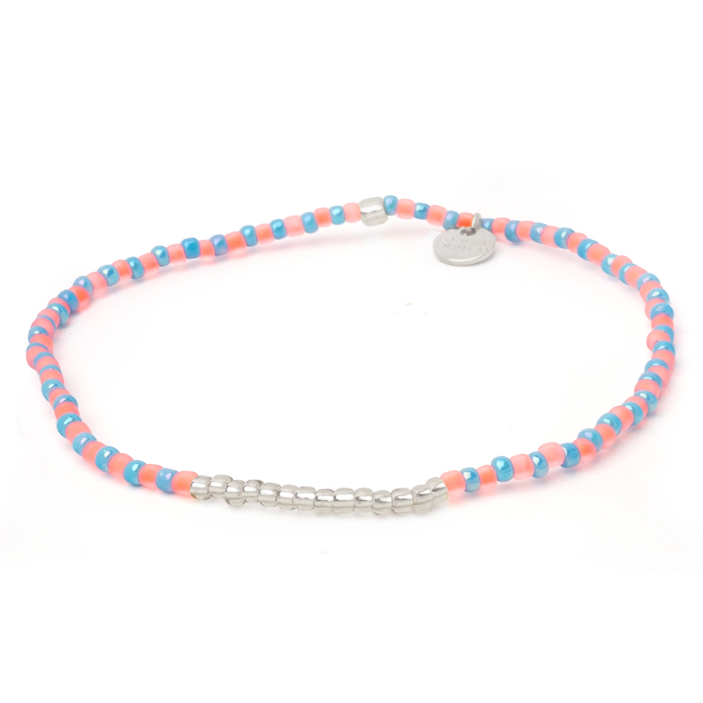 Lumi Pop in Blue Coral kombiniert blaue und neon-coralfarbene Glasperlen zu einem strahlenden Mix, der sofort gute Laune macht. Das elastische Band schmiegt sich angenehm ans Handgelenk und ist dein kleiner Farbkick für jeden Tag.