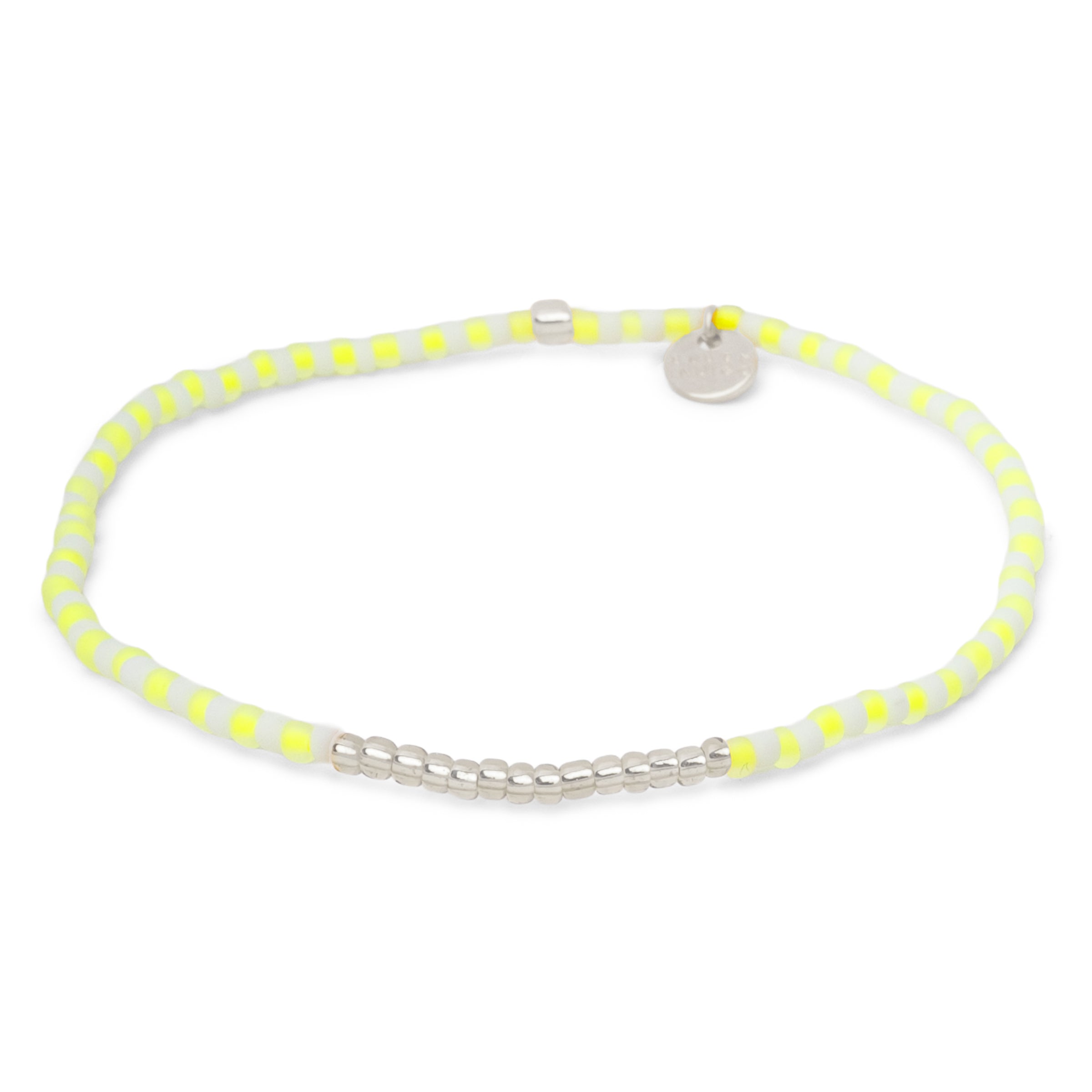 Das Armband Lumi Pop in leuchtendem Neon-Gelb kombiniert weiße und silberne Glasperlen zu einem frischen, sommerlichen Look. Silberne Akzente setzen einen eleganten Mittelpunkt, während das elastische Band sich angenehm ans Handgelenk schmiegt und jede Bewegung mitmacht.