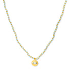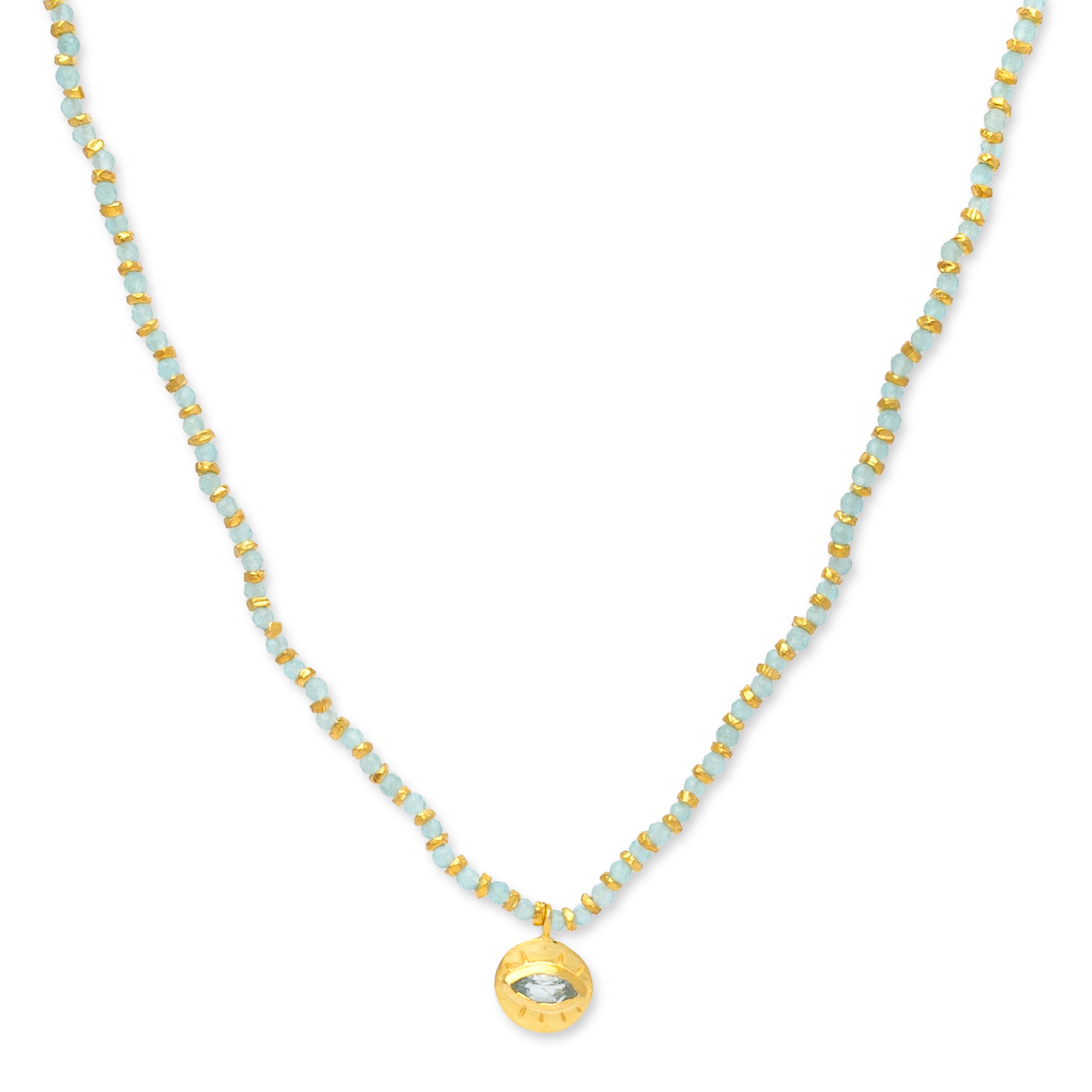 Die Kette Ananya besteht aus unzähligen 2 mm großen Aquamarin-Steinchen, die sich rhythmisch mit vergoldeten Nuggets abwechseln. Im Mittelpunkt steht ein runder Anhänger mit Augen-Motiv und edlem, mattem Gold-Finish.
