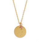 Die Kette ist 45 cm lang und kann um 5 cm verlängert werden. Sie ist aus 925 Silber gefertigt und 24k vergoldet. Das kreisrunde Plättchen hat einen Durchmesser von 1,3 cm und zeigt die eingravierte Sternenkonstellation des jeweiligen Tierkreiszeichens. Die goldene Variante kommt in einer matten Brushed-Optik, die silberne Variante ist glatt poliert.