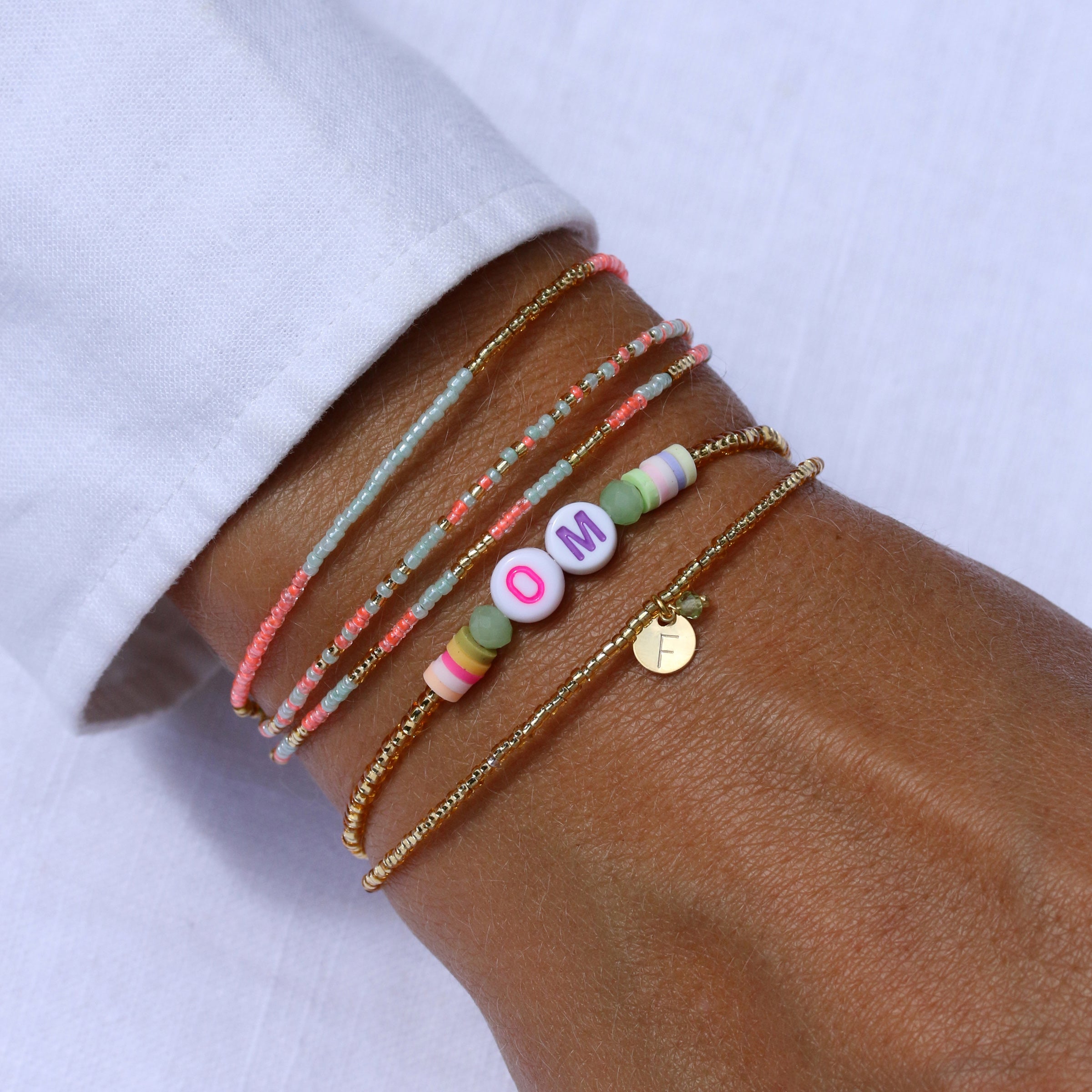Das kreisrunde 6 mm Buchstaben-Plättchen wird von Hand gestempelt, daher gleicht keines dem anderen. Das Armband hat eine Länge von ca. 16 cm und kann um 2 cm verlängert werden. Alle verwendeten Metallteile sind aus 24k vergoldeten Messing und stammen aus Deutschland und Italien.