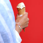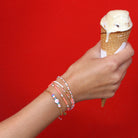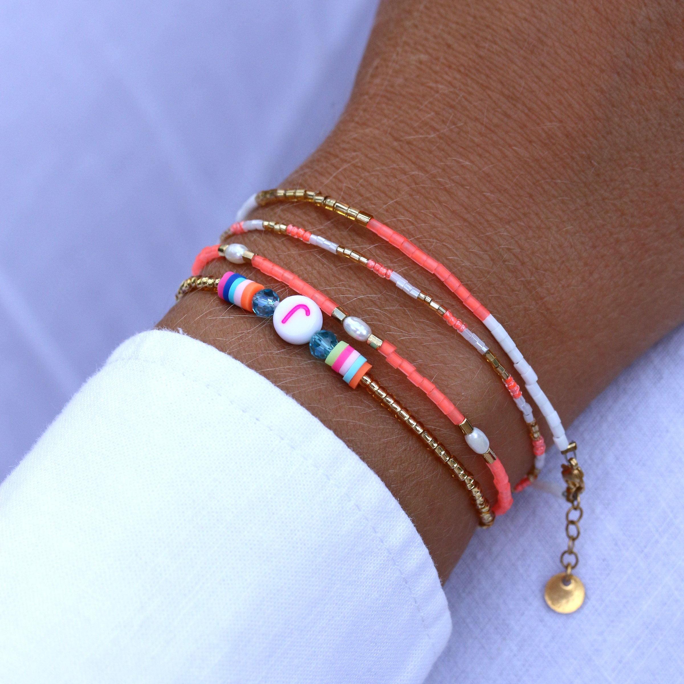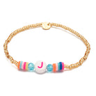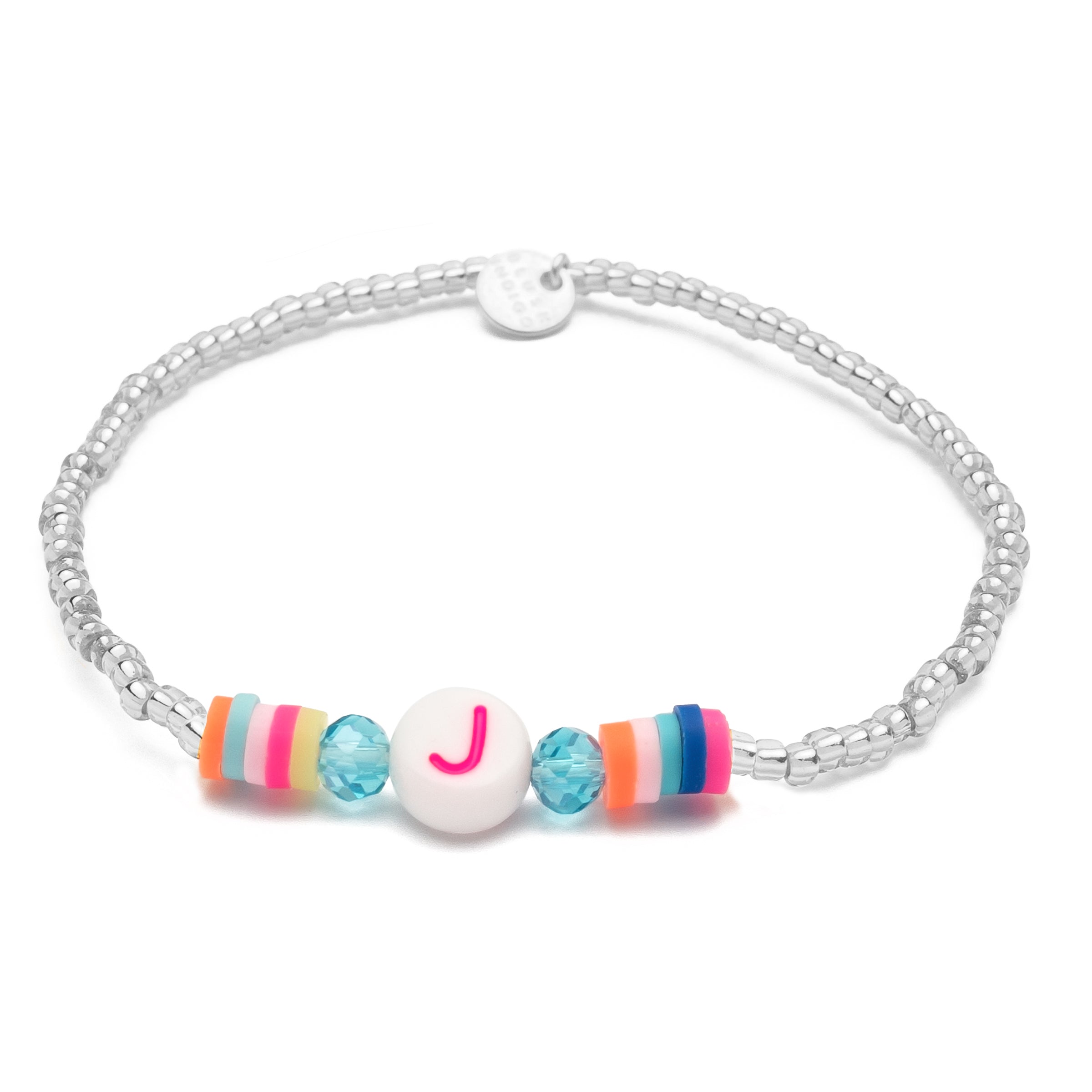 Für all die Janinas, Julias und Jolandas ... Das Bändchen aus unserer Candy-Serie ist nicht nur zum Anknabbern süß, die weiße Perle feiert auch deine Einzigartigkeit oder die eines geliebten Menschen. Eingerahmt ist der Buchstabe von farbenfrohen Kristallperlen und bunten Heishi Pearls aus Gummi.