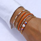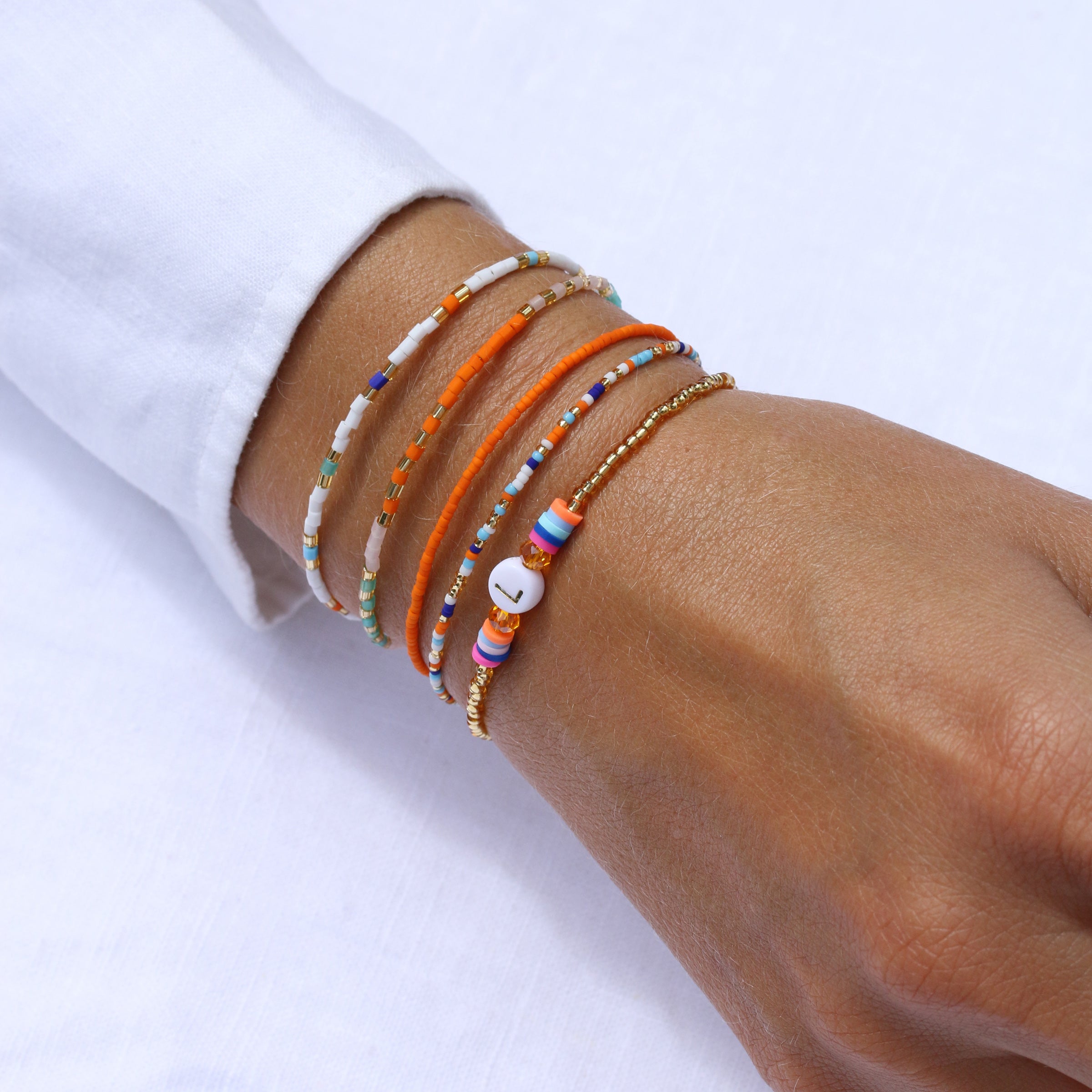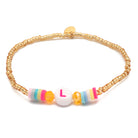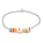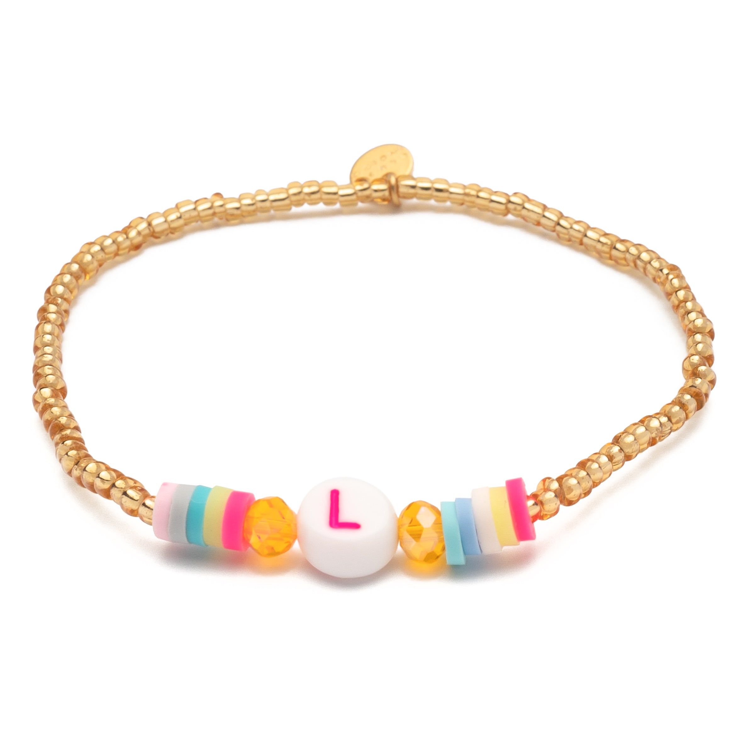 Für all die Lenas, Lauras und Lorettas ... Das Bändchen aus unserer Candy-Serie ist nicht nur zum Anknabbern süß, die weiße Perle feiert auch deine Einzigartigkeit oder die eines geliebten Menschen. Eingerahmt ist der Buchstabe von farbenfrohen Kristallperlen und bunten Heishi Pearls aus Gummi.
