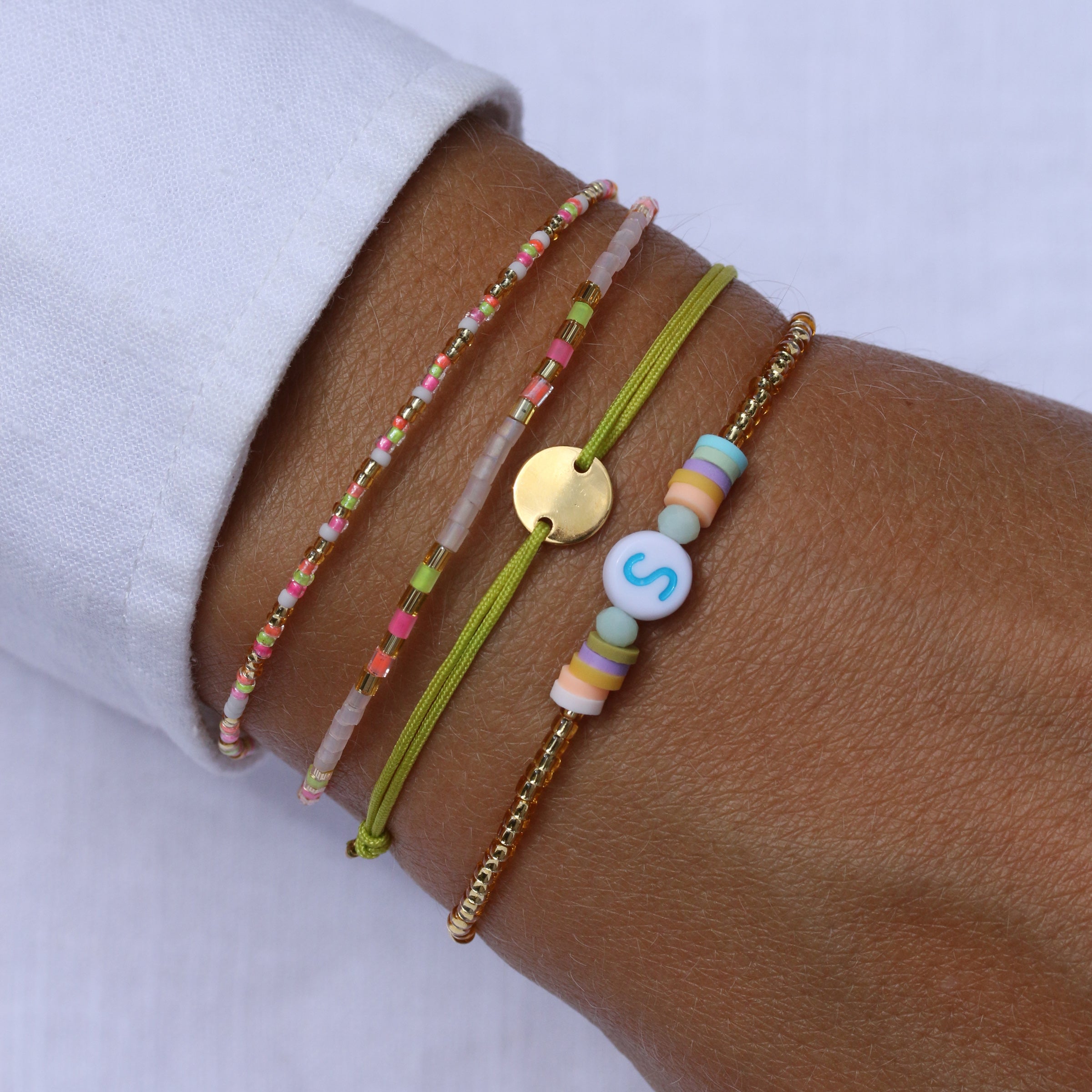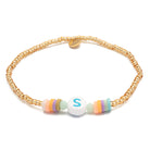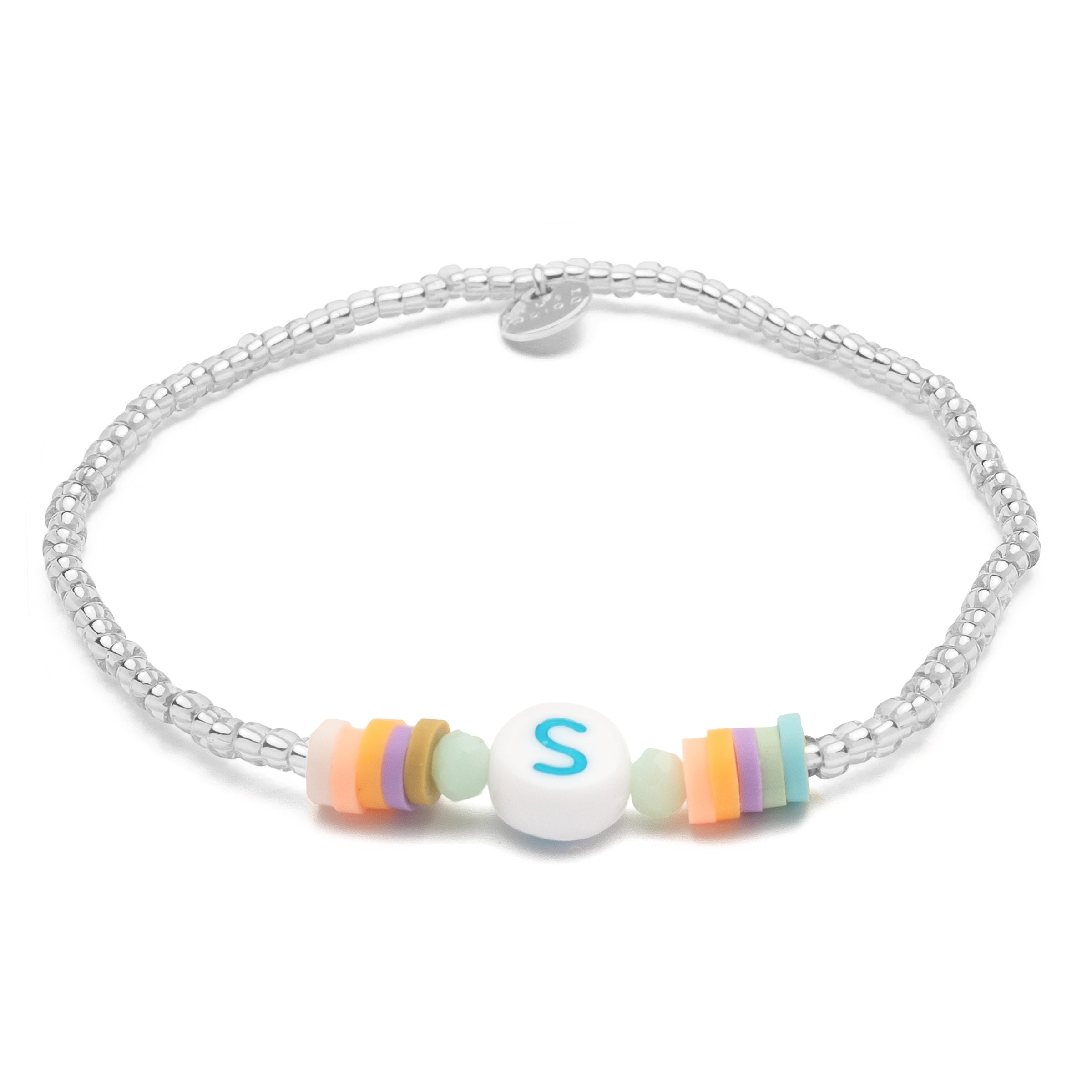 Für all die Sabines, Sophies und Svenjas ... Das Bändchen aus unserer Candy-Serie ist nicht nur zum Anknabbern süß, die weiße Perle feiert auch deine Einzigartigkeit oder die eines geliebten Menschen. Eingerahmt ist der Buchstabe von farbenfrohen Kristallperlen und bunten Heishi Pearls aus Gummi.