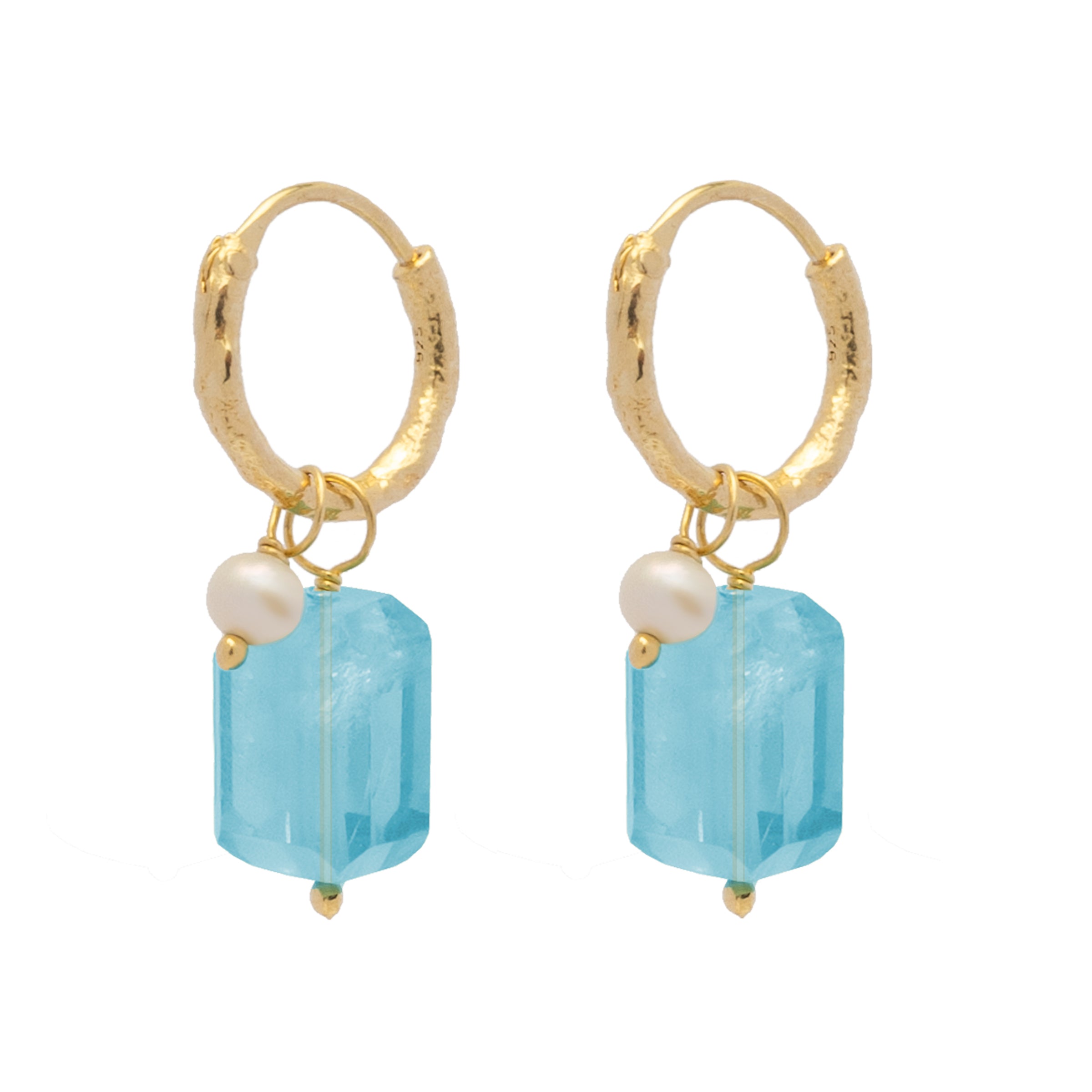 Mittelpunkt unserer Creolen in gehämmerter Optik ist ein rechteckiger Blauer Topas, der sich frei auf der Creole bewegen kann. Eine kleine Süßwasserperle setzt das i-Tüpfelchen.