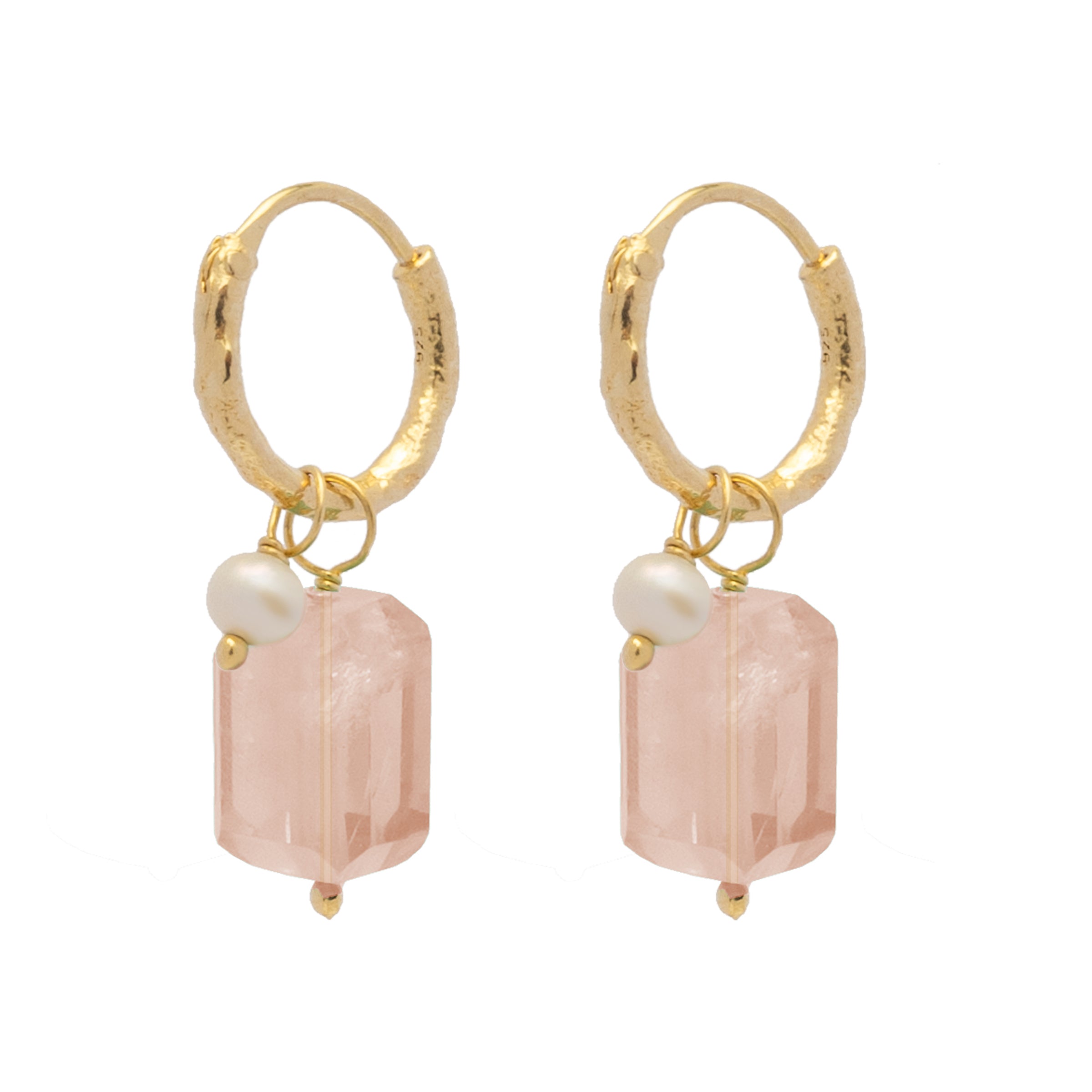 Mittelpunkt unserer Creolen in gehämmerter Optik ist ein rechteckiger Morganit, der sich frei auf der Creole bewegen kann. Eine kleine Süßwasserperle setzt das i-Tüpfelchen.