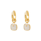 Die massiven Creolen Elpis aus vergoldetem Messing bestechen durch ihr gehämmertes 18-Karat-Gold-Finish, das dezent schimmert und dem Design eine elegante Leichtigkeit verleiht. Im Mittelpunkt stehen ein quadratischer, weiß schimmernder Mondstein sowie eine 3 mm Süßwasserperle, die sich frei an der Creole bewegen können.