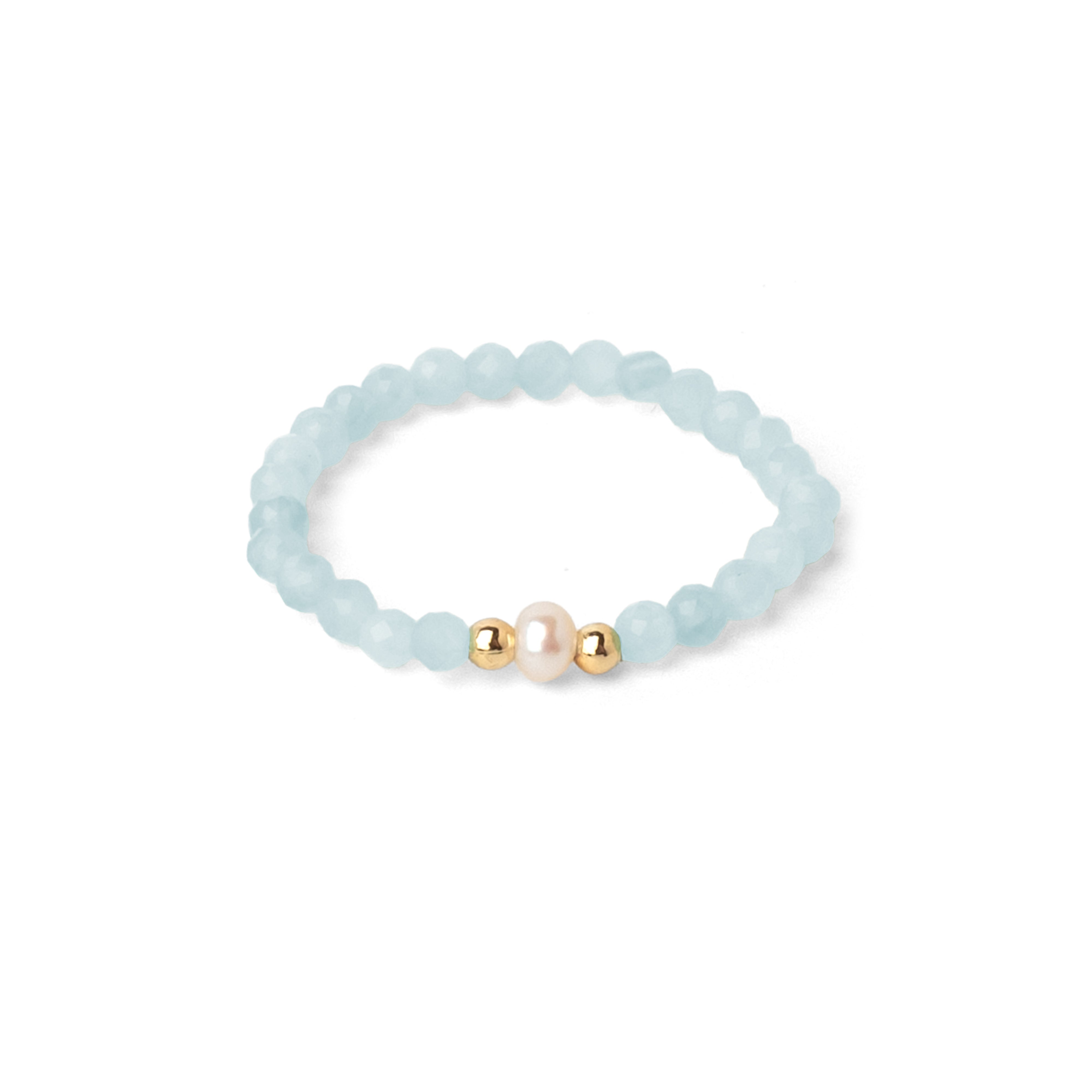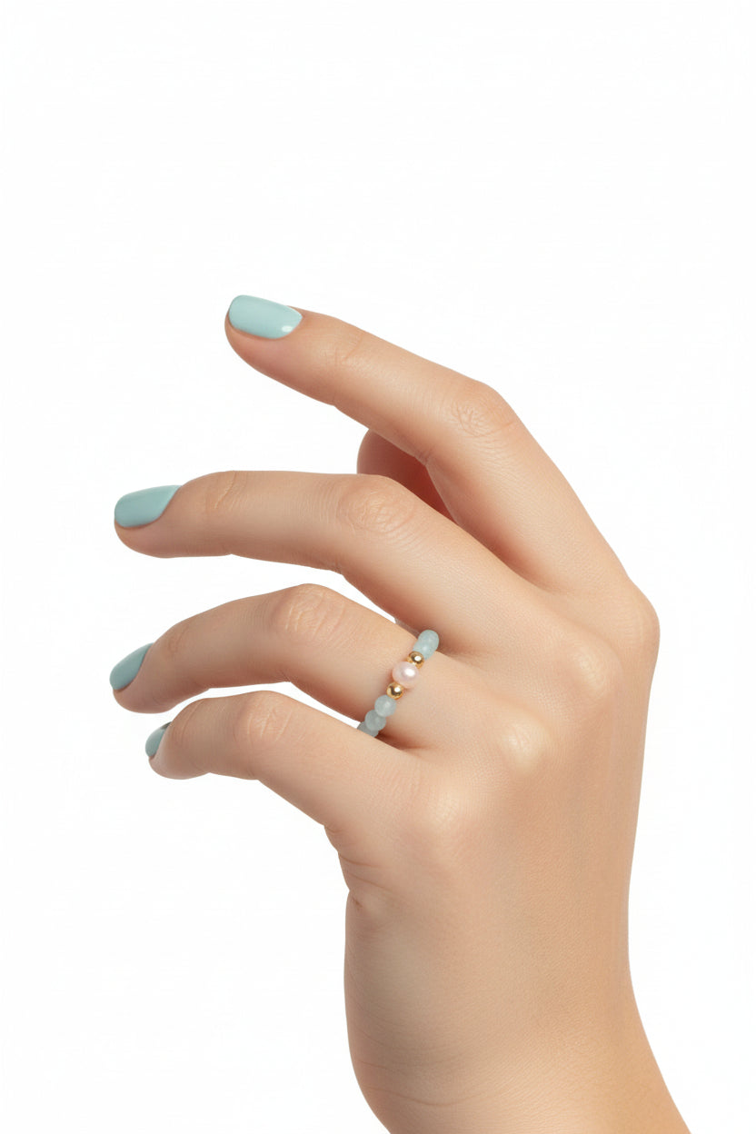 Der Isola Ring kombiniert zarte Eleganz mit feiner Symbolik: Unzählige blassblaue Aquamarine (3 mm) funkeln auf einem elastischen Band, während eine echte Süßwasserperle den Look vollendet.