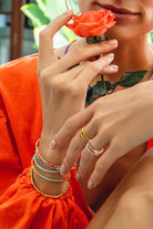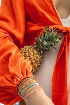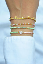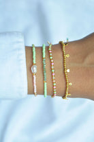 Our elastic bracelet Corinth is one of our absolute store favorites and is now finally available online. The 18k gold plated 925 silver beads and coins casually play around the wrist and go with any colorful bracelet combo.