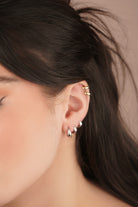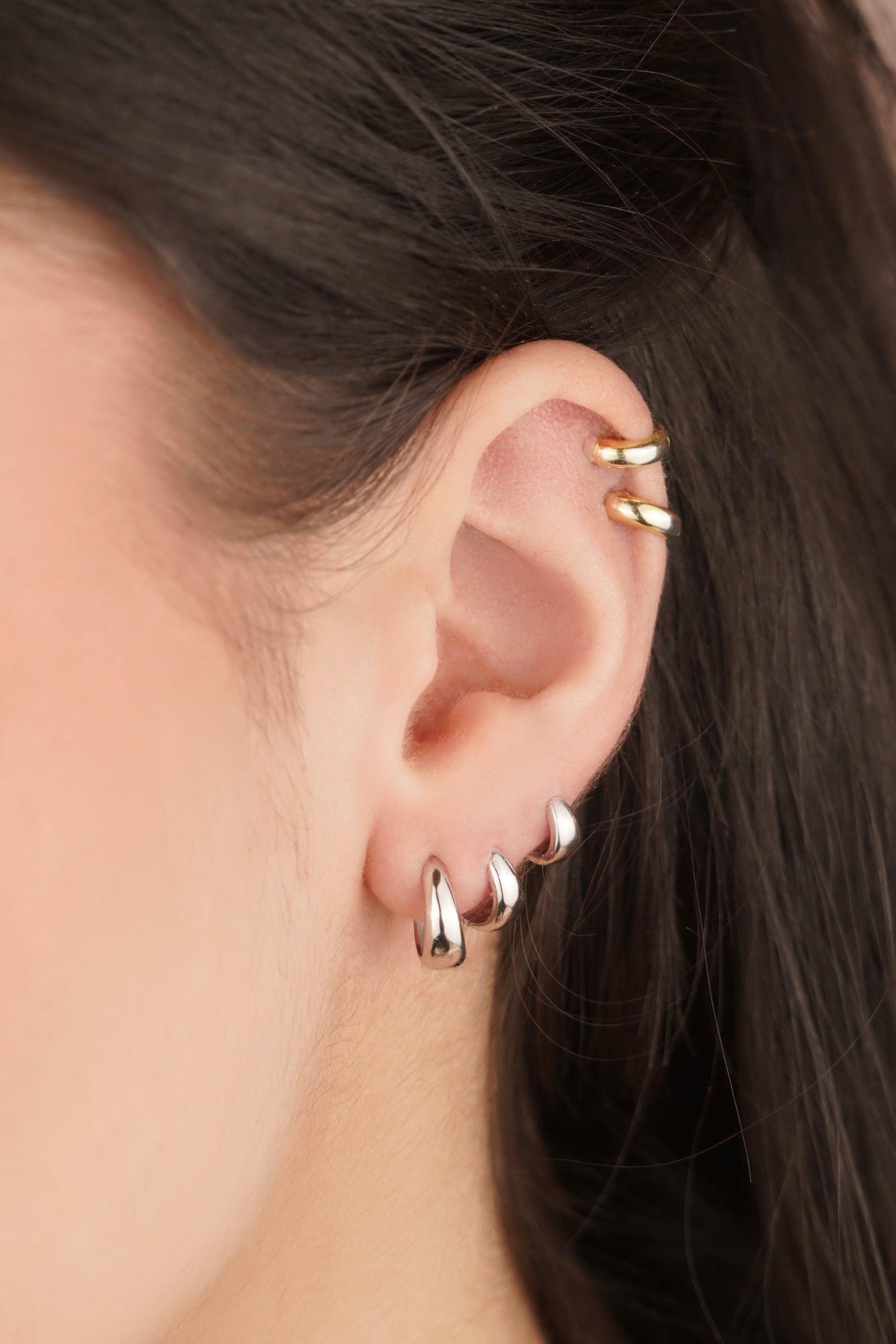 Our model wears the hoop earrings in 12 mm, 8 mm and 6 mm in her ear.