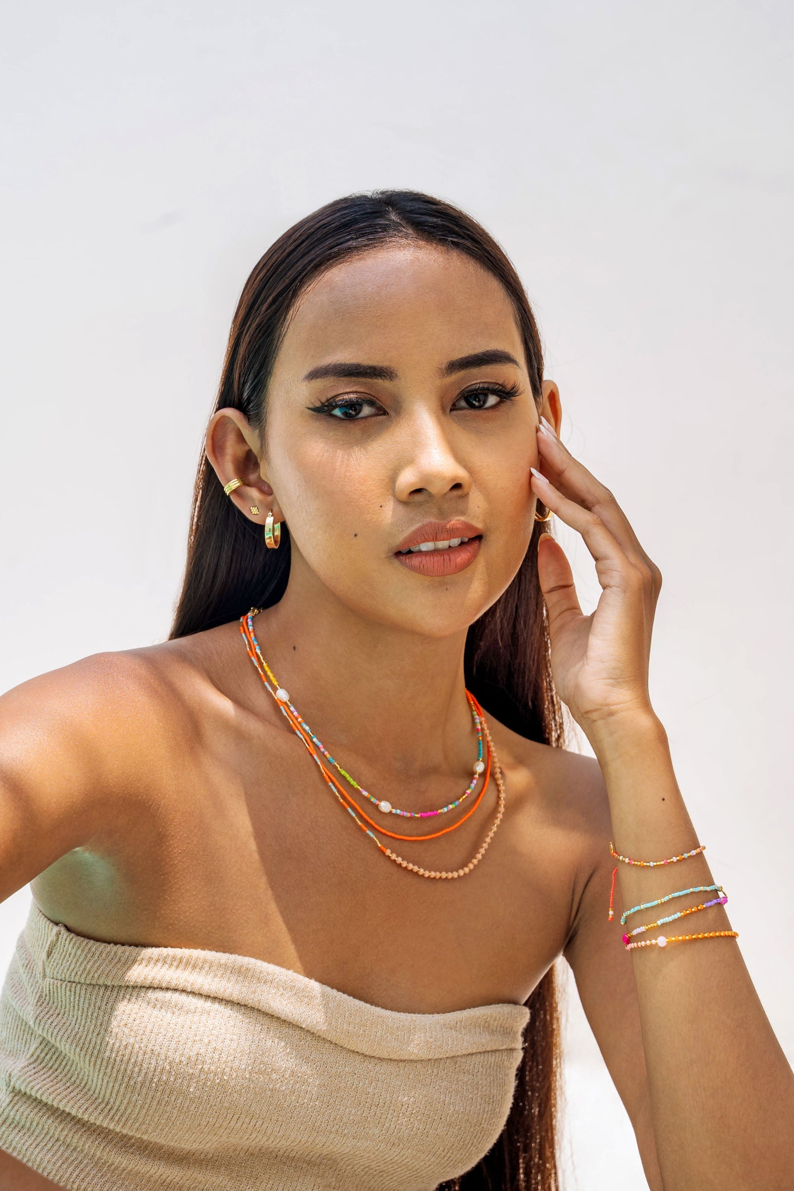All beads used come from Bali's finest bead shop, which exclusively sells Matsuno glass beads from Japan. The metal components are made of 24k gold-plated or silver-plated rhodium-plated brass and come from Germany and Italy.
