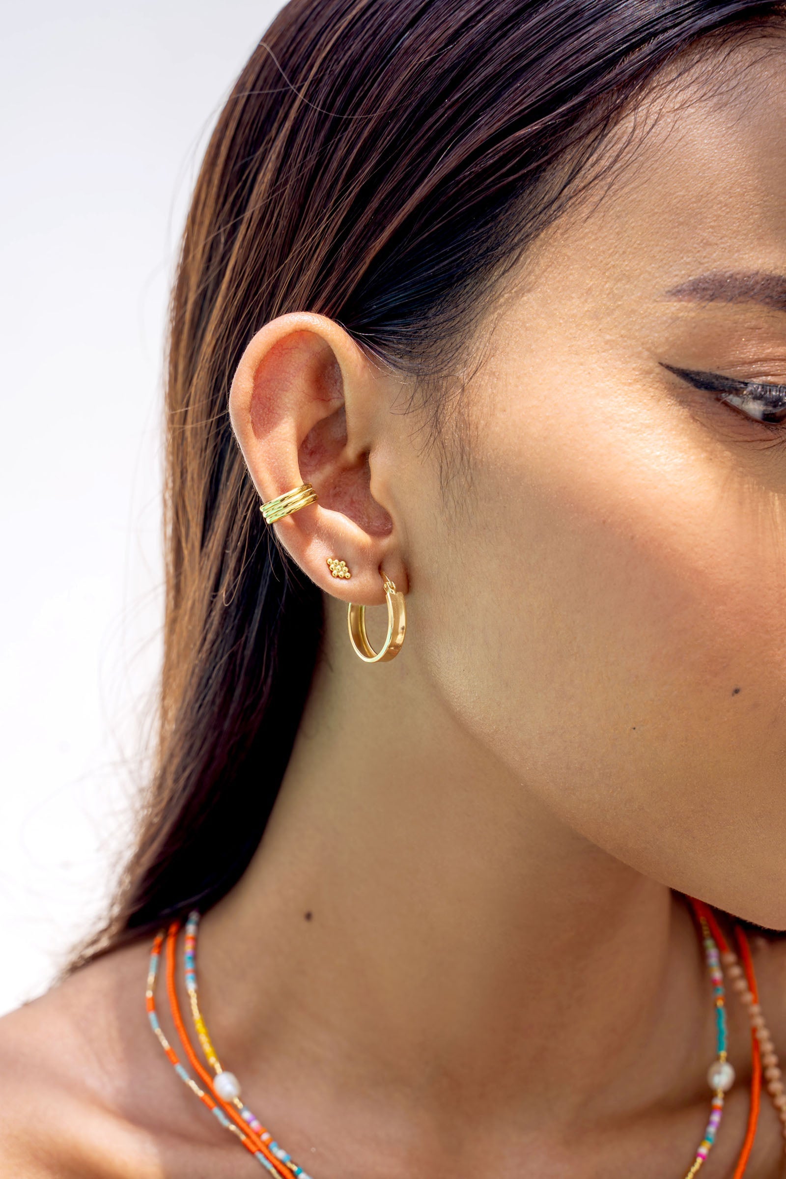 At 4 mm wide, the Trigem ear cuff is a real eye-catcher on the ear. With a diameter of 11 mm, the earcuff fits perfectly in wide areas, such as the center of the pinna on our model.