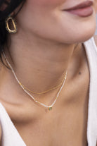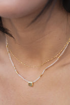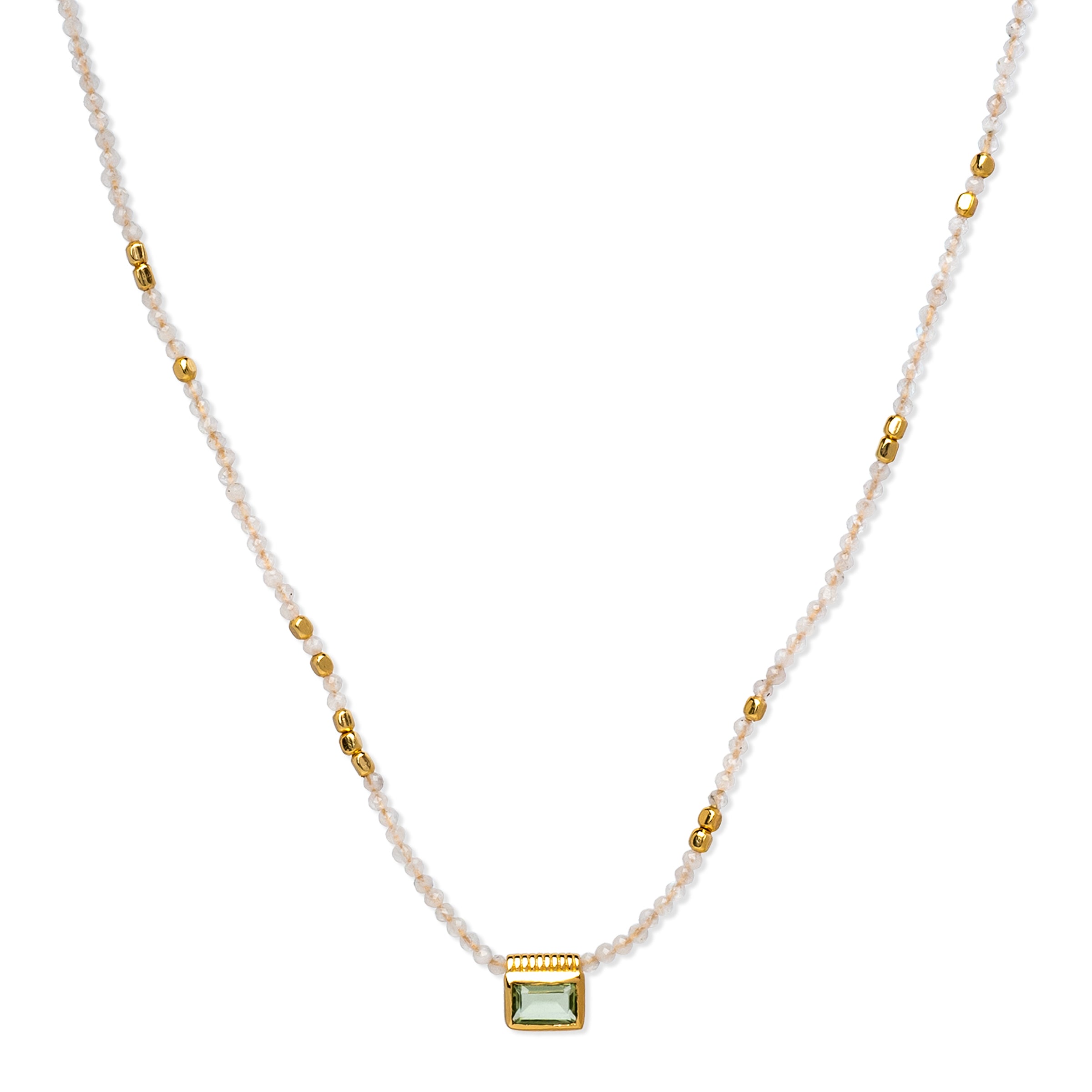 Our Adele necklace is a symphony in delicate pastel shades. Numerous moonstones are threaded onto a chain thread and elegantly encircle the neck. The focal point is the rectangular pendant with a sparkling baguette-cut peridot . Gold-plated 925 silver nuggets add elegant accents.