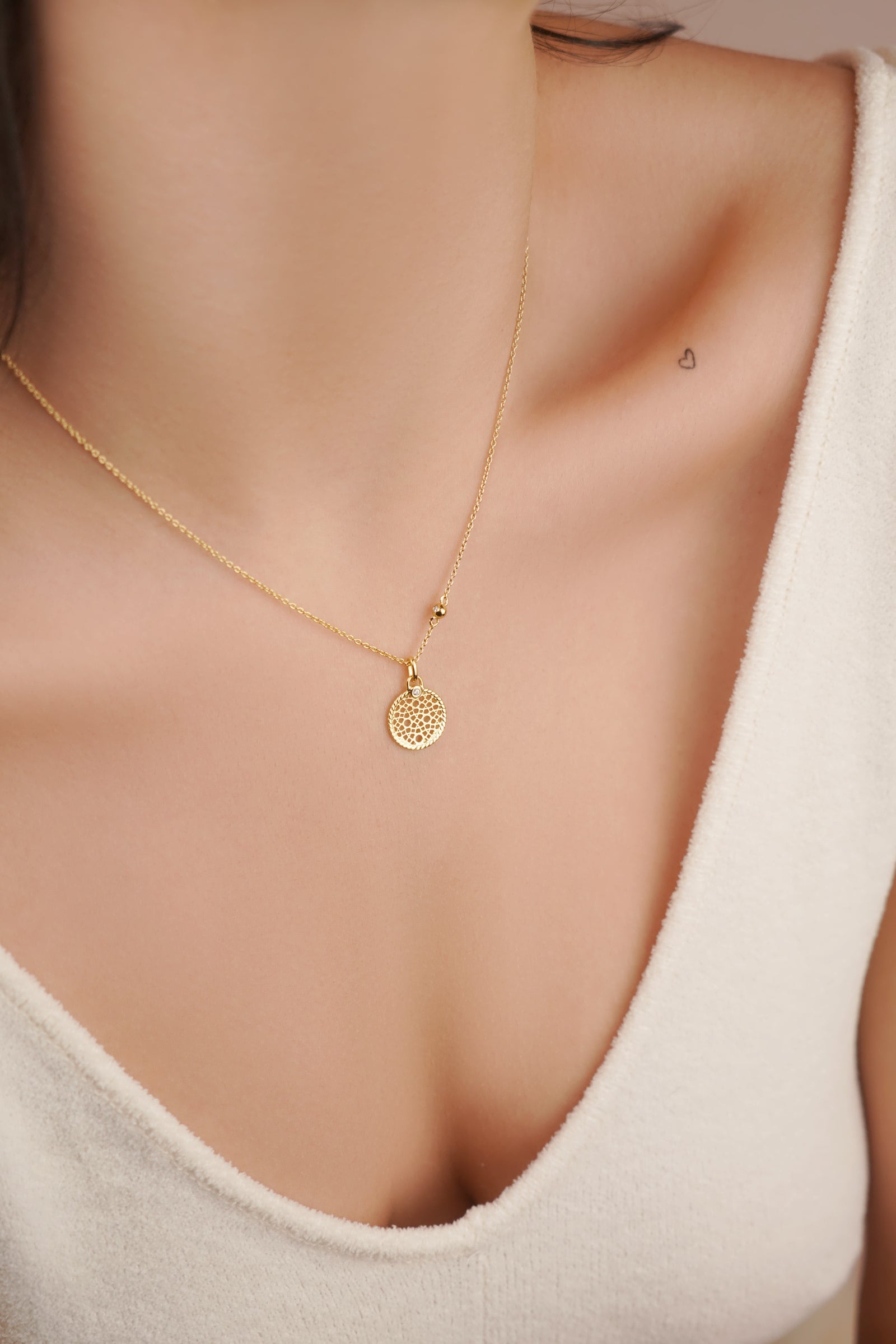The shiny, gold-plated coins lie elegantly on the cleavage and make our Rialto necklace a real statement piece.