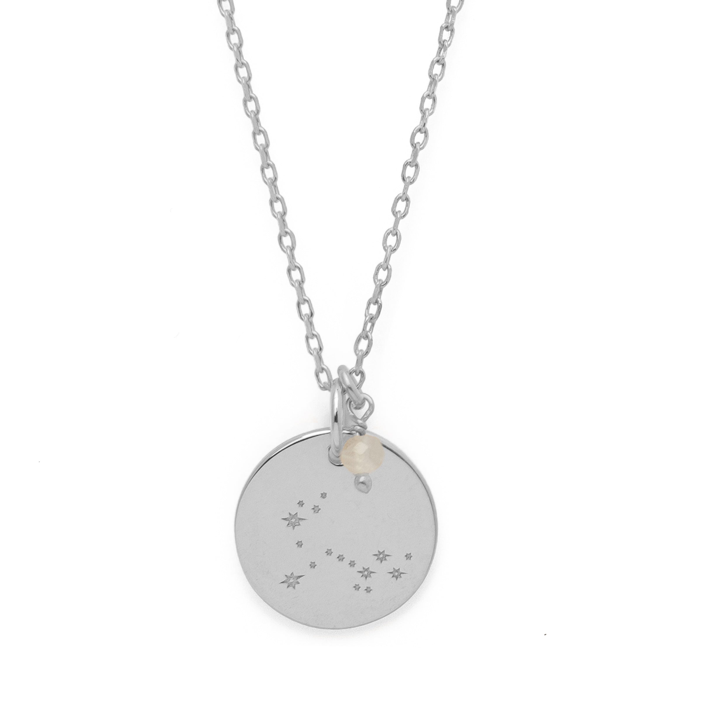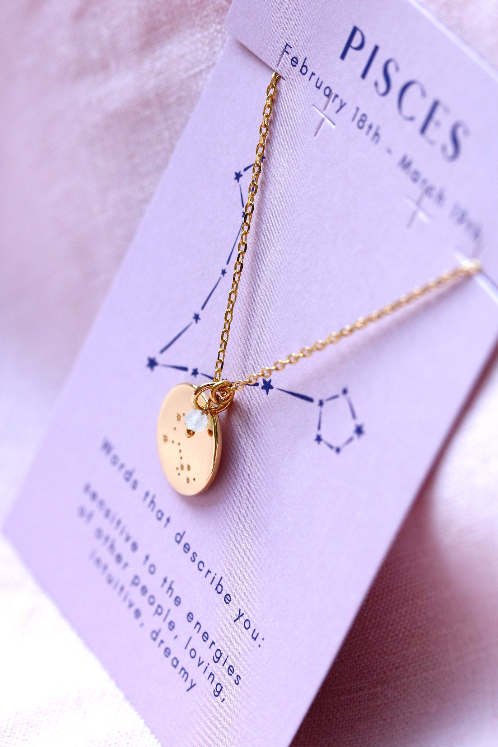 The 1,3 cm high-polished disk pendant shows the star constellation of the zodiacs sign. Attached is a circular birthstone that measures 2-3 mm. The chain made of 18k gold-plated 925
