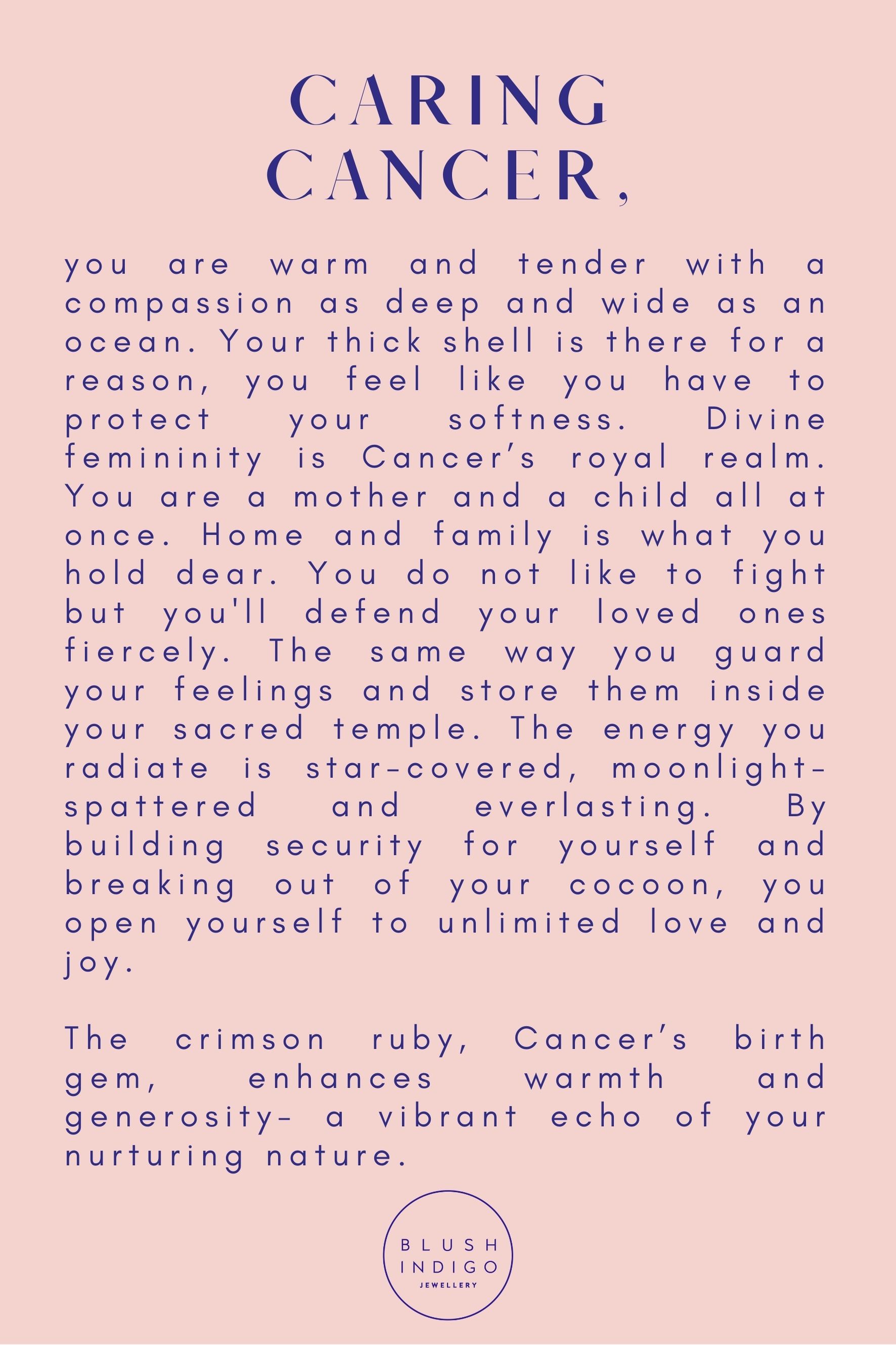 Words that describe you: nurturing, limitlessly caring, domestic, sensitive, emotional and protective. Your birthstone, a pink Ruby, stands for love, passion and generosity.