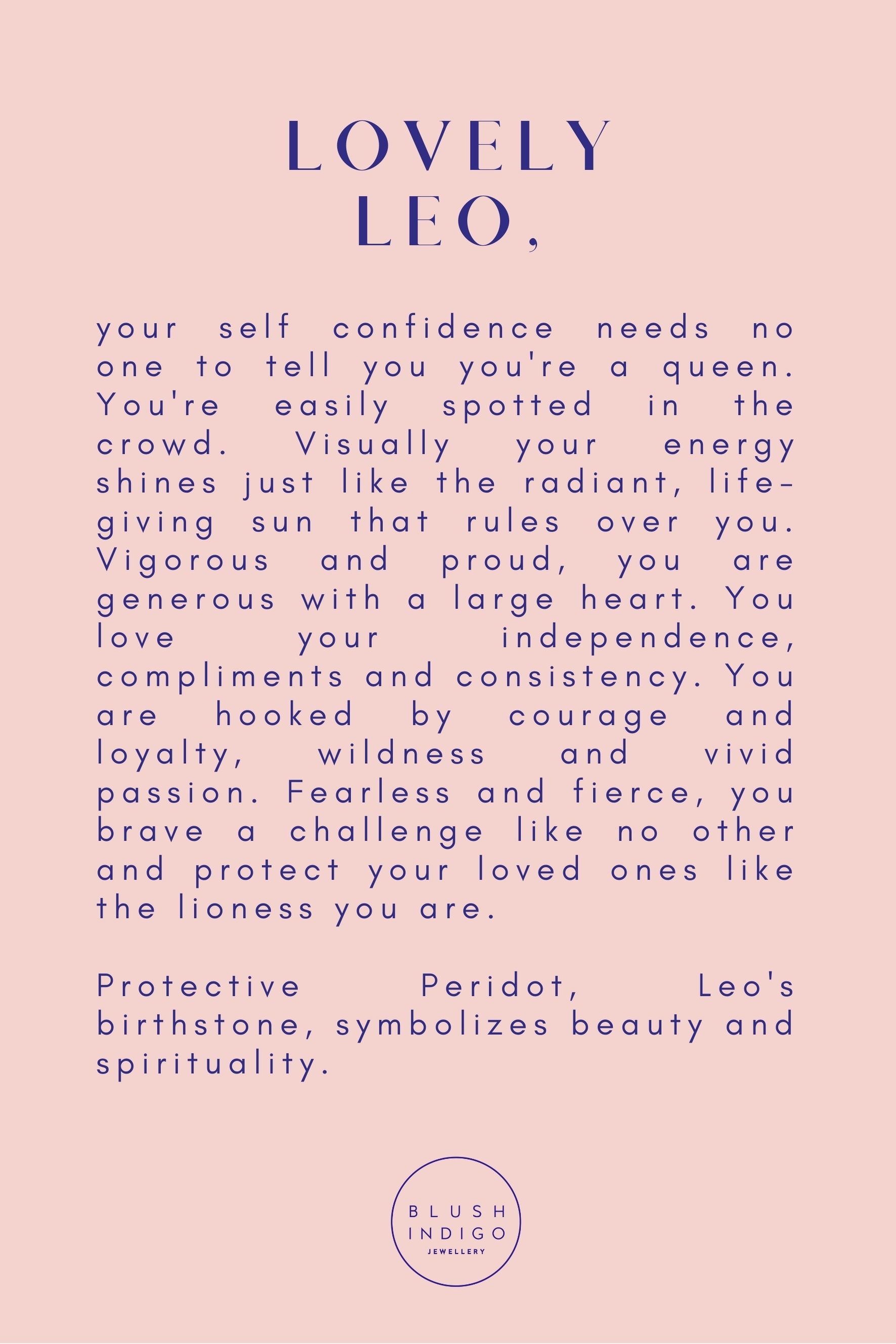 creative, enthusiastic, proud, confident, fearless, a born leader. Your signs stone, the light green Peridot, stands for happiness, love, and protection.