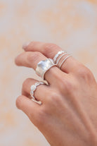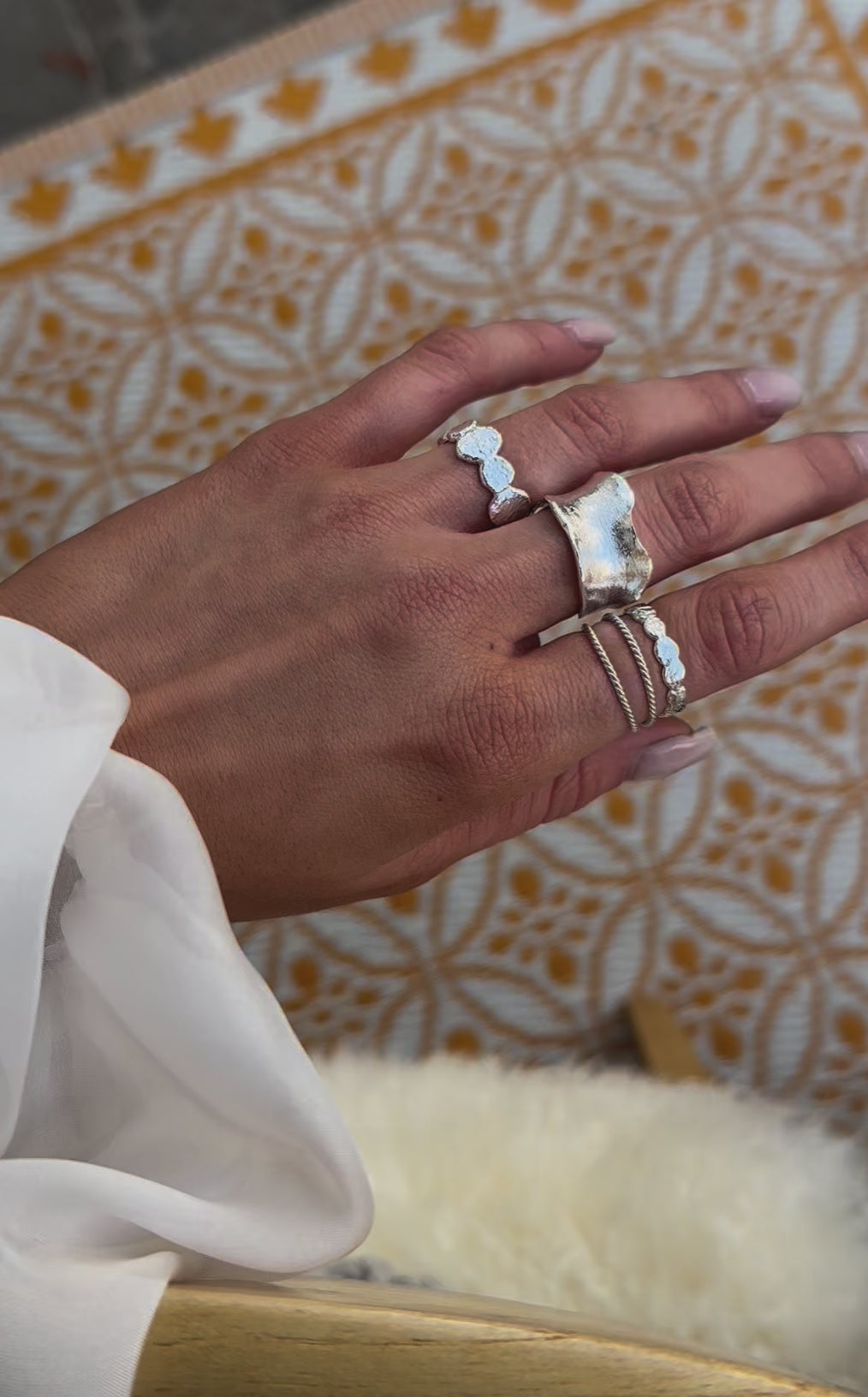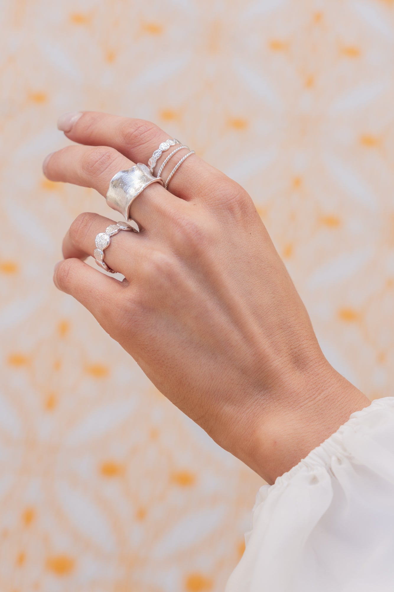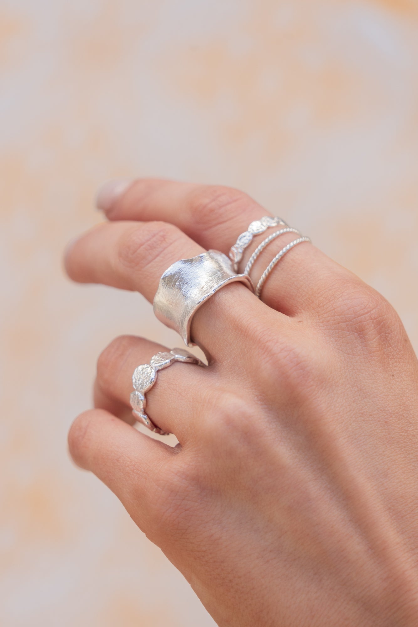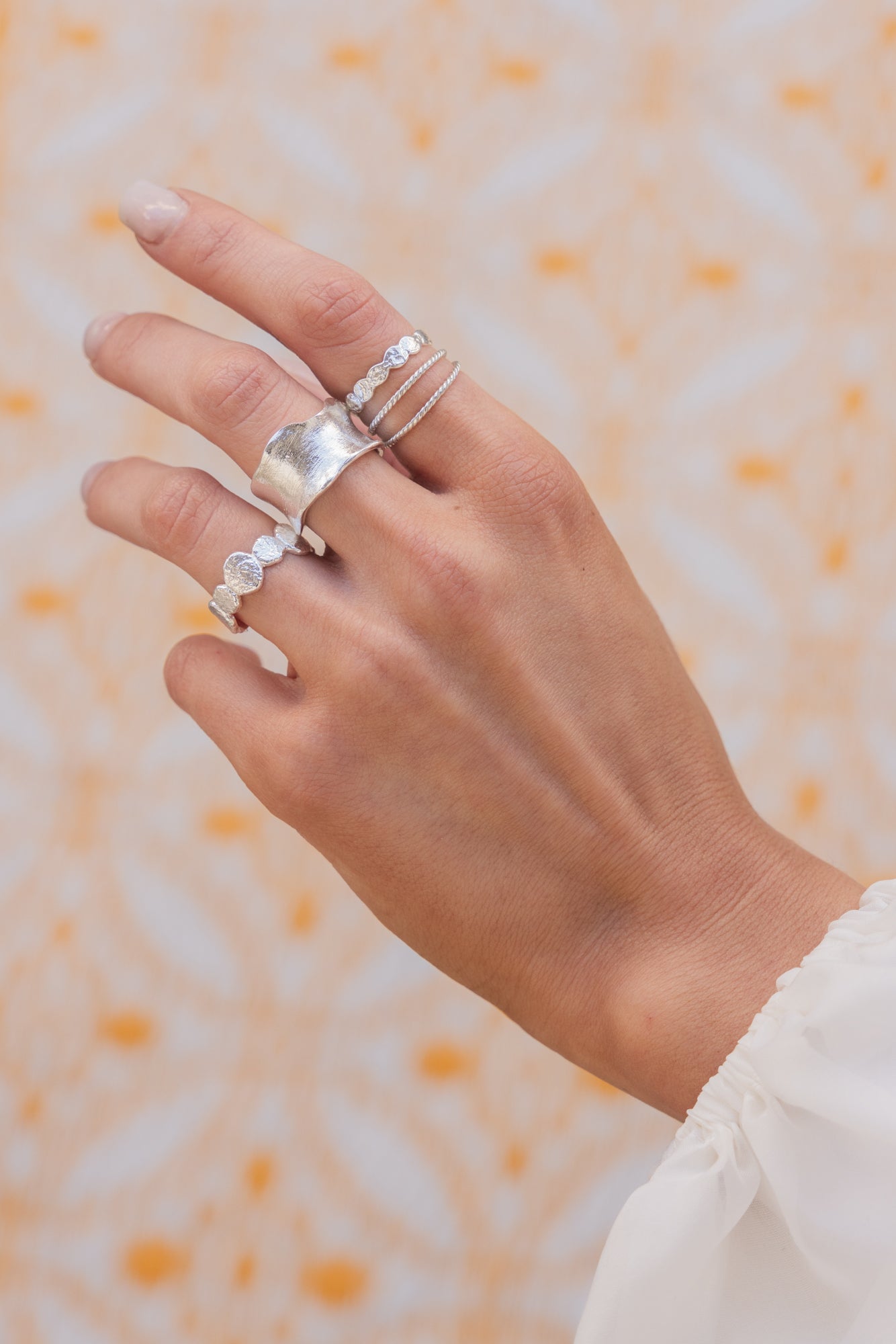 The Duo Twist ring, made of 925 silver, consists of two soldered rings in a twisted look. The distance between the two rings can be increased or decreased to suit your taste, so the gap can be smaller or larger. It's up to you. We also love this ring stacked with our Trio ring. This way, it looks as if you're stacking five rings on top of each other.