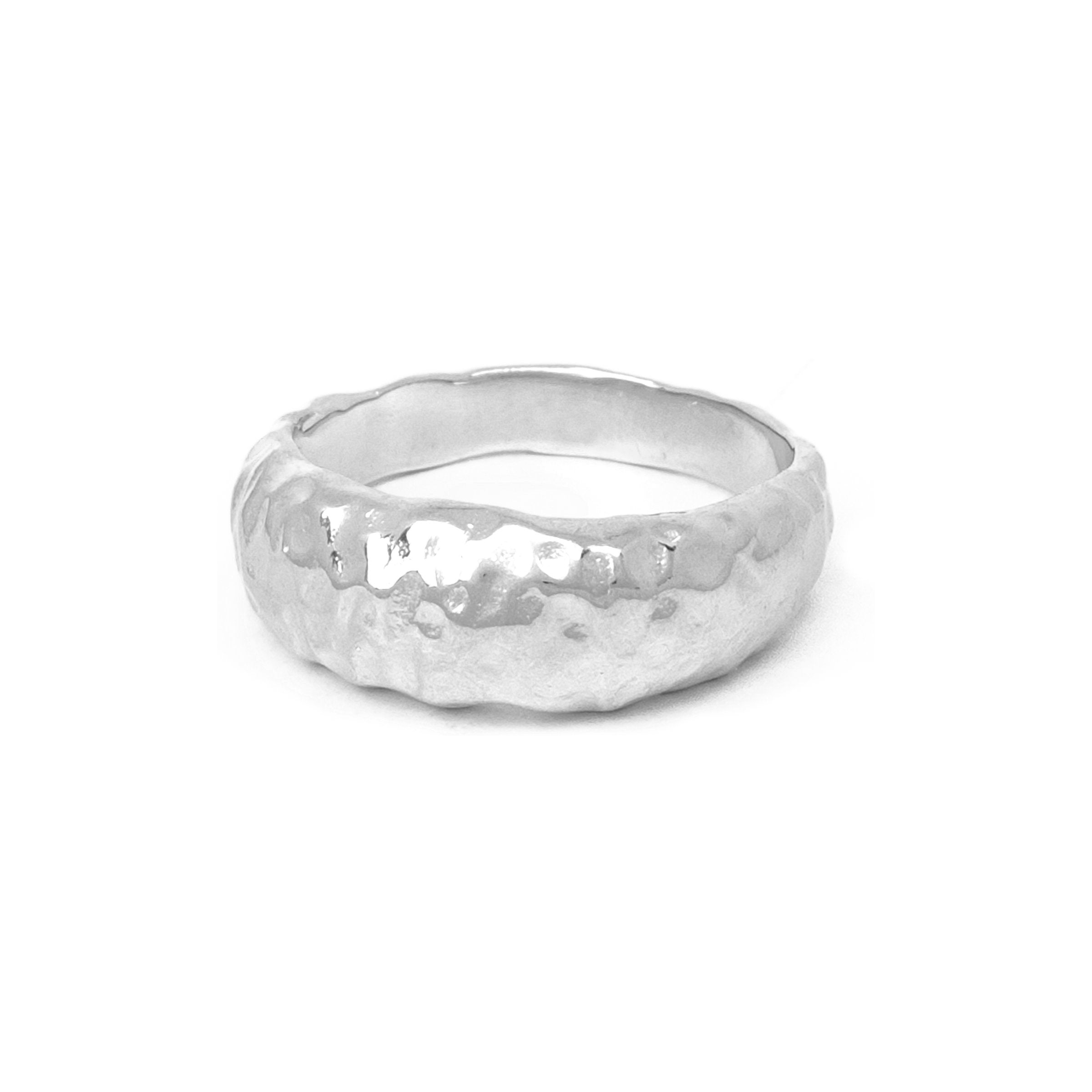 The solid Monte Kali ring, crafted from 925 silver, impresses with its simple elegance and hammered finish. The curved band resembles a hill. It measures 8 mm at its widest point and 4 mm at its narrowest point.