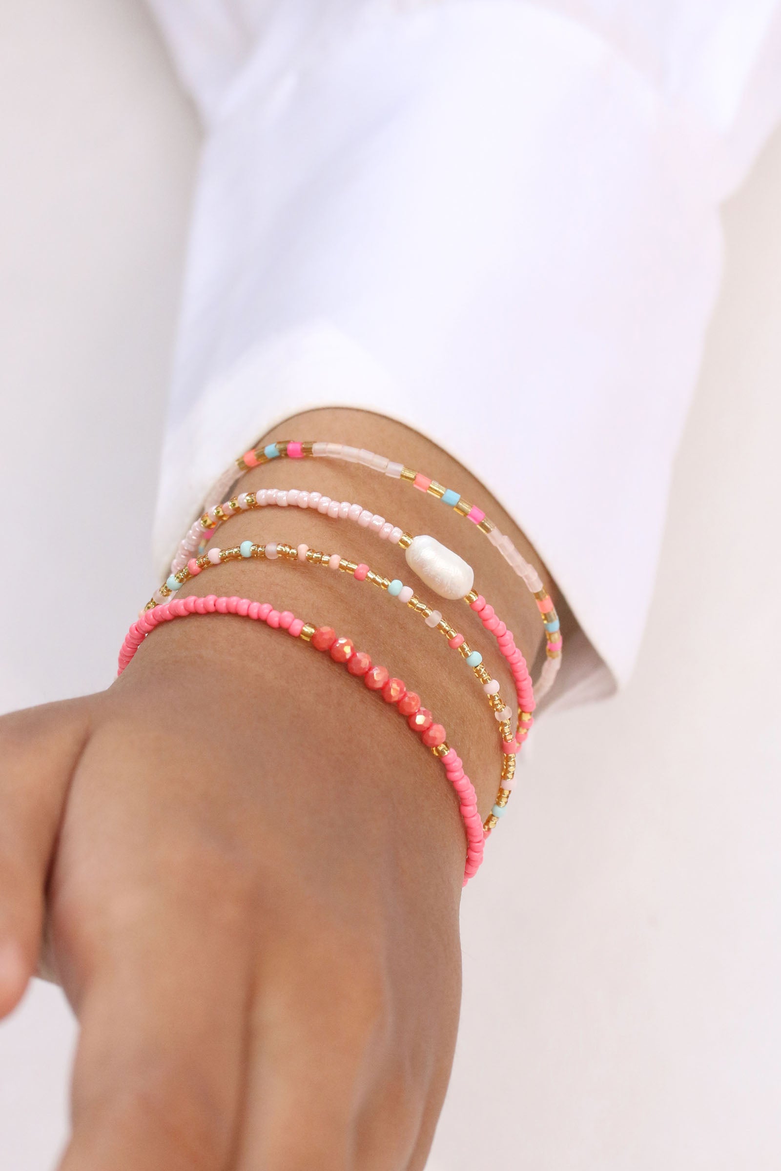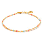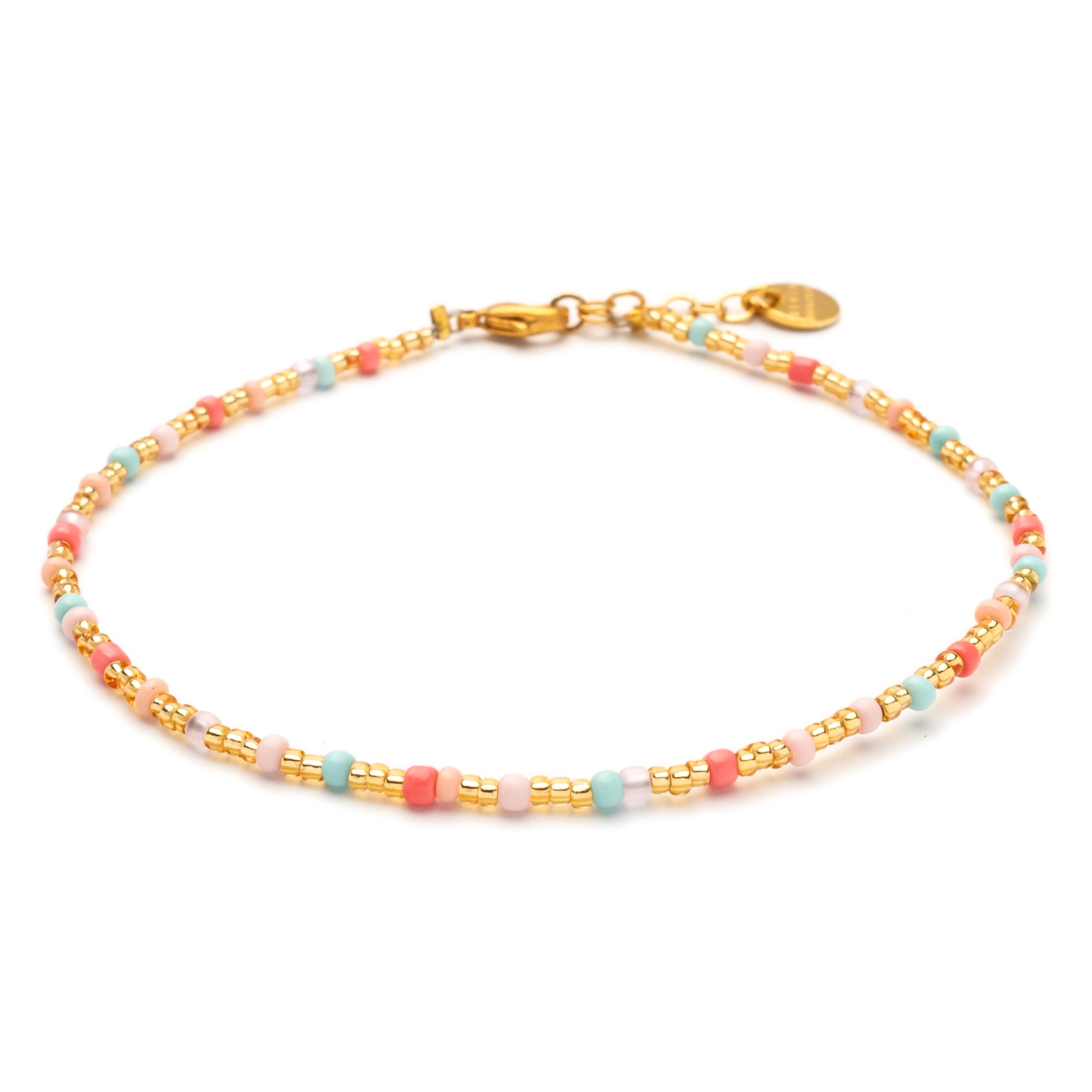 The colors of our Be-Blush-Rhodes bracelet shine in soft neon tones. In addition to coral, light blue and blush rose, gold roccailles beads add elegant accents. The Rhodes series includes other bracelets, anklets and a necklace.