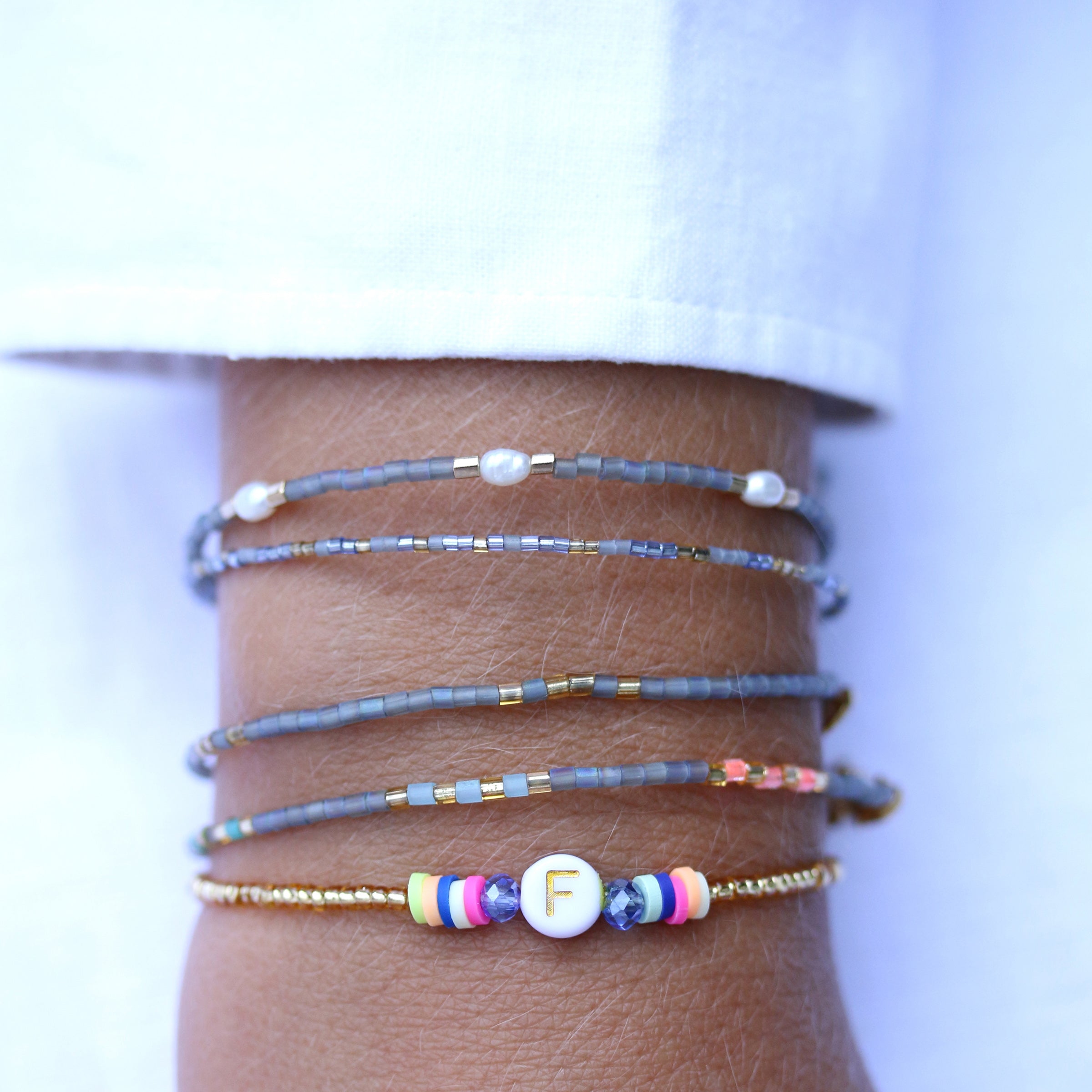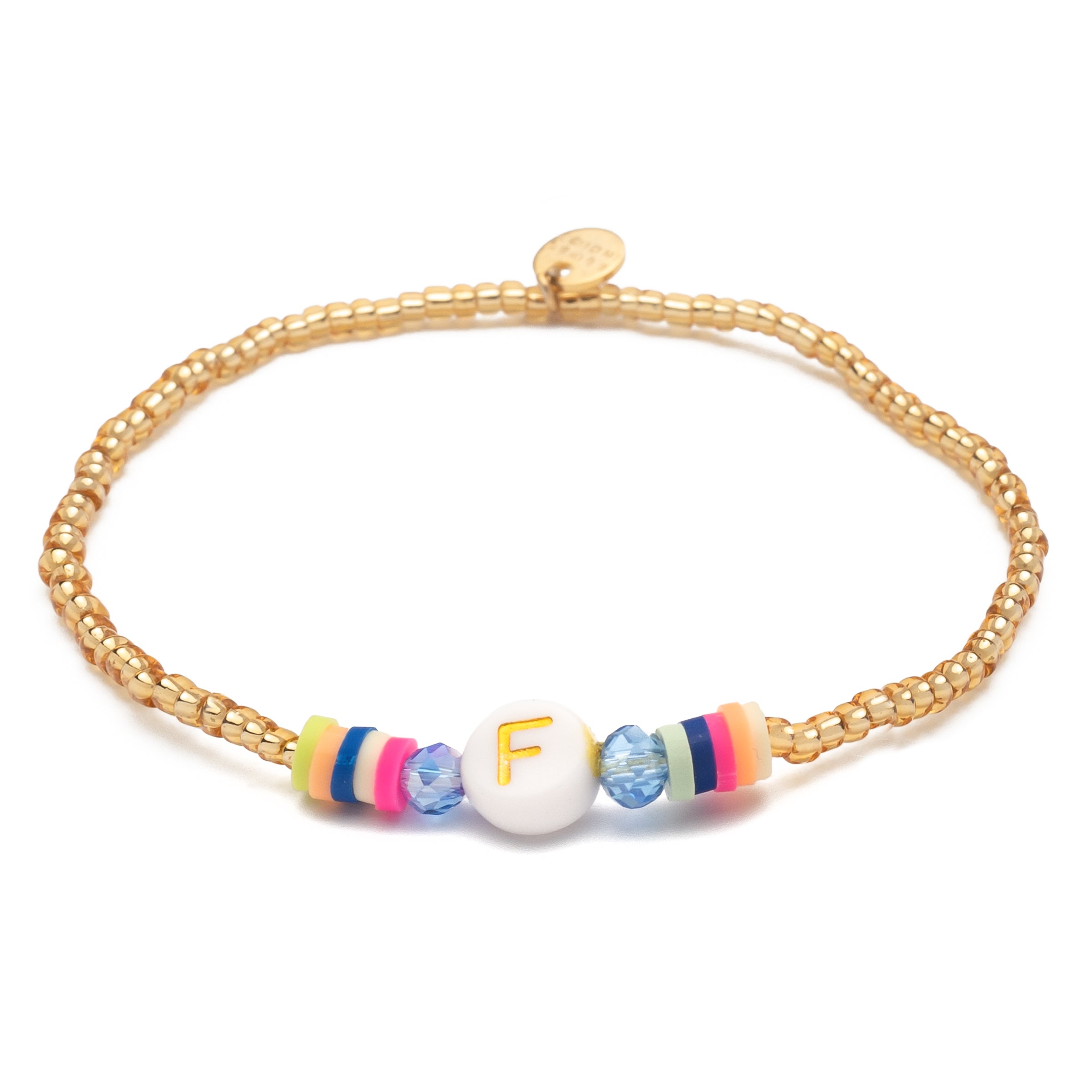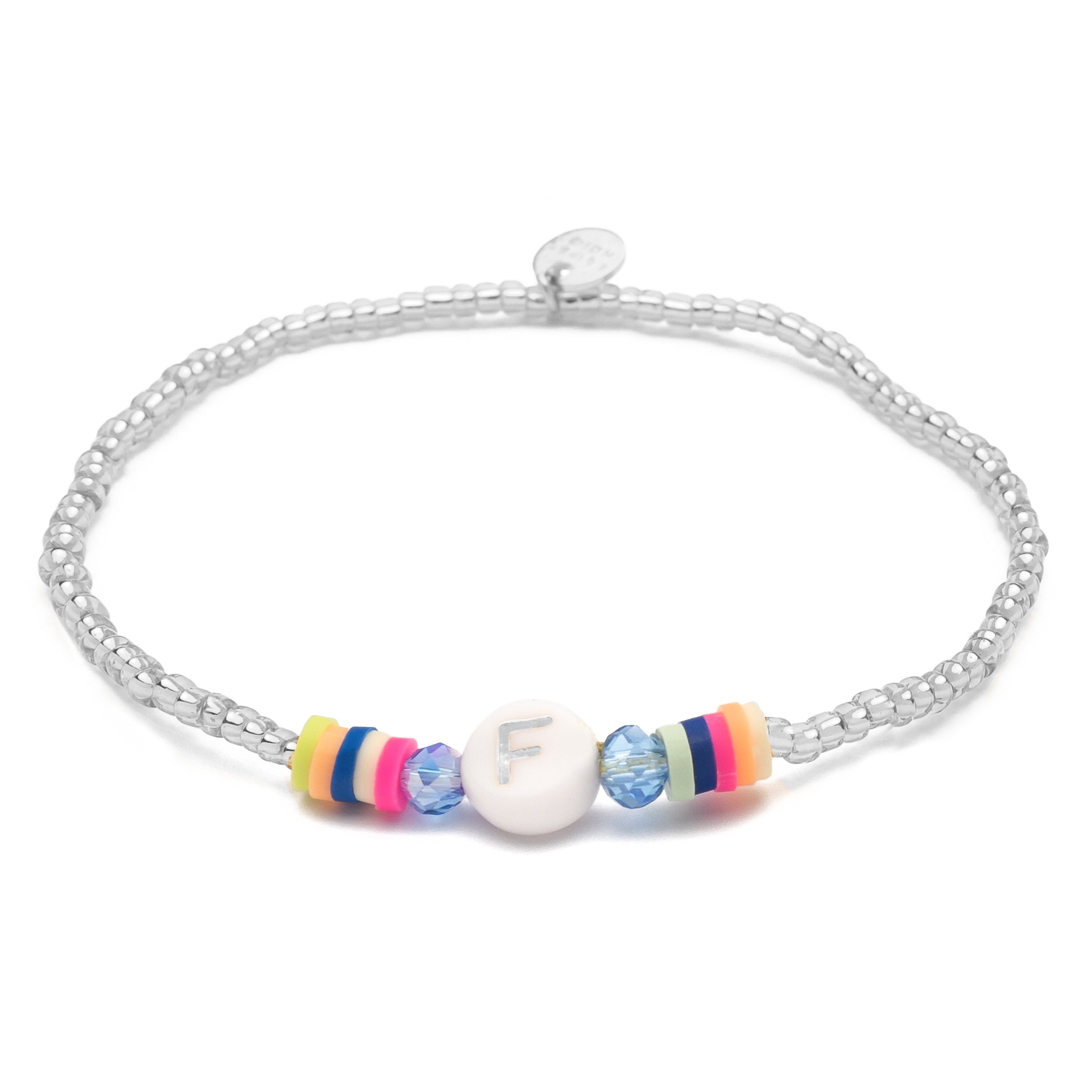 For all the Fannys, Friedas and fabulous friends ... The ribbon from our Candy series is not only cute to nibble on, the white pearl also celebrates your uniqueness or that of a loved one. Framing the letter are colourful crystal beads and colourful rubber Heishi Pearls.