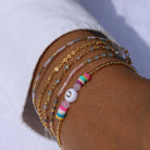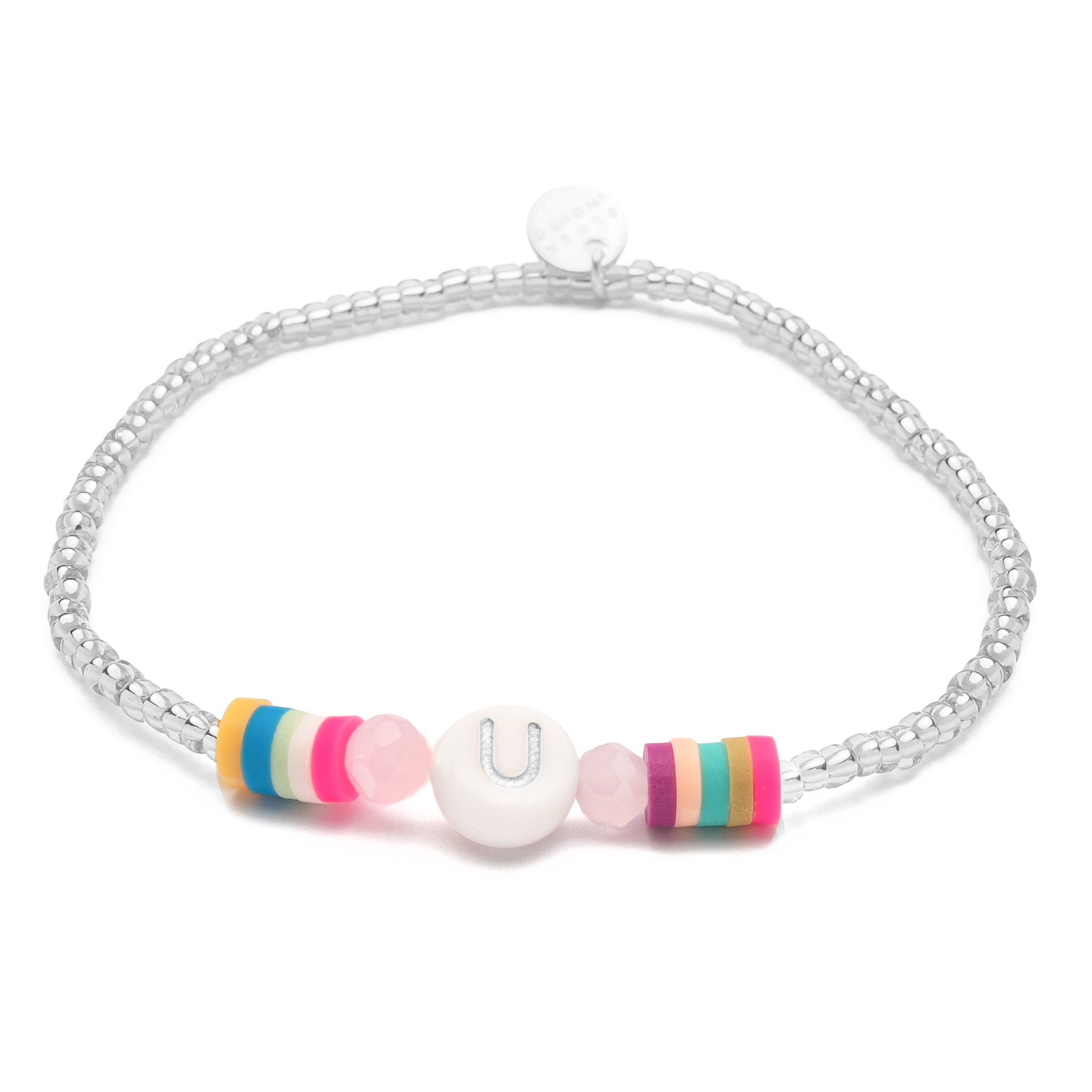 For all the Uschas, Umas and Ursulas ... The ribbon from our Candy series is not only cute to nibble on, the white pearl also celebrates your uniqueness or that of a loved one. Framing the letter are colourful crystal beads and colourful rubber Heishi Pearls.
