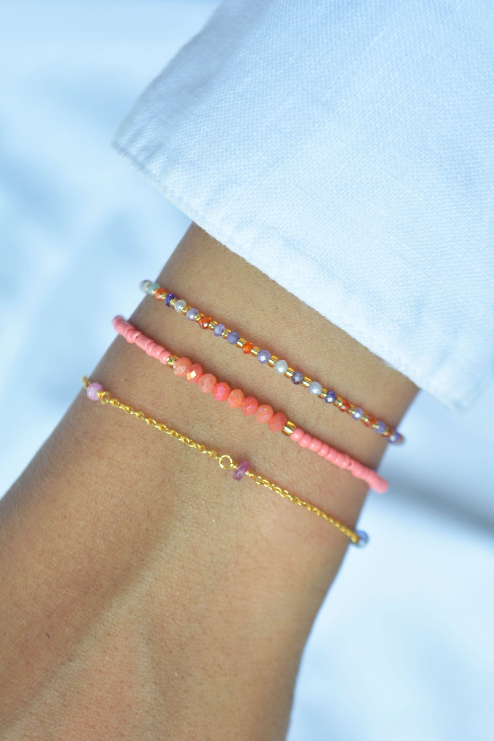 This also applies to the gold and silver beads. These are coated on the inside, so they will become duller over time due to wear on the jewelry wire. Please follow our care instructions below to ensure you can enjoy your jewelry for a long time.