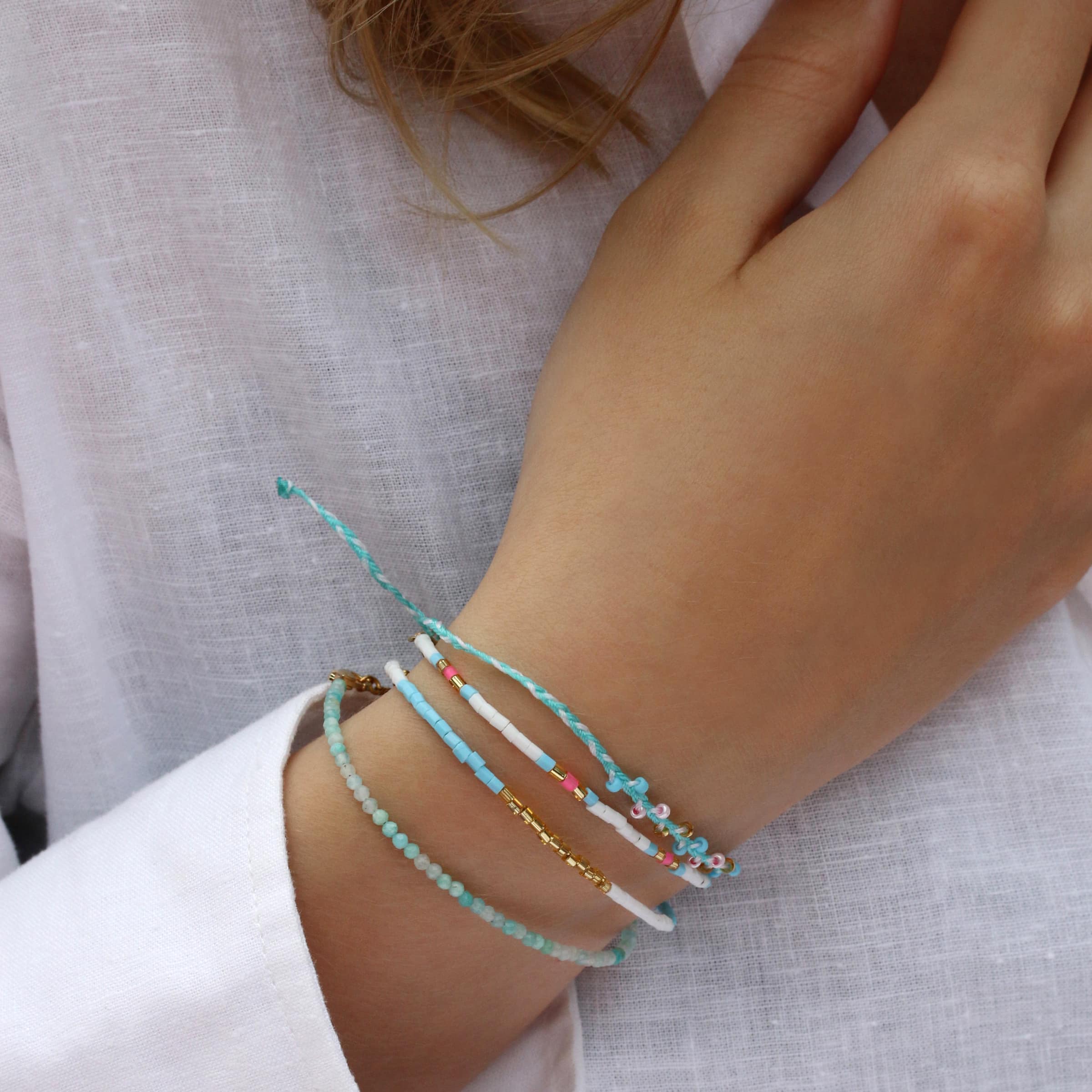 The Amazonite bracelet is approximately 16 cm long and can be extended by 2 cm. The semi-precious stones have a diameter of 1 mm. All metal parts used are made of 18k gold-plated or silver-rhodium-plated brass.
